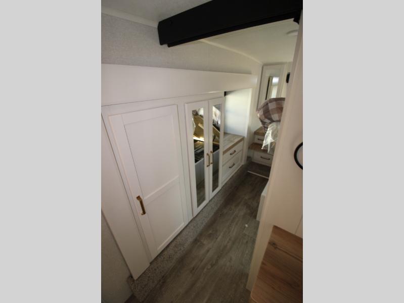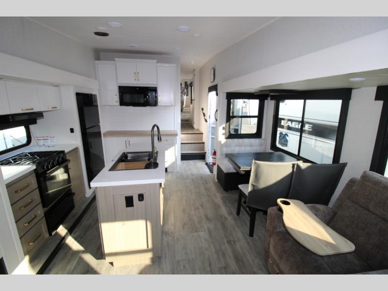 With any Eagle HT fifth wheel or travel trailer by Jayco you will enjoy a smooth drive thanks to the 4 Star Handling Package and MORryde CRE-3000 rubberized suspension. The Customer Value Package includes amenities that are sure to make camping easier than ever, like the 60K on-demand water heater, Keyed-Alike lock system, 15,000 BTU "Whisper Quiet" A/C, and more. Handcrafted door/drawer fronts will make your space feel more like home, along with residential vinyl flooring throughout, GE appliances, and blackout roller shades with reflective side throughout to keep the sun out when you want to sleep in. Each model also includes a NuVo H2O water treatment system with filters included, interior and exterior "Blue Sync" audio connect with MB Quart Sound for your TV and phone, and 100% no floor vents for added comfort and convenience!