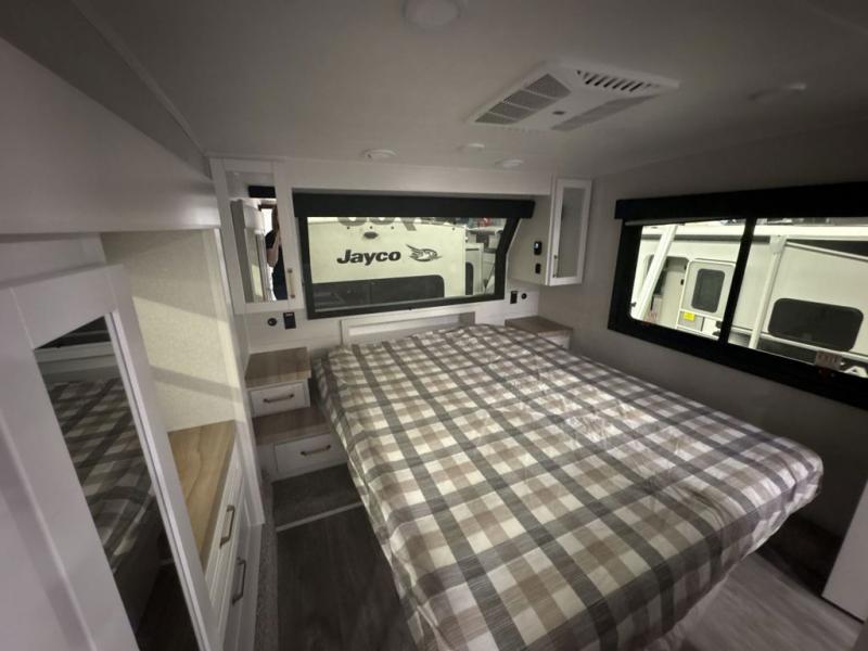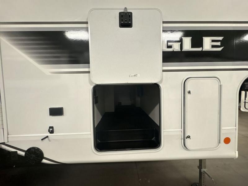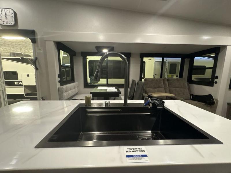 With any Eagle HT fifth wheel or travel trailer by Jayco you will enjoy a smooth drive thanks to the 4 Star Handling Package and MORryde CRE-3000 rubberized suspension. The Customer Value Package includes amenities that are sure to make camping easier than ever, like the 60K on-demand water heater, Keyed-Alike lock system, 15,000 BTU "Whisper Quiet" A/C, and more. Handcrafted door/drawer fronts will make your space feel more like home, along with residential vinyl flooring throughout, GE appliances, and blackout roller shades with reflective side throughout to keep the sun out when you want to sleep in. Each model also includes a NuVo H2O water treatment system with filters included, interior and exterior "Blue Sync" audio connect with MB Quart Sound for your TV and phone, and 100% no floor vents for added comfort and convenience!