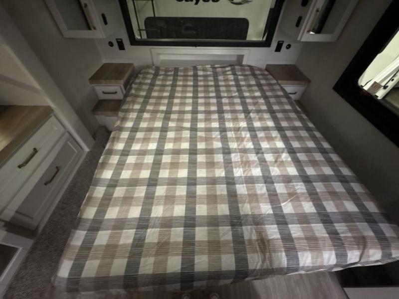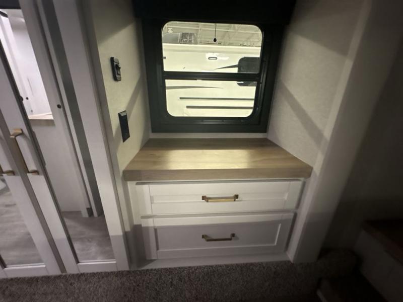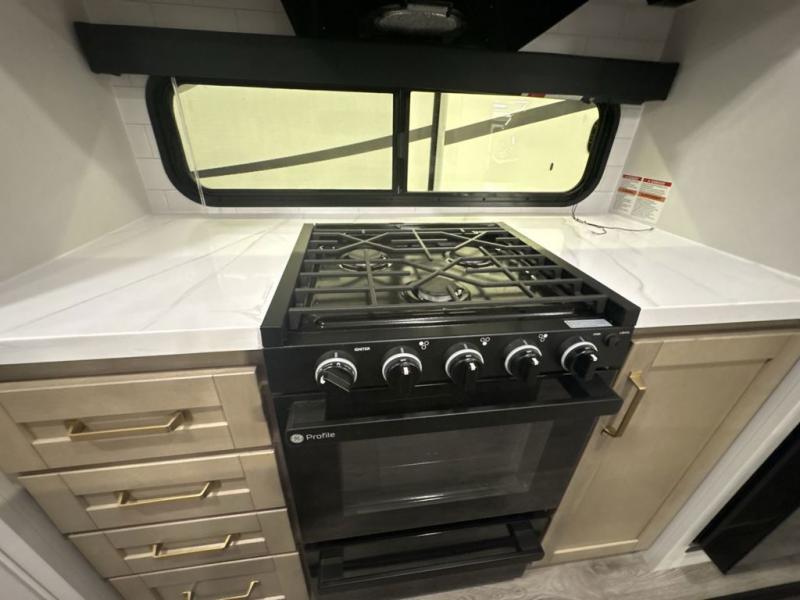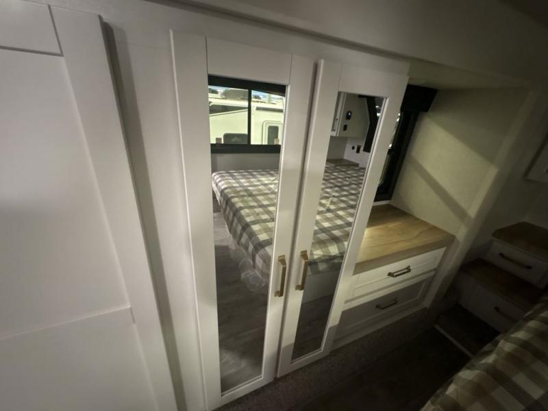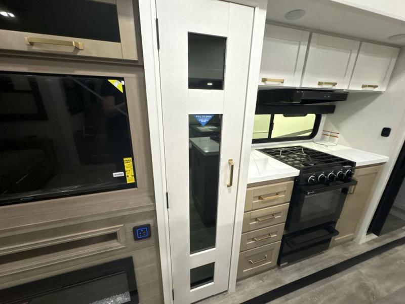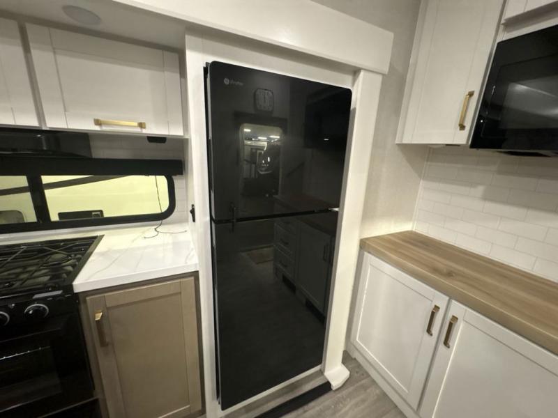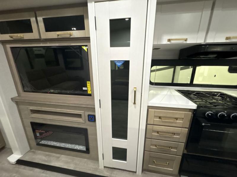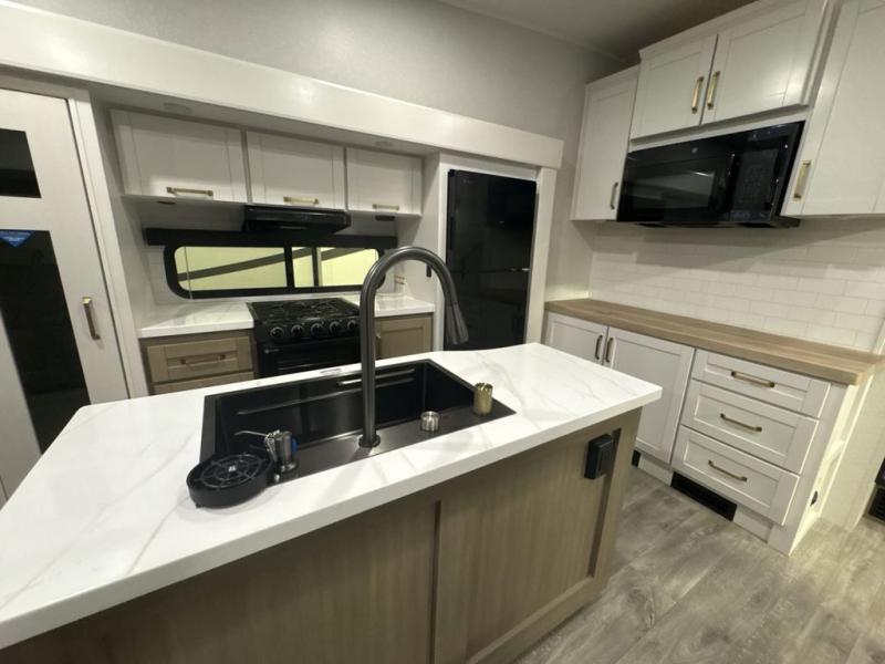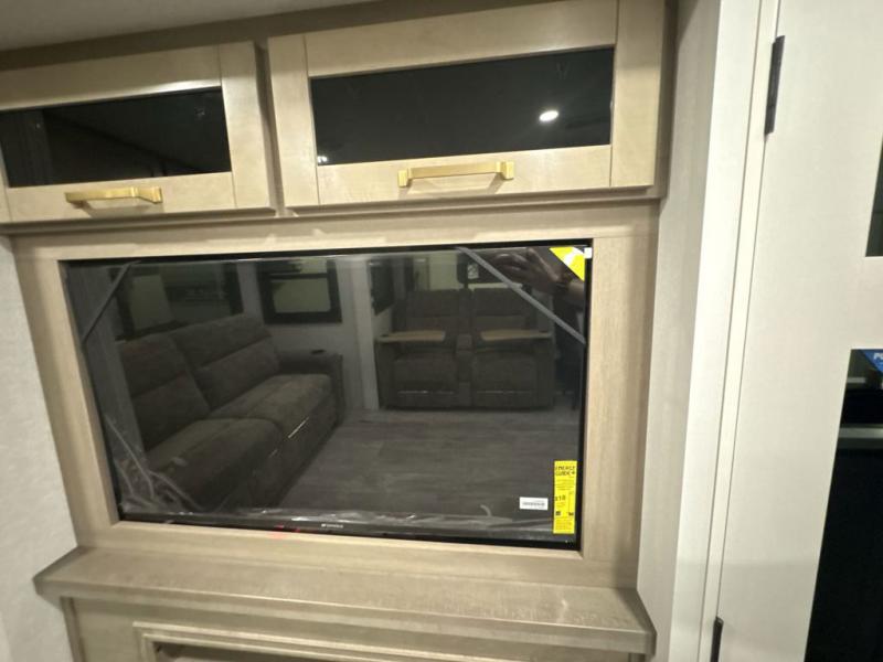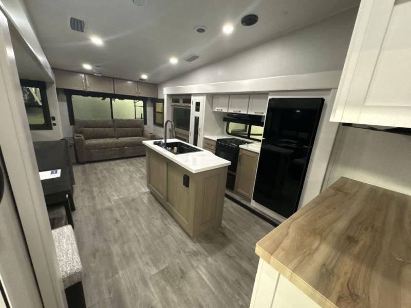 Pack your bags and head off on adventure in this spacious fifth wheel for four! The dual opposing slides in the kitchen and main living area will give your crew more space to relax. Speaking of relaxing, there is a theater seat across from the fireplace and TV plus a tri-fold sofa to make it a movie night. This unit includes a kitchen island with an All-In-One sink for easy cleaning, a hutch with added storage, plus a GE 10 cu. ft. 12V refrigerator. The front master bedroom includes an Olympic queen bed, dual wardrobes plus a third wardrobe within the bedroom slide out, and TV prep if you want the option to watch a show in bed!