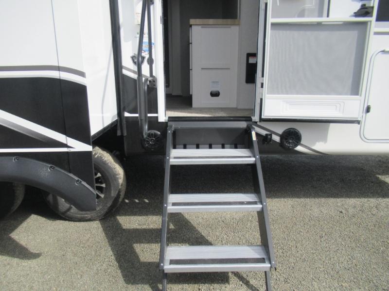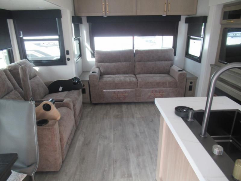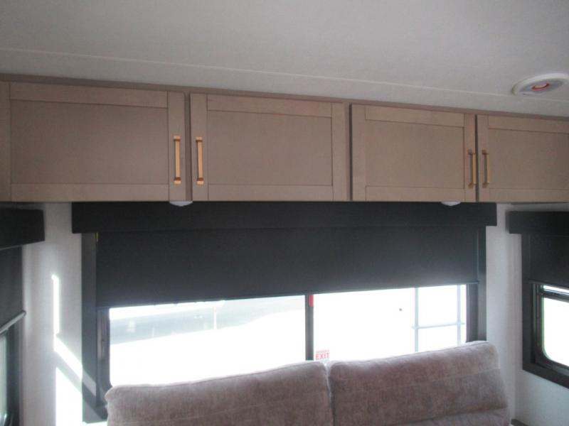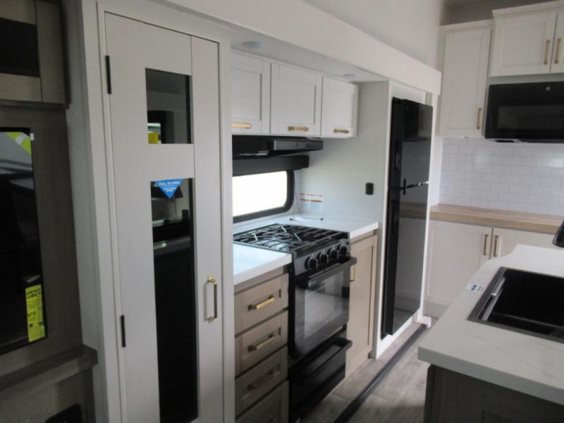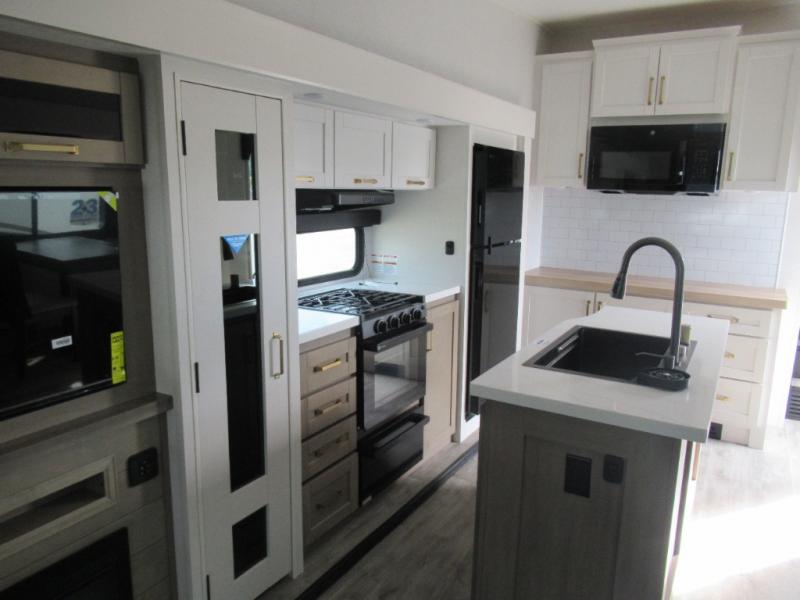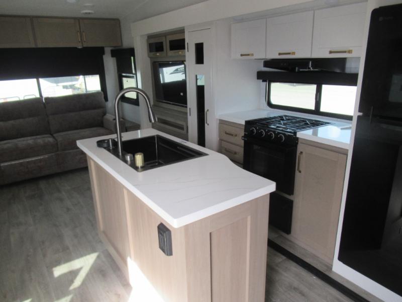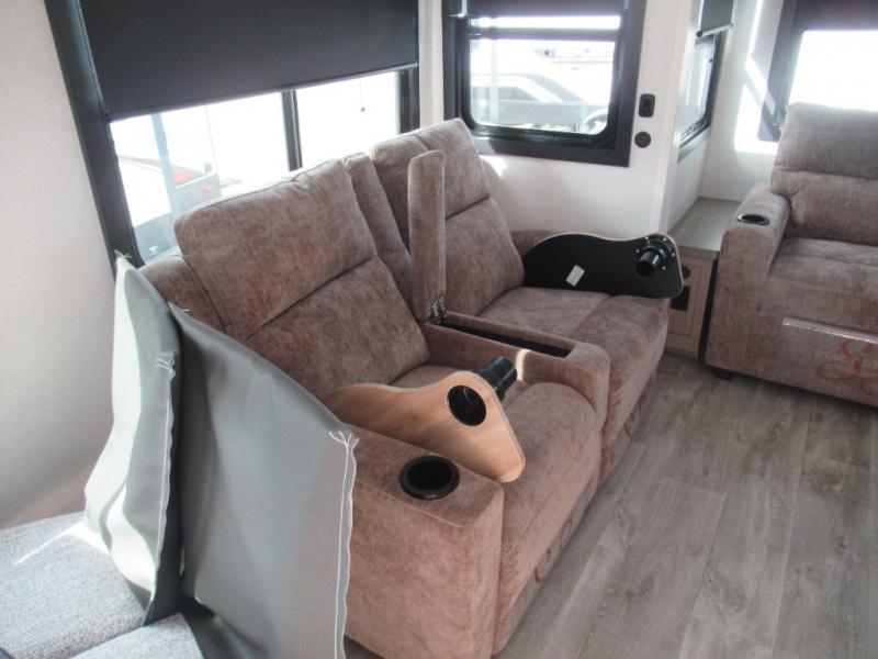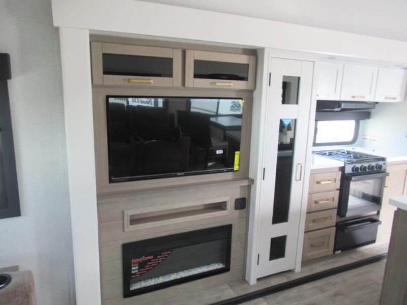Pack your bags and head off on adventure in this spacious fifth wheel for four! The dual opposing slides in the kitchen and main living area will give your crew more space to relax. Speaking of relaxing, there is a theater seat across from the fireplace and TV plus a tri-fold sofa to make it a movie night. This unit includes a kitchen island with an All-In-One sink for easy cleaning, a hutch with added storage, plus a GE 10 cu. ft. 12V refrigerator. The front master bedroom includes an Olympic queen bed, dual wardrobes plus a third wardrobe within the bedroom slide out, and TV prep if you want the option to watch a show in bed!