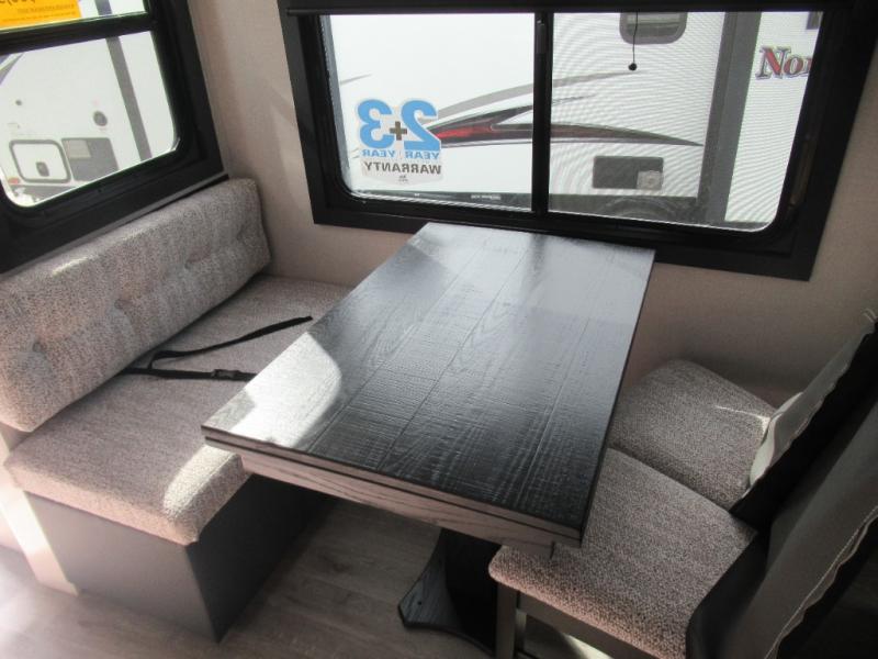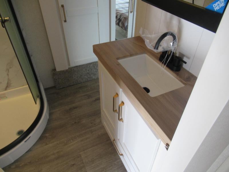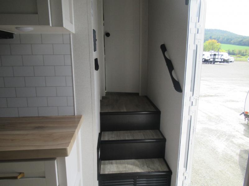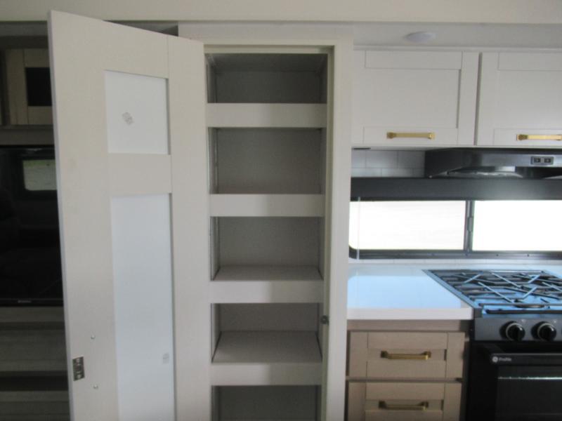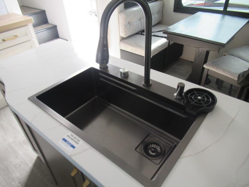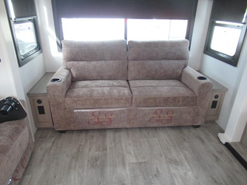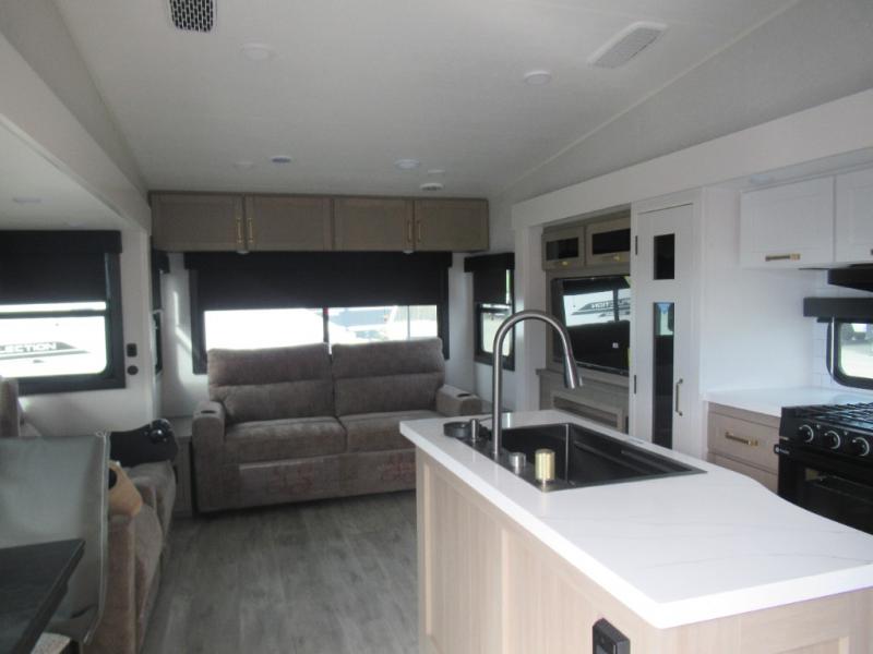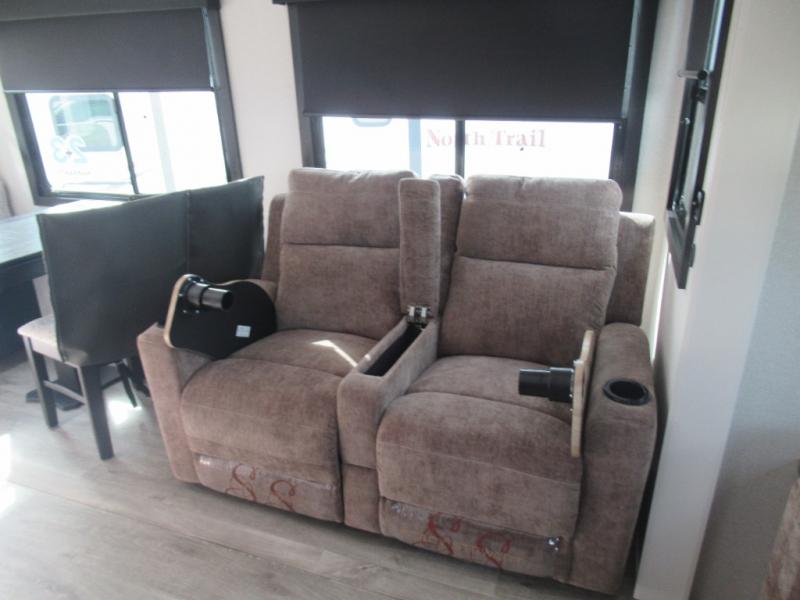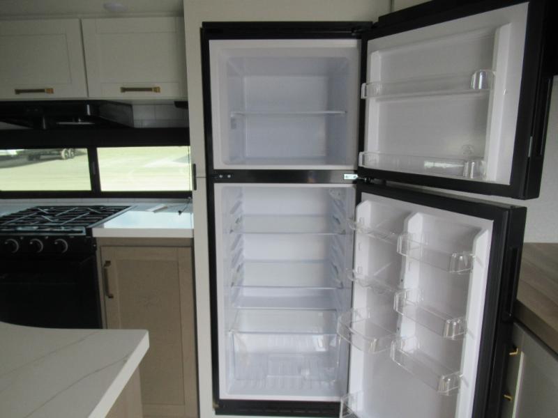 Pack your bags and head off on adventure in this spacious fifth wheel for four! The dual opposing slides in the kitchen and main living area will give your crew more space to relax. Speaking of relaxing, there is a theater seat across from the fireplace and TV plus a tri-fold sofa to make it a movie night. This unit includes a kitchen island with an All-In-One sink for easy cleaning, a hutch with added storage, plus a GE 10 cu. ft. 12V refrigerator. The front master bedroom includes an Olympic queen bed, dual wardrobes plus a third wardrobe within the bedroom slide out, and TV prep if you want the option to watch a show in bed!