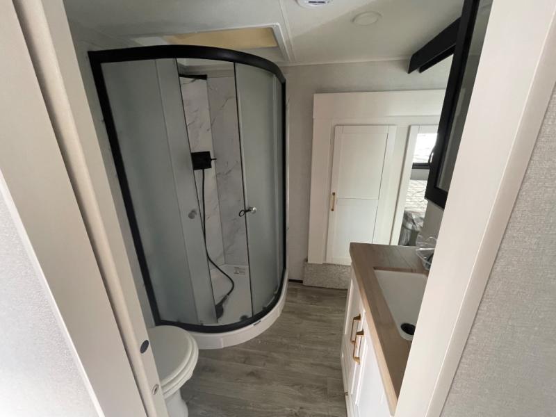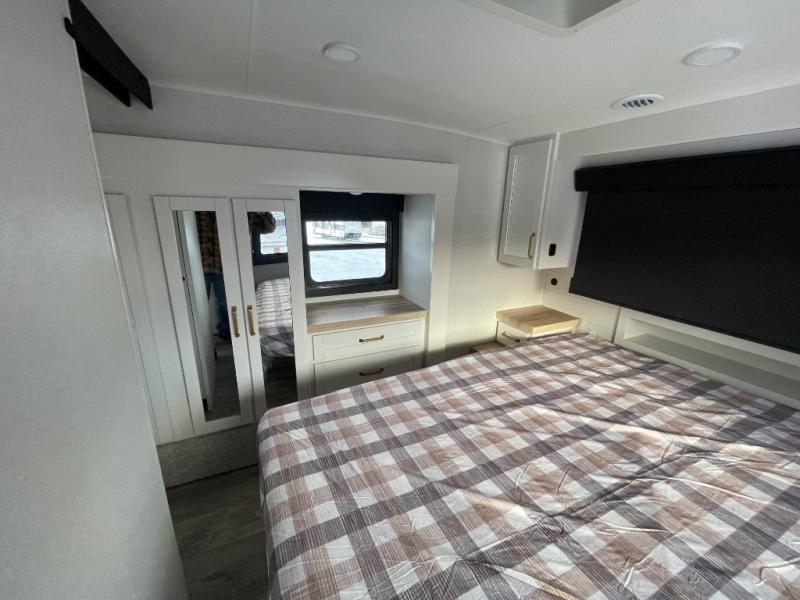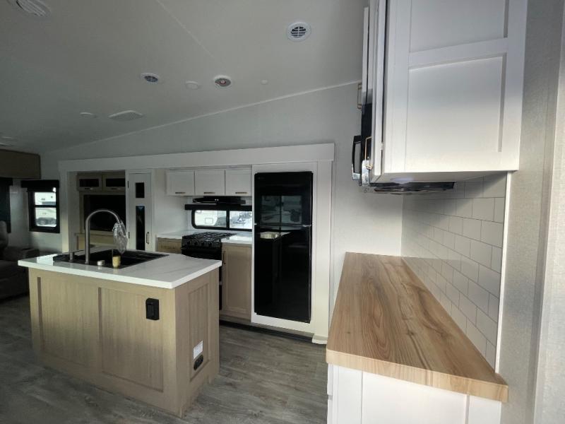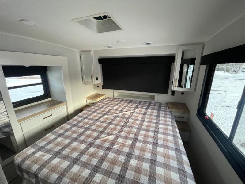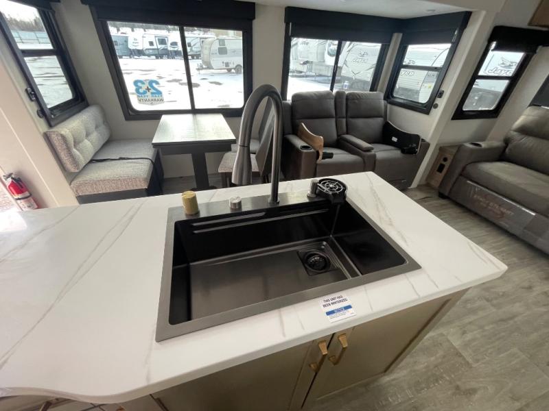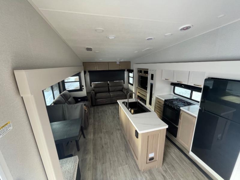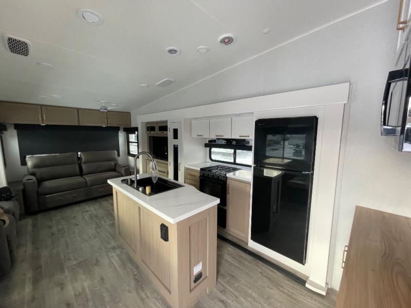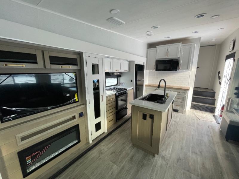 Pack your bags and head off on adventure in this spacious fifth wheel for four! The dual opposing slides in the kitchen and main living area will give your crew more space to relax. Speaking of relaxing, there is a theater seat across from the fireplace and TV plus a tri-fold sofa to make it a movie night. This unit includes a kitchen island with an All-In-One sink for easy cleaning, a hutch with added storage, plus a GE 10 cu. ft. 12V refrigerator. The front master bedroom includes an Olympic queen bed, dual wardrobes plus a third wardrobe within the bedroom slide out, and TV prep if you want the option to watch a show in bed!