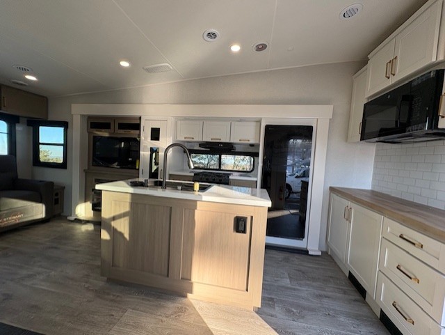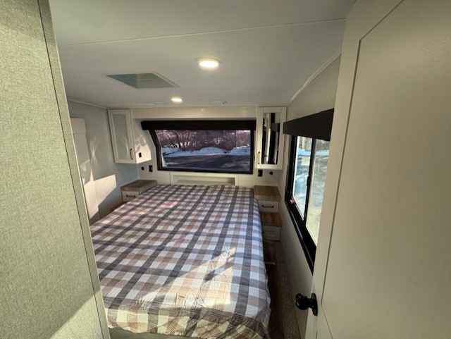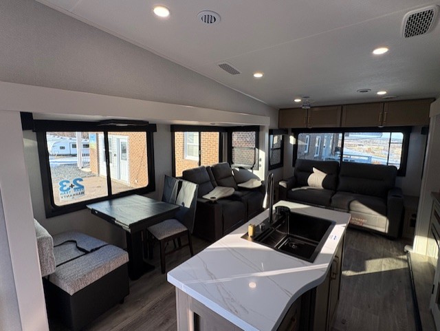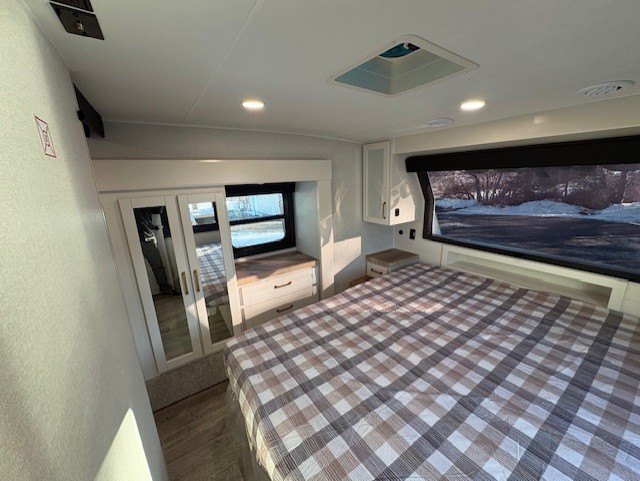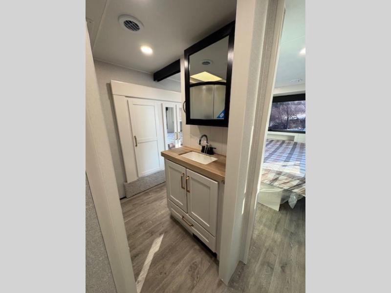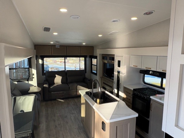 Pack your bags and head off on adventure in this spacious fifth wheel for four! The dual opposing slides in the kitchen and main living area will give your crew more space to relax. Speaking of relaxing, there is a theater seat across from the fireplace and TV plus a tri-fold sofa to make it a movie night. This unit includes a kitchen island with an All-In-One sink for easy cleaning, a hutch with added storage, plus a GE 10 cu. ft. 12V refrigerator. The front master bedroom includes an Olympic queen bed, dual wardrobes plus a third wardrobe within the bedroom slide out, and TV prep if you want the option to watch a show in bed!