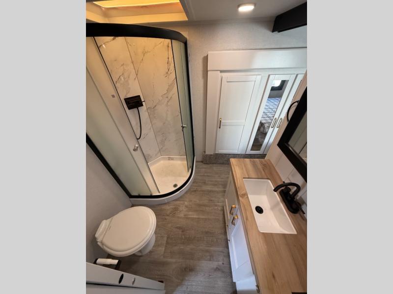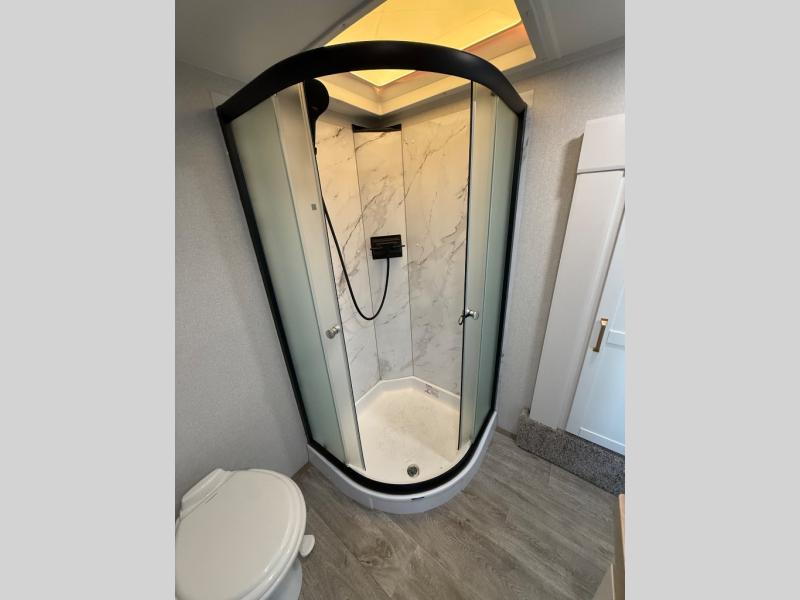 Step inside and you’re greeted by soft lighting, warm wood tones, and modern black stainless finishes. Imagine sipping coffee beside a glowing 5,000 BTU fireplace, while morning light spills through panoramic windows and a gentle breeze drifts through the cross-ventilated bedroom.