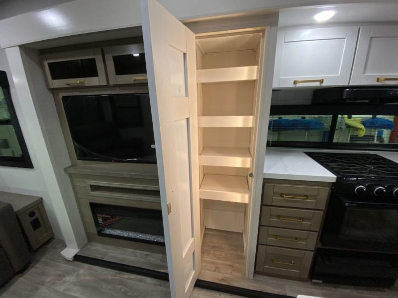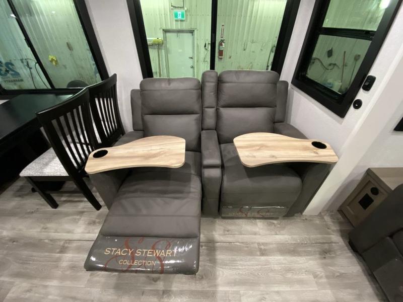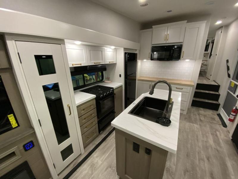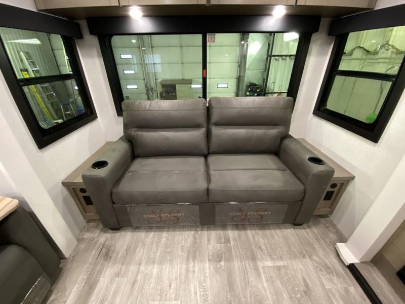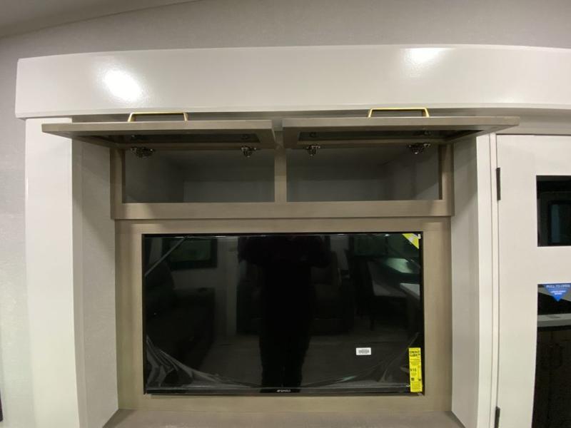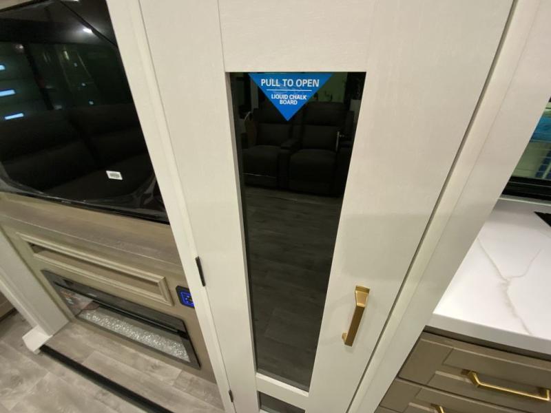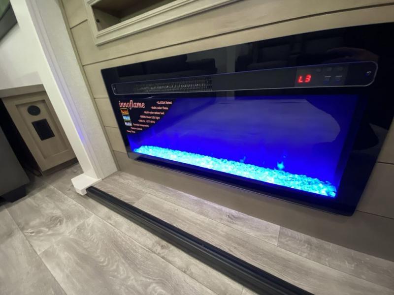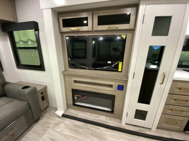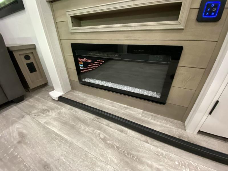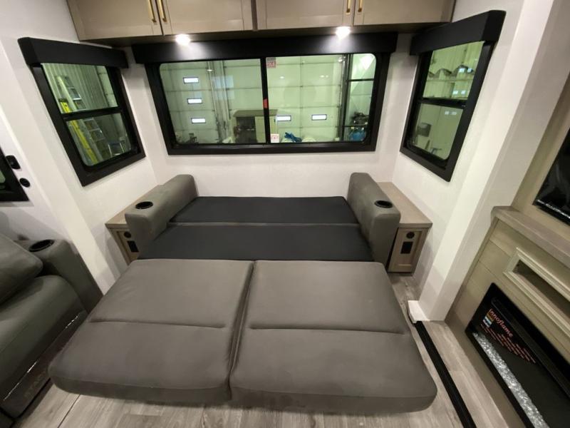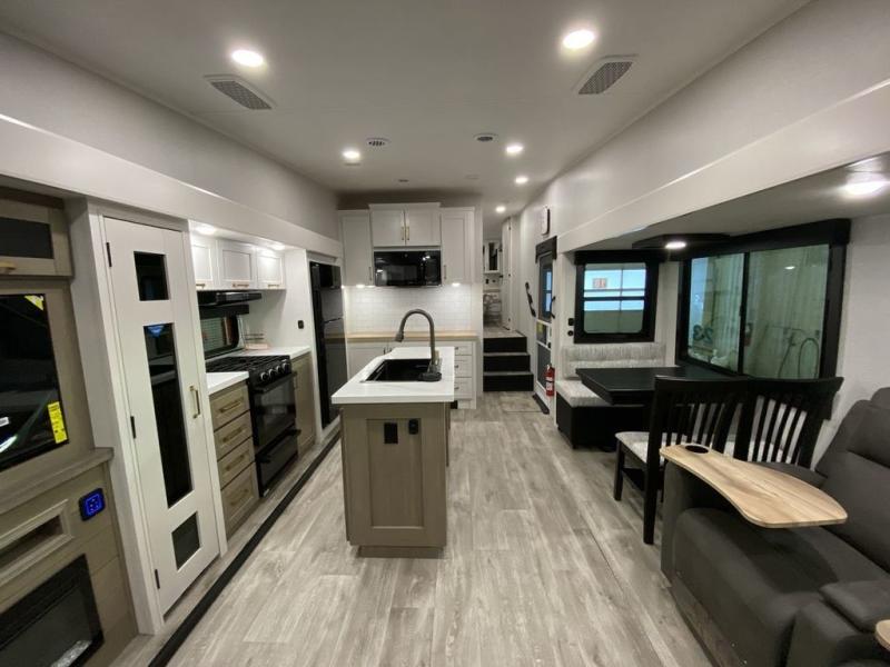 Pack your bags and head off on adventure in this spacious fifth wheel for four! The dual opposing slides in the kitchen and main living area will give your crew more space to relax. Speaking of relaxing, there is a theater seat across from the fireplace and TV plus a tri-fold sofa to make it a movie night. This unit includes a kitchen island with an All-In-One sink for easy cleaning, a hutch with added storage, plus a GE 10 cu. ft. 12V refrigerator. The front master bedroom includes an Olympic queen bed, dual wardrobes plus a third wardrobe within the bedroom slide out, and TV prep if you want the option to watch a show in bed!