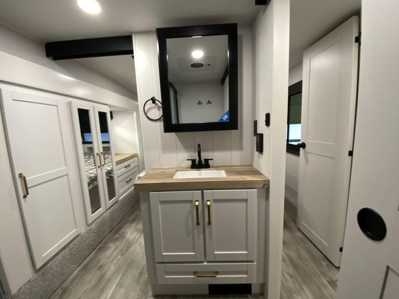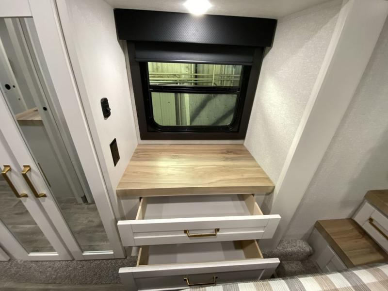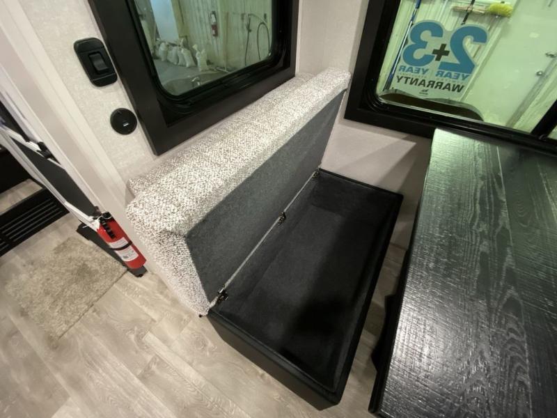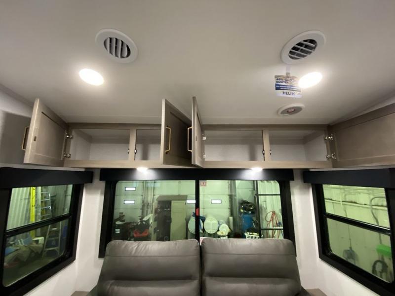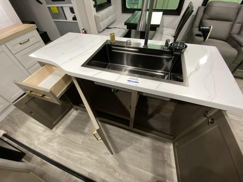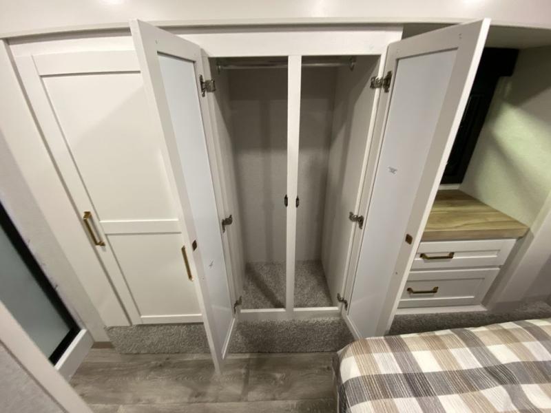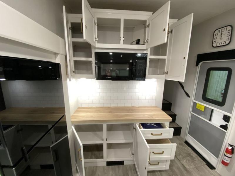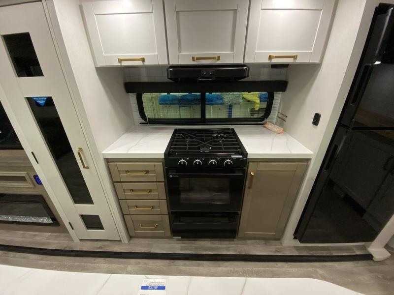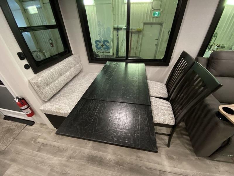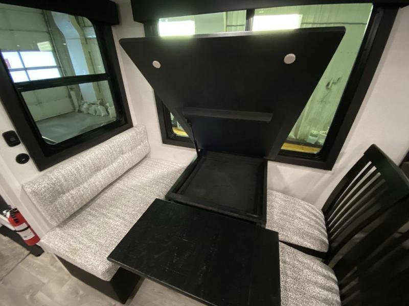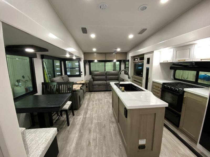 Pack your bags and head off on adventure in this spacious fifth wheel for four! The dual opposing slides in the kitchen and main living area will give your crew more space to relax. Speaking of relaxing, there is a theater seat across from the fireplace and TV plus a tri-fold sofa to make it a movie night. This unit includes a kitchen island with an All-In-One sink for easy cleaning, a hutch with added storage, plus a GE 10 cu. ft. 12V refrigerator. The front master bedroom includes an Olympic queen bed, dual wardrobes plus a third wardrobe within the bedroom slide out, and TV prep if you want the option to watch a show in bed!