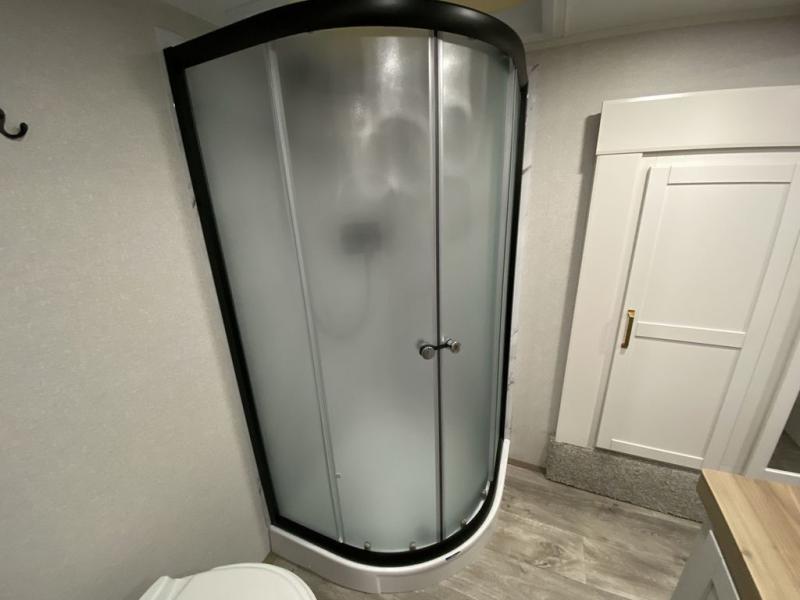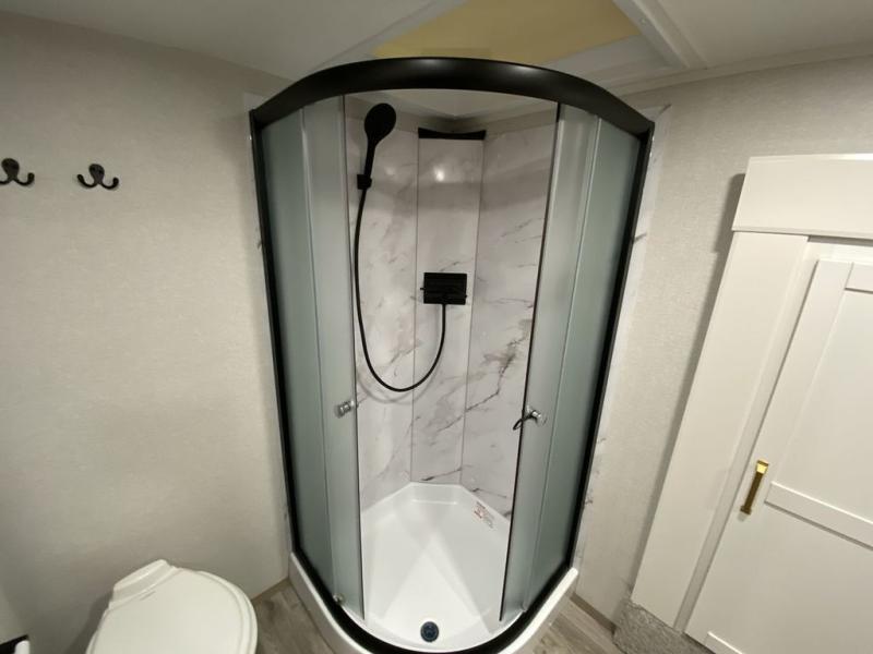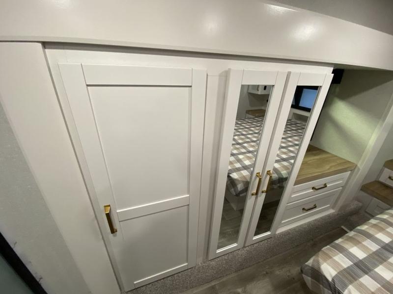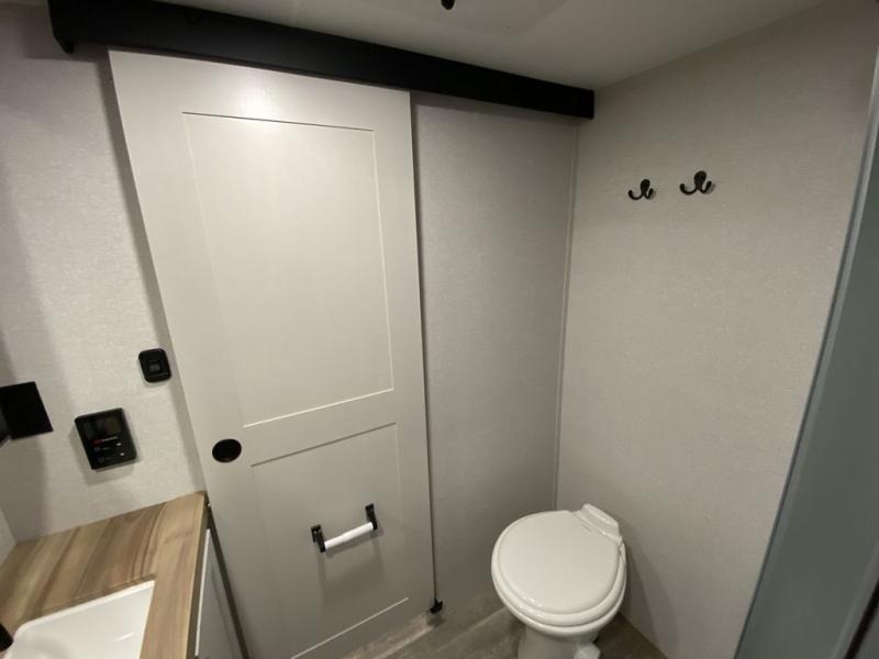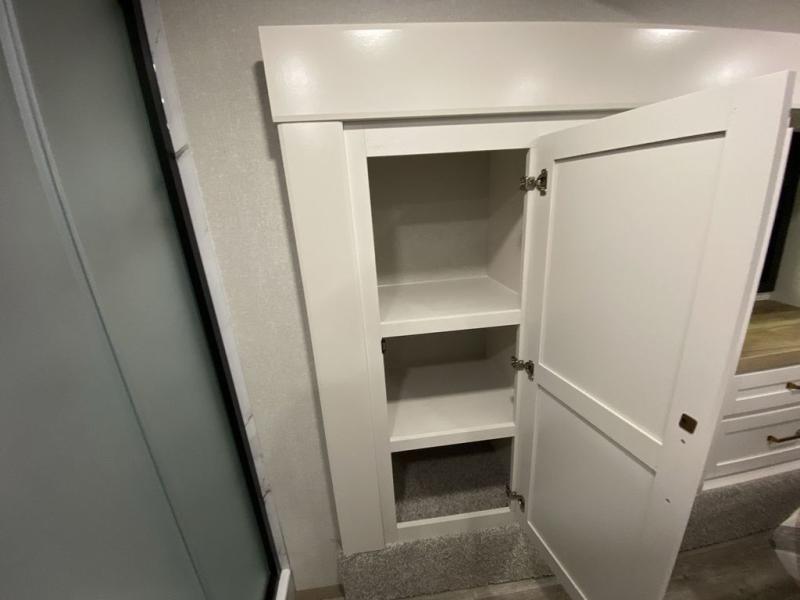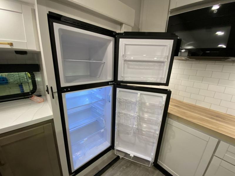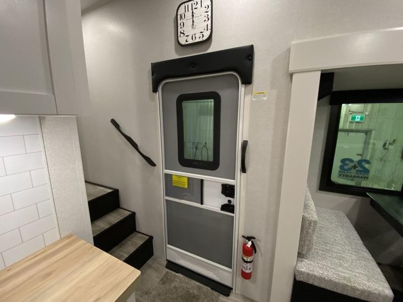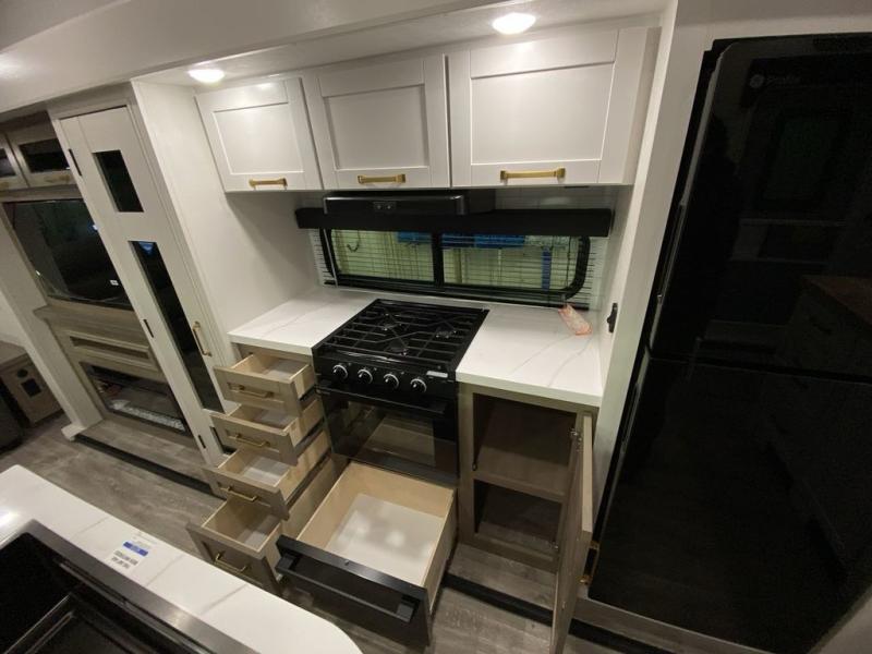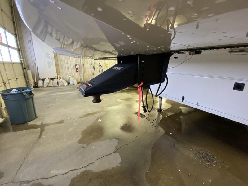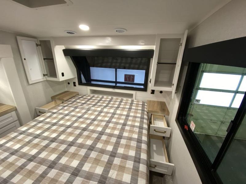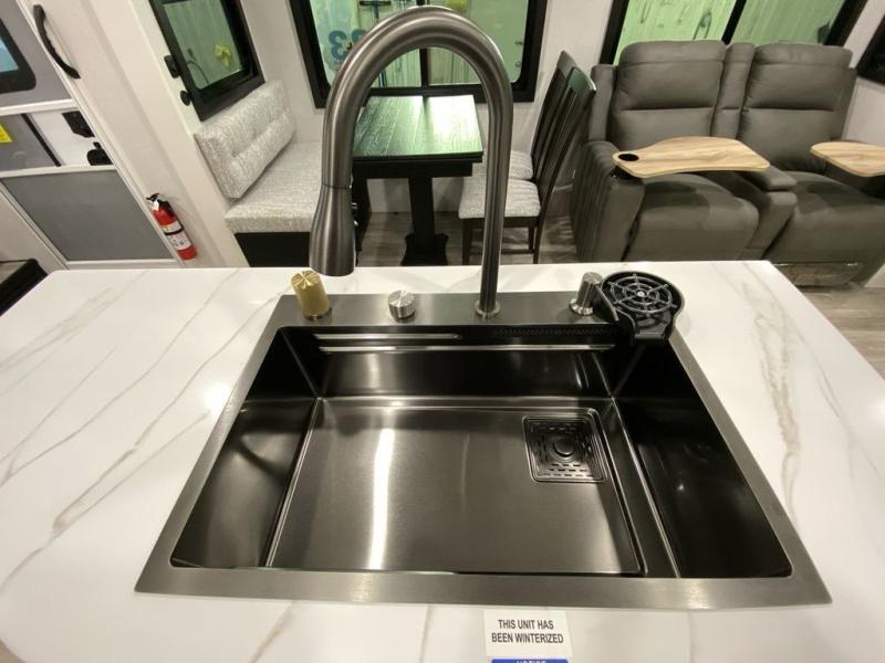 Pack your bags and head off on adventure in this spacious fifth wheel for four! The dual opposing slides in the kitchen and main living area will give your crew more space to relax. Speaking of relaxing, there is a theater seat across from the fireplace and TV plus a tri-fold sofa to make it a movie night. This unit includes a kitchen island with an All-In-One sink for easy cleaning, a hutch with added storage, plus a GE 10 cu. ft. 12V refrigerator. The front master bedroom includes an Olympic queen bed, dual wardrobes plus a third wardrobe within the bedroom slide out, and TV prep if you want the option to watch a show in bed!
