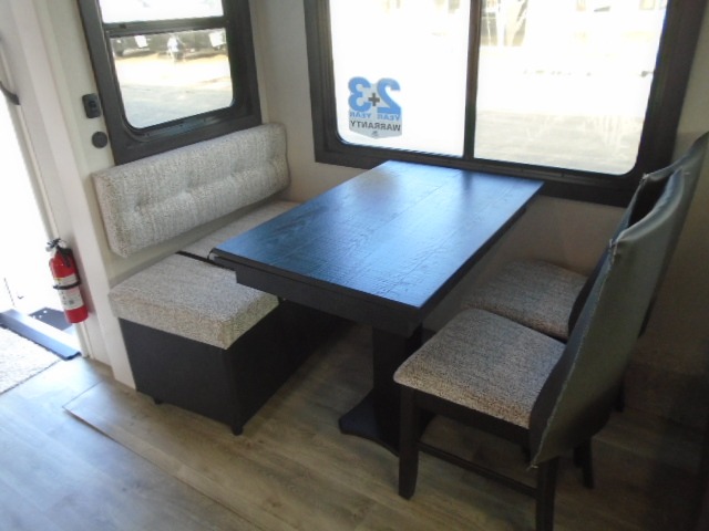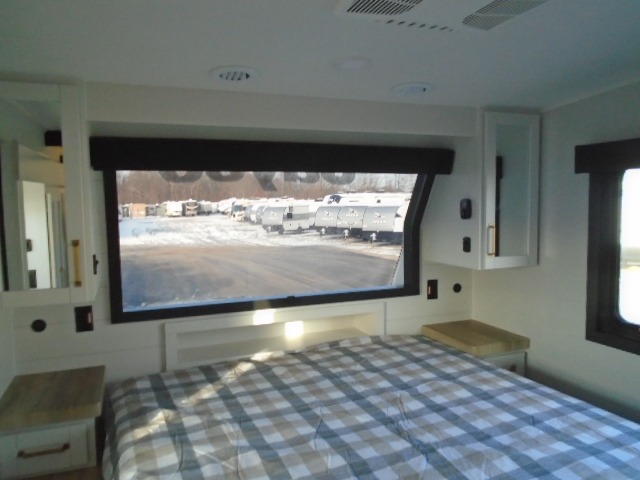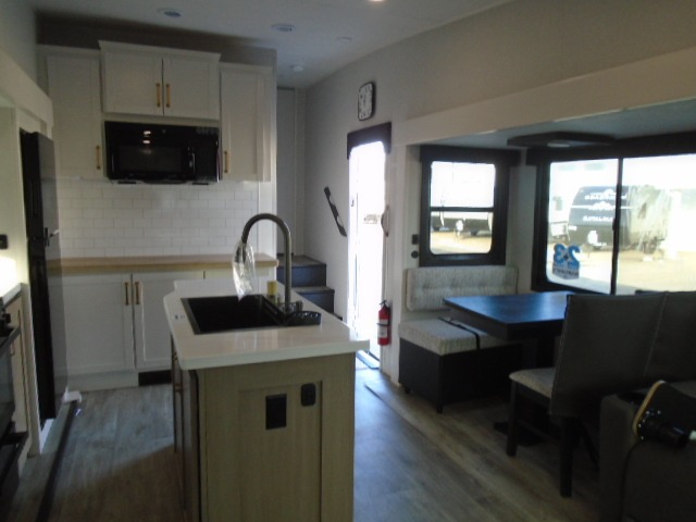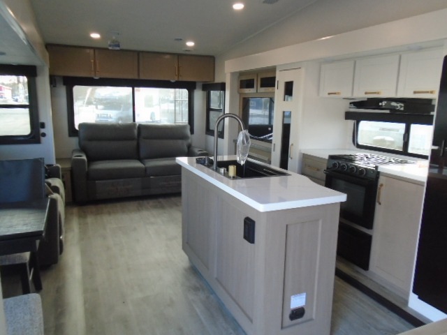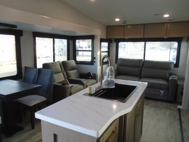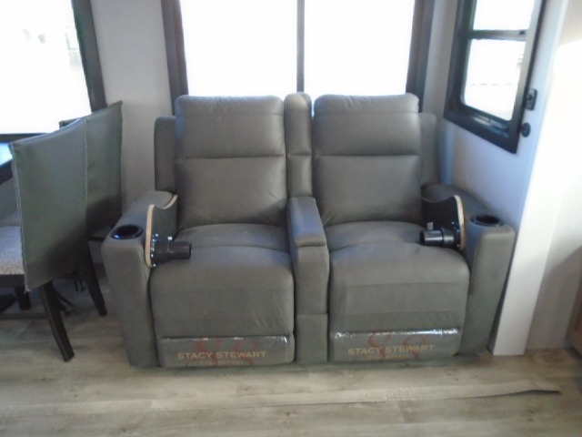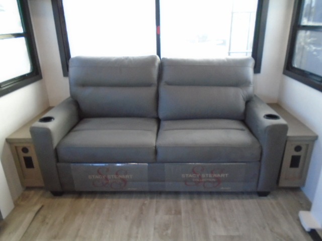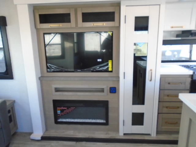 Pack your bags and head off on adventure in this spacious fifth wheel for four! The dual opposing slides in the kitchen and main living area will give your crew more space to relax. Speaking of relaxing, there is a theater seat across from the fireplace and TV plus a tri-fold sofa to make it a movie night. This unit includes a kitchen island with an All-In-One sink for easy cleaning, a hutch with added storage, plus a GE 10 cu. ft. 12V refrigerator. The front master bedroom includes an Olympic queen bed, dual wardrobes plus a third wardrobe within the bedroom slide out, and TV prep if you want the option to watch a show in bed!