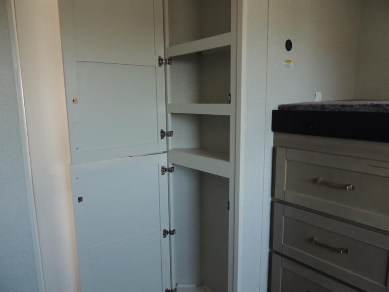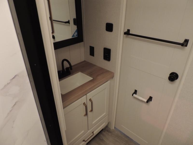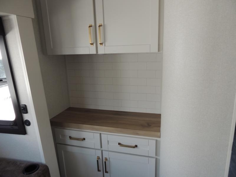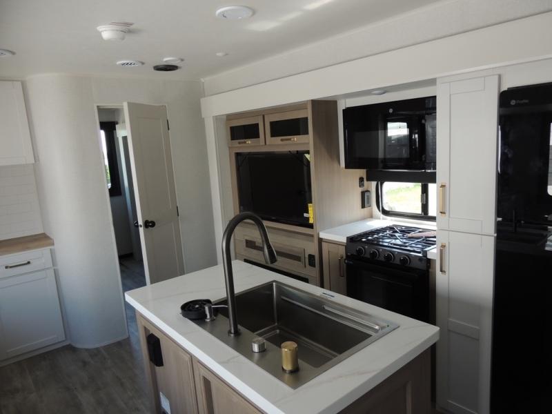 This travel trailer is perfect for your larger group or family! There is a rear private bunkhouse with two bunks, a tri-fold sofa, plus a slide out for more space. You will have the front private bedroom all to yourselves with a queen bed, and any other guests can sleep on the tri-fold sofa and booth dinette! There is also a wardrobe/linen closet with washer and dryer prep if you plan to add a washer and dyer for convenience. The chef can prepare their best meals with the kitchen island and will enjoy having two hutches to store the essentials. They could even cook at the outside kitchen to breathe in some fresh air and enjoy the beautiful scenery!