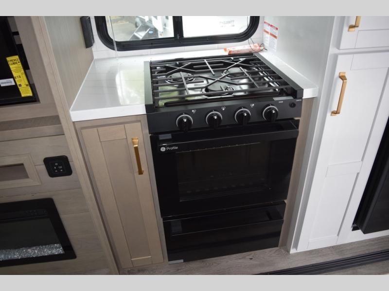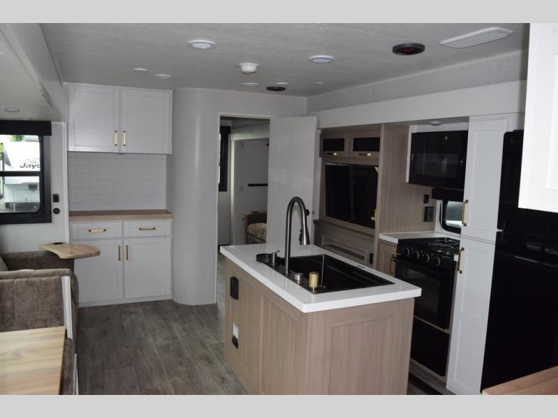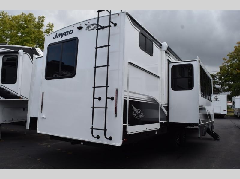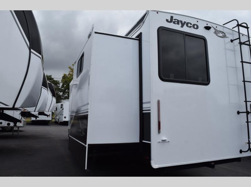 With any Eagle HT fifth wheel or travel trailer by Jayco you will enjoy a smooth drive thanks to the 4 Star Handling Package, Goodyear Endurance tires, and MORryde CRE-3000 rubberized suspension. The Customer Value Package includes amenities that are sure to make camping easier than ever, like the 60K on-demand water heater, Keyed-Alike lock system, 15,000 BTU "Whisper Quiet" A/C, and more. Handcrafted and glazed door/drawer fronts will make your space feel more like home, along with residential vinyl flooring throughout, GE appliances, and blackout roller shades with reflective side throughout to keep the sun out when you want to sleep in. Each model also includes a NuVo H2O water treatment system with filters included, interior and exterior "Blue Sync" audio connect with MB Quart Sound for your TV and phone, and 100% no floor vents for added comfort and convenience!