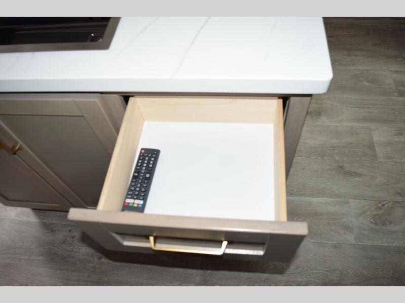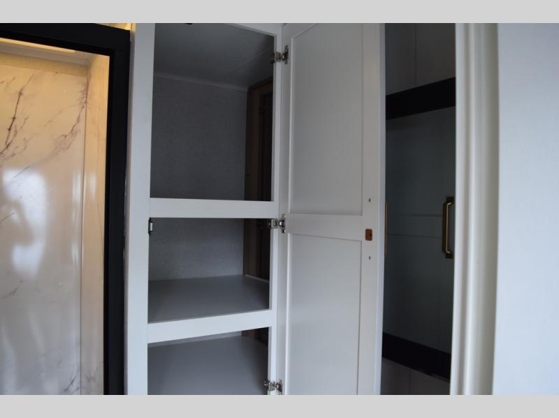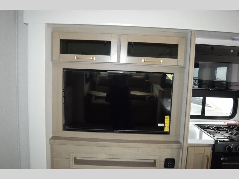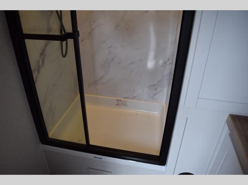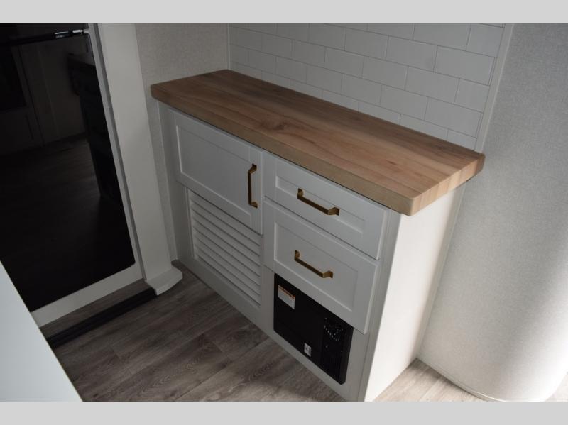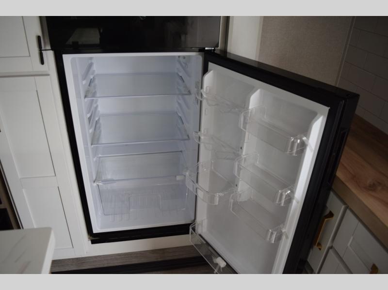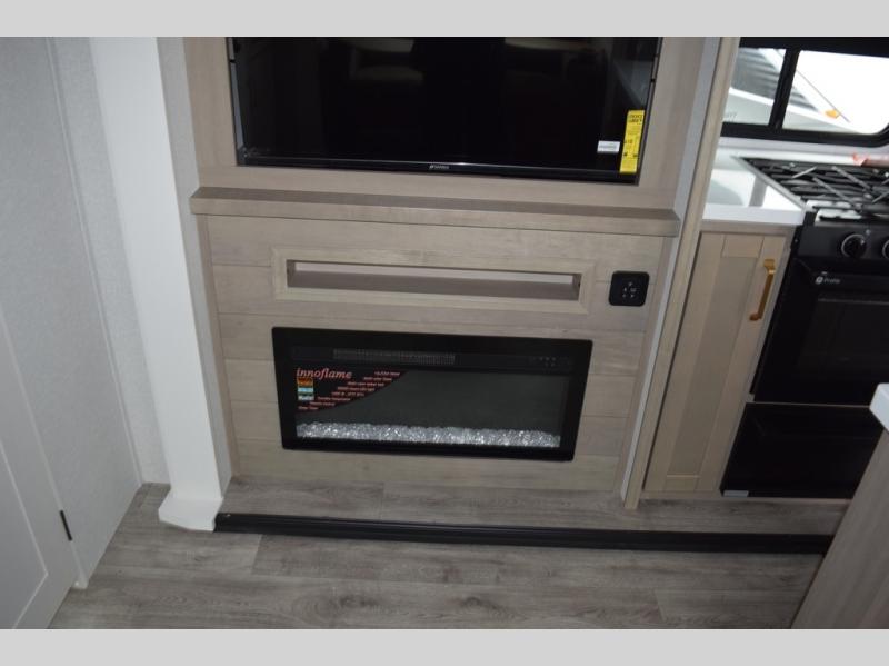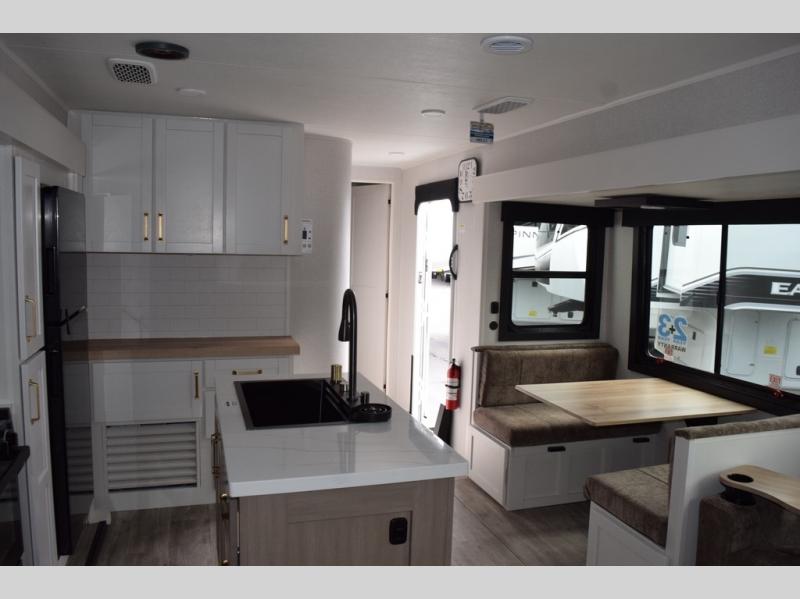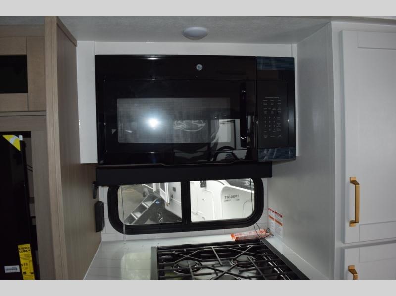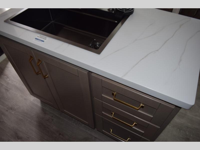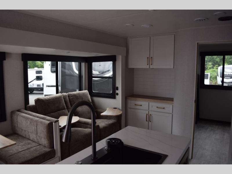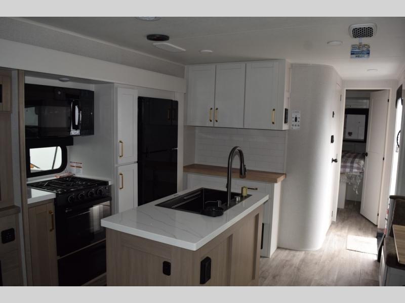 This travel trailer is perfect for your larger group or family! There is a rear private bunkhouse with two bunks, a tri-fold sofa, plus a slide out for more space. You will have the front private bedroom all to yourselves with a queen bed, and any other guests can sleep on the tri-fold sofa and booth dinette! There is also a wardrobe/linen closet with washer and dryer prep if you plan to add a washer and dyer for convenience. The chef can prepare their best meals with the kitchen island and will enjoy having two hutches to store the essentials. They could even cook at the outside kitchen to breathe in some fresh air and enjoy the beautiful scenery!