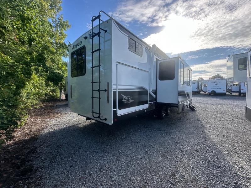 With any Eagle HT fifth wheel or travel trailer by Jayco you will enjoy a smooth drive thanks to the 4 Star Handling Package and MORryde CRE-3000 rubberized suspension. The Customer Value Package includes amenities that are sure to make camping easier than ever, like the 60K on-demand water heater, Keyed-Alike lock system, 15,000 BTU "Whisper Quiet" A/C, and more. Handcrafted door/drawer fronts will make your space feel more like home, along with residential vinyl flooring throughout, GE appliances, and blackout roller shades with reflective side throughout to keep the sun out when you want to sleep in. Each model also includes a NuVo H2O water treatment system with filters included, interior and exterior "Blue Sync" audio connect with MB Quart Sound for your TV and phone, and 100% no floor vents for added comfort and convenience!