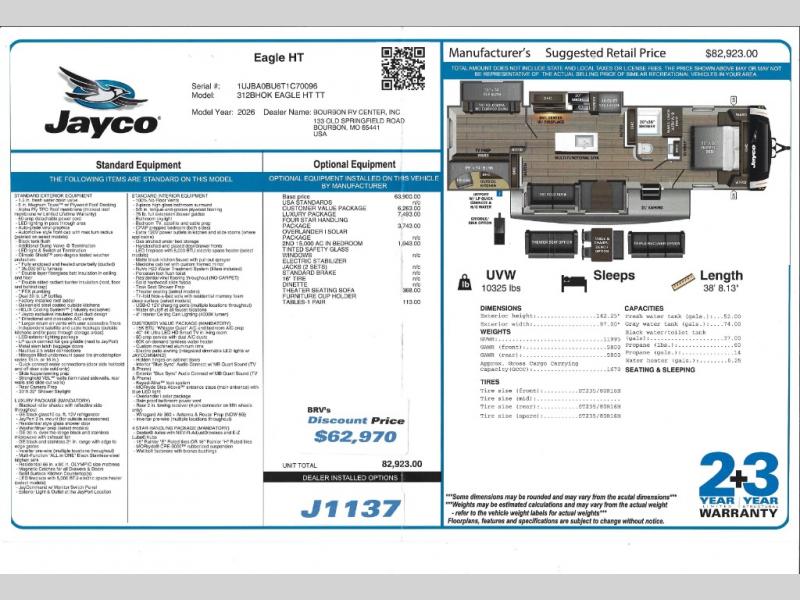 With any Eagle HT fifth wheel or travel trailer by Jayco you will enjoy a smooth drive thanks to the 4 Star Handling Package and MORryde CRE-3000 rubberized suspension. The Customer Value Package includes amenities that are sure to make camping easier than ever, like the 60K on-demand water heater, Keyed-Alike lock system, 15,000 BTU "Whisper Quiet" A/C, and more. Handcrafted door/drawer fronts will make your space feel more like home, along with residential vinyl flooring throughout, GE appliances, and blackout roller shades with reflective side throughout to keep the sun out when you want to sleep in. Each model also includes a NuVo H2O water treatment system with filters included, interior and exterior "Blue Sync" audio connect with MB Quart Sound for your TV and phone, and 100% no floor vents for added comfort and convenience!
