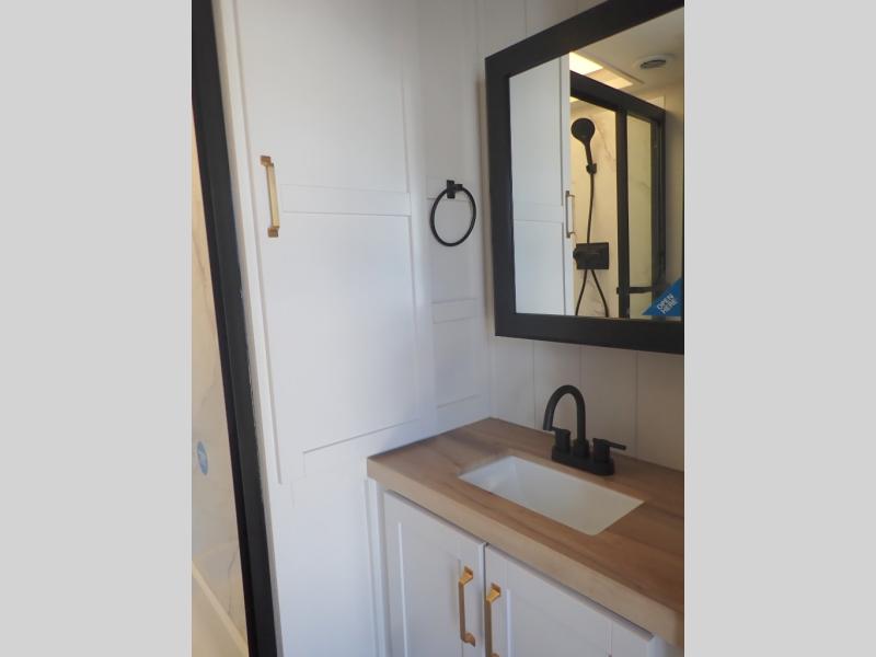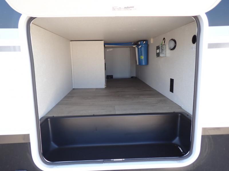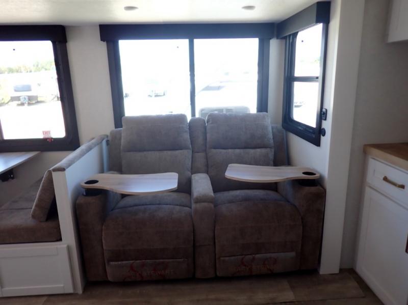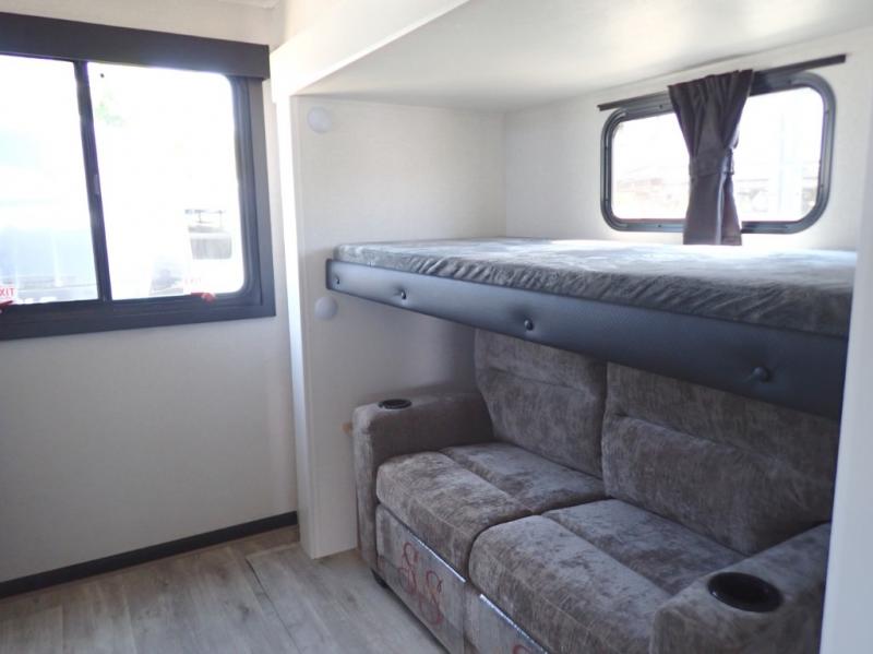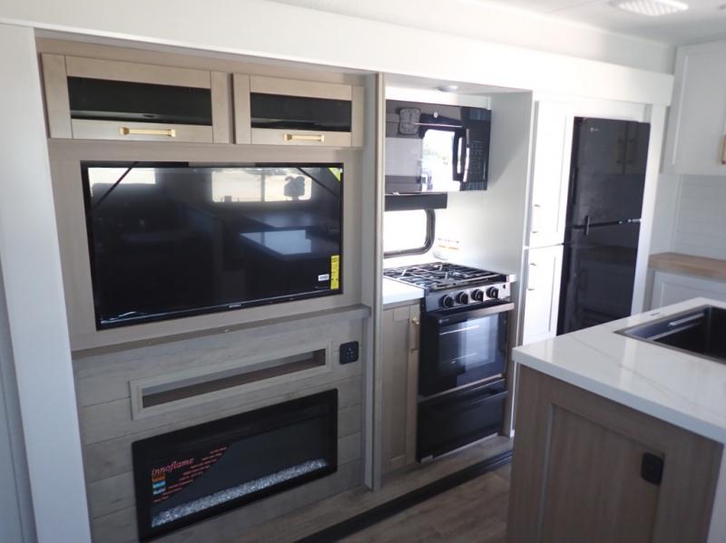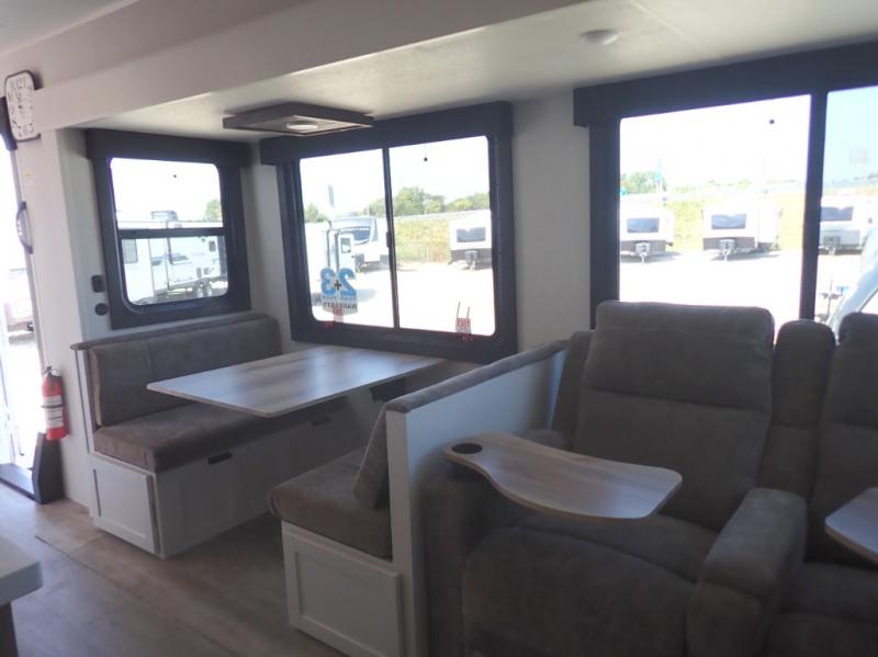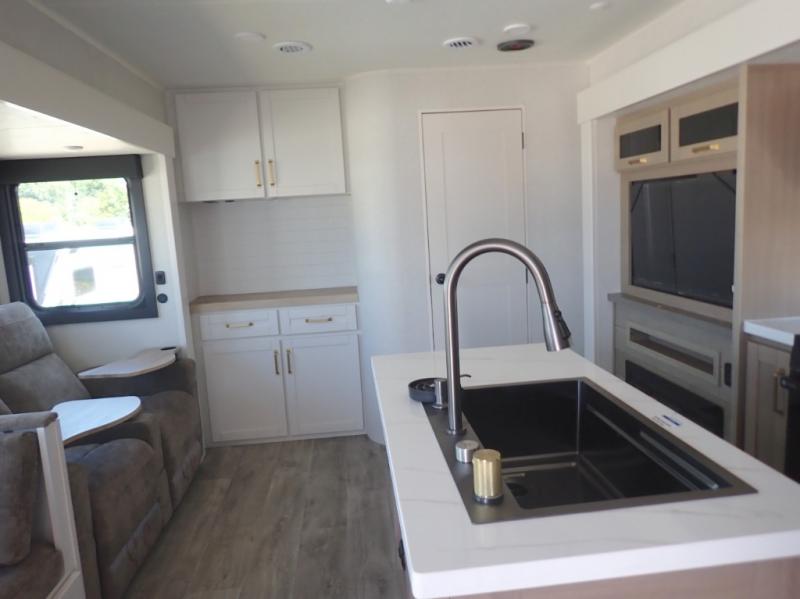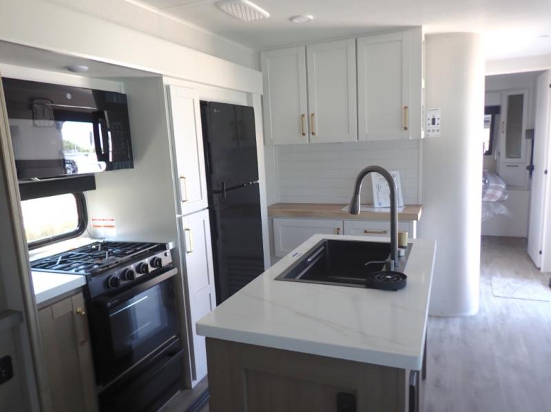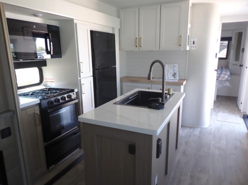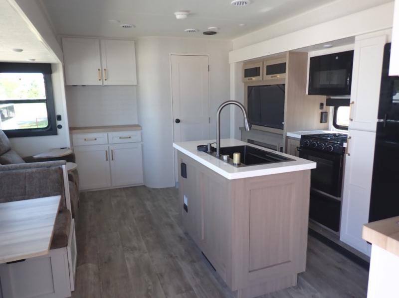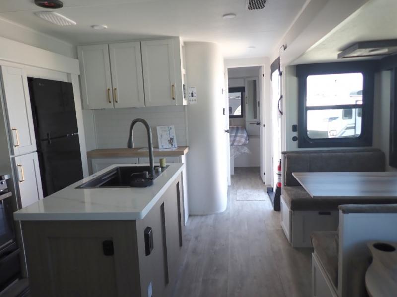 This travel trailer is perfect for your larger group or family! There is a rear private bunkhouse with two bunks, a tri-fold sofa, plus a slide out for more space. You will have the front private bedroom all to yourselves with a queen bed, and any other guests can sleep on the tri-fold sofa and booth dinette! There is also a wardrobe/linen closet with washer and dryer prep if you plan to add a washer and dyer for convenience. The chef can prepare their best meals with the kitchen island and will enjoy having two hutches to store the essentials. They could even cook at the outside kitchen to breathe in some fresh air and enjoy the beautiful scenery!