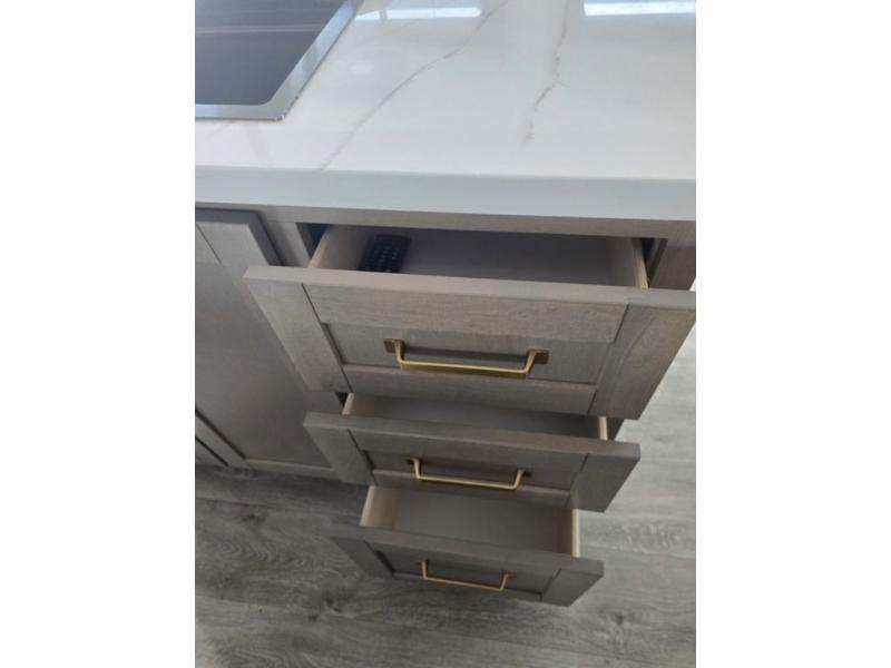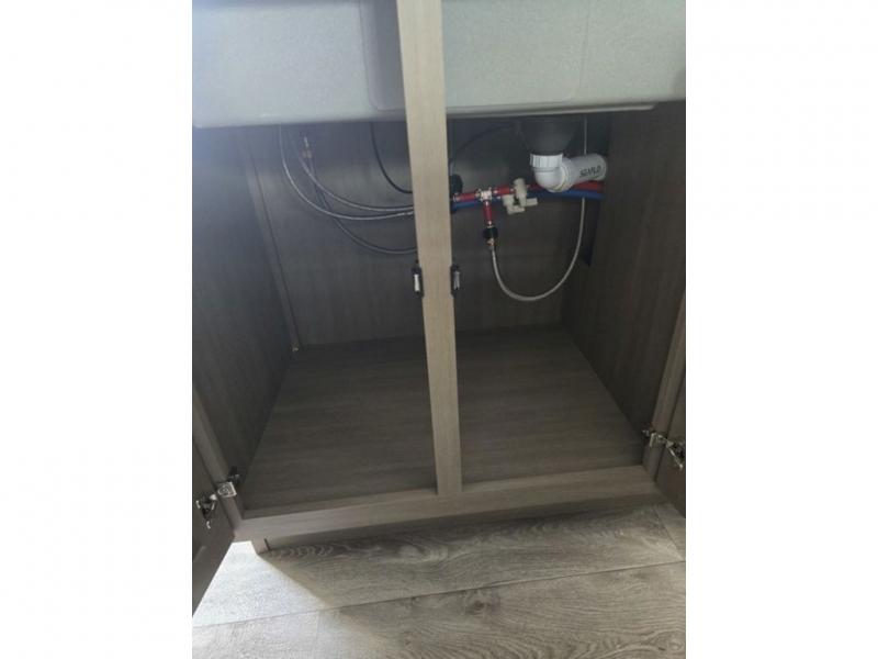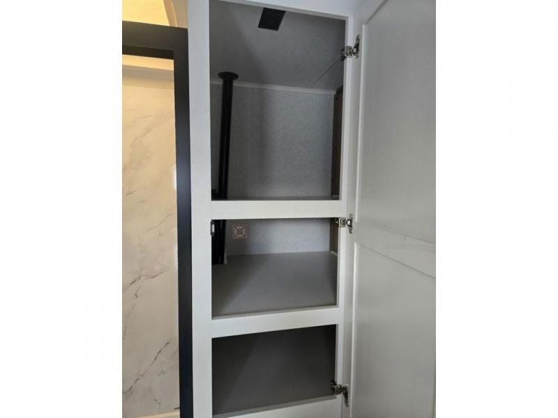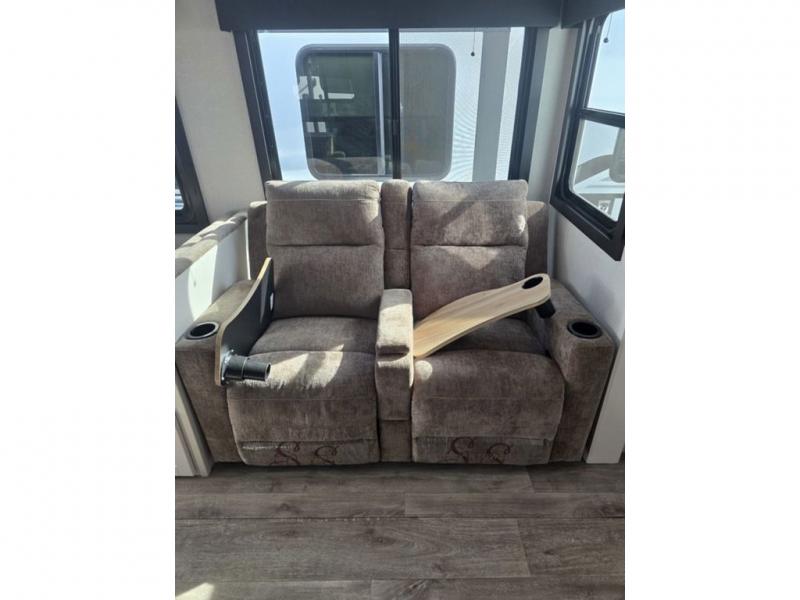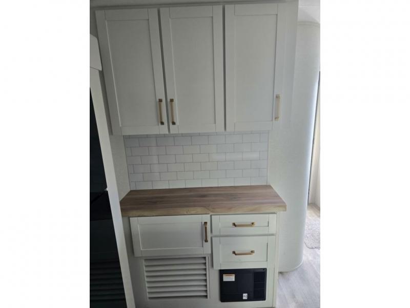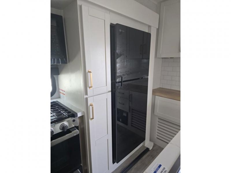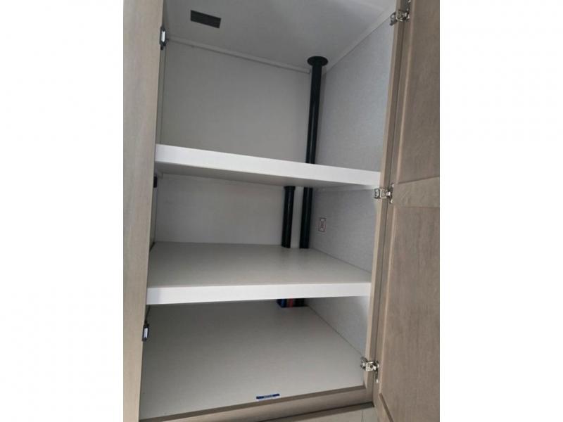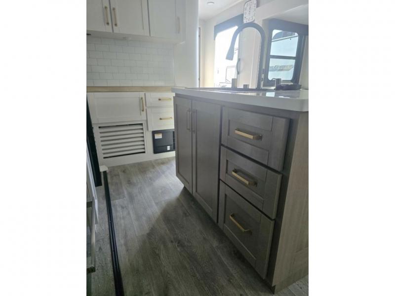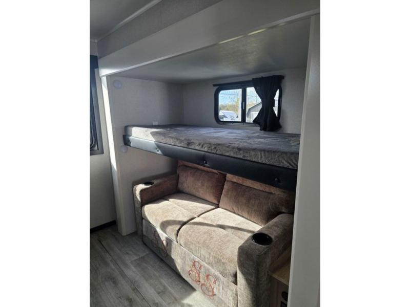 This travel trailer is perfect for your larger group or family! There is a rear private bunkhouse with two bunks, a tri-fold sofa, plus a slide out for more space. You will have the front private bedroom all to yourselves with a queen bed, and any other guests can sleep on the tri-fold sofa and booth dinette! There is also a wardrobe/linen closet with washer and dryer prep if you plan to add a washer and dyer for convenience. The chef can prepare their best meals with the kitchen island and will enjoy having two hutches to store the essentials. They could even cook at the outside kitchen to breathe in some fresh air and enjoy the beautiful scenery!