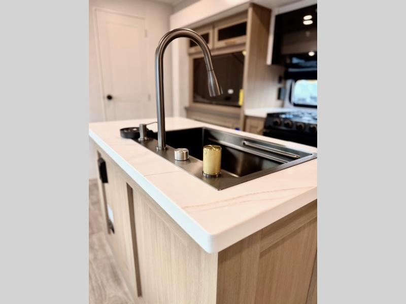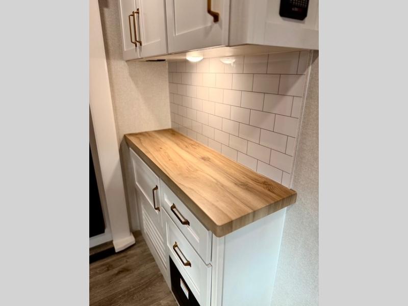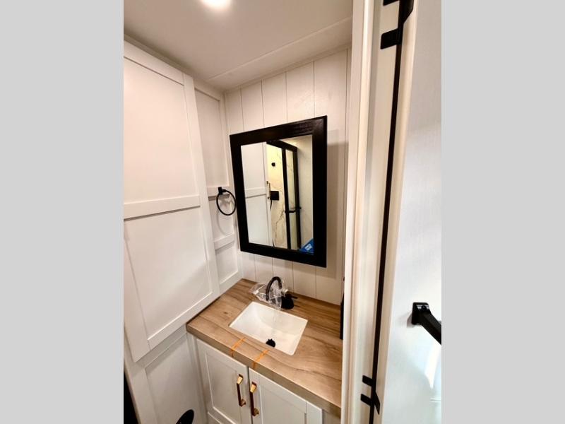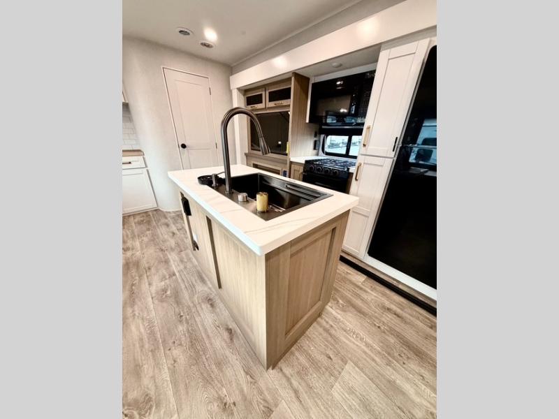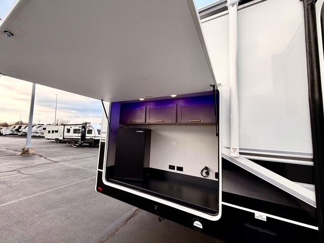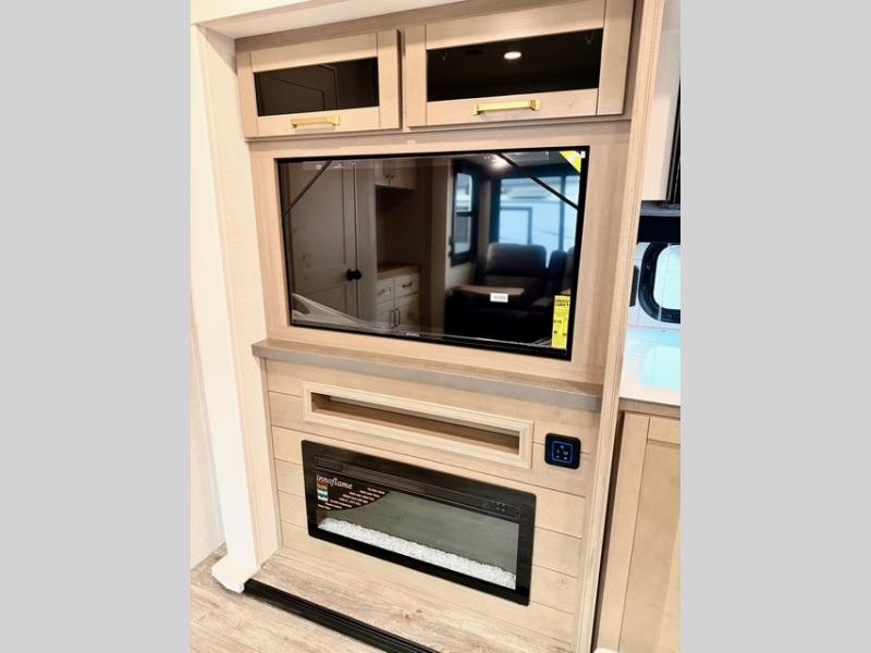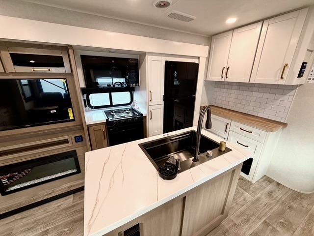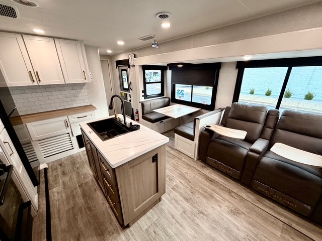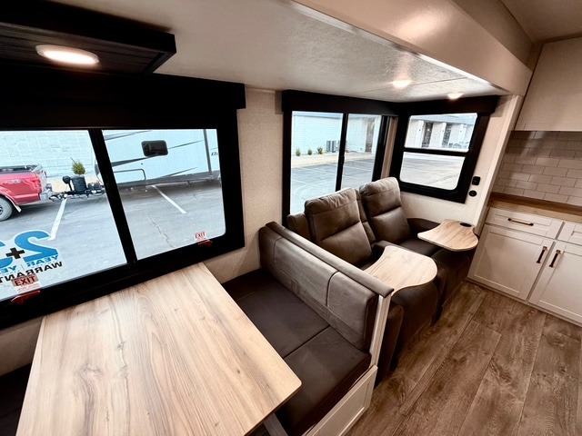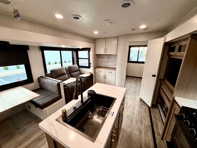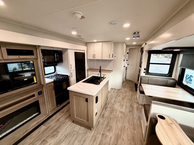 The kitchen is equipped with a spacious island, dual hutches for storage, and modern appliances, making meal prep simple and enjoyable. You can also take advantage of the outside kitchen to cook while enjoying the fresh air and surrounding scenery. The living area features a fireplace to add warmth and ambiance, and the booth dinette provides a place to dine, play games, or work remotely.