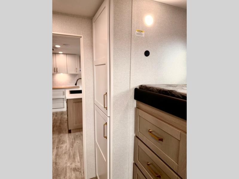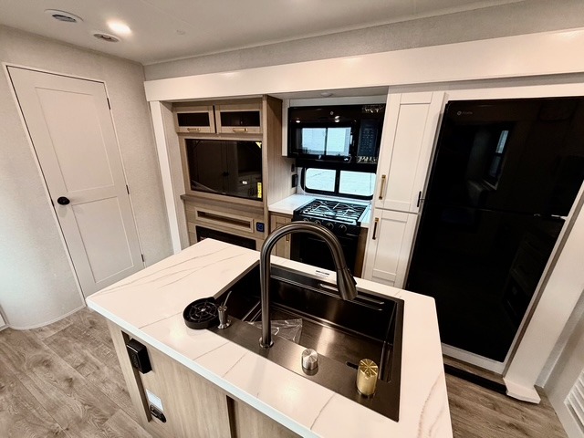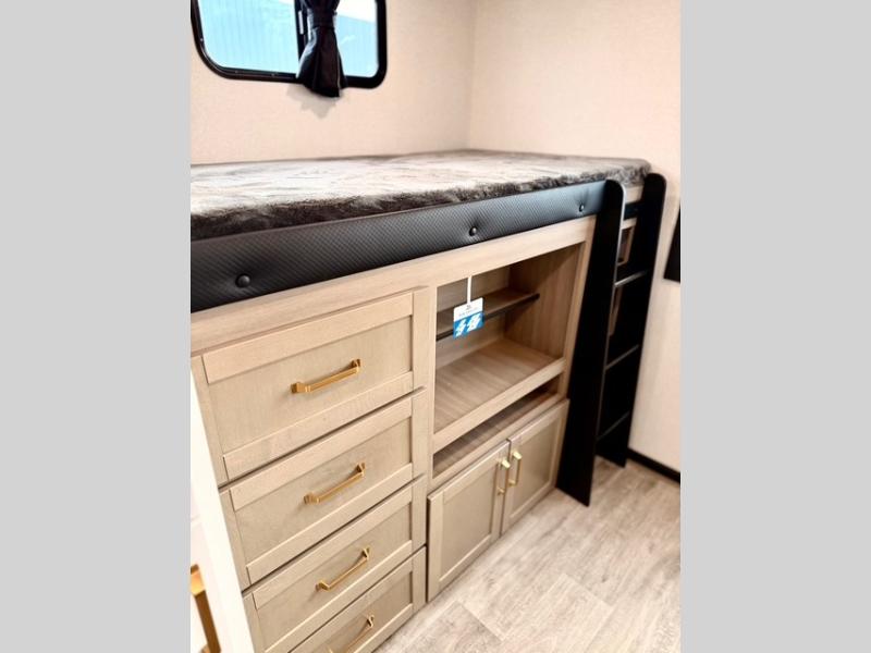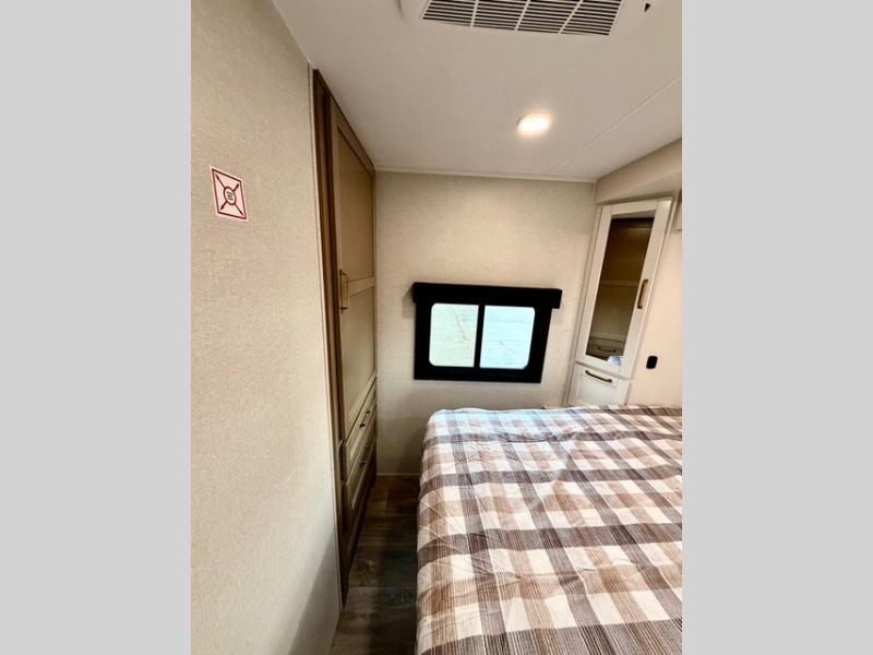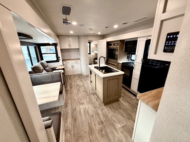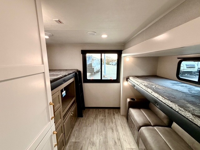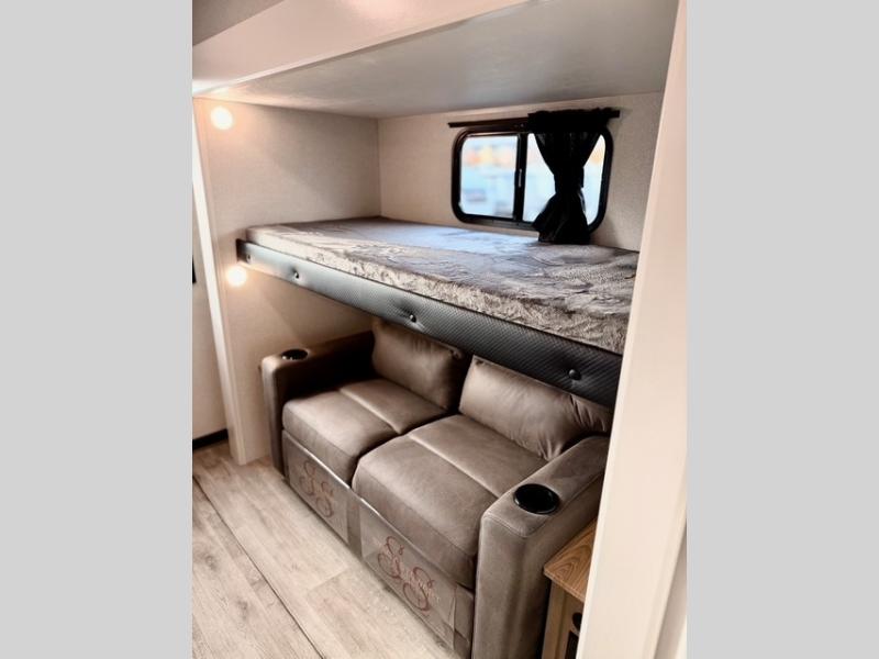 This travel trailer is ideal for larger families or groups who want both comfort and versatility. The rear private bunkhouse includes two bunk beds, a tri-fold sofa, and a slide-out to maximize living space. The front private bedroom offers a queen bed for added privacy, while additional guests can sleep comfortably on the tri-fold sofa or booth dinette. A wardrobe/linen closet with washer and dryer prep makes it easy to add laundry capabilities for extended trips.