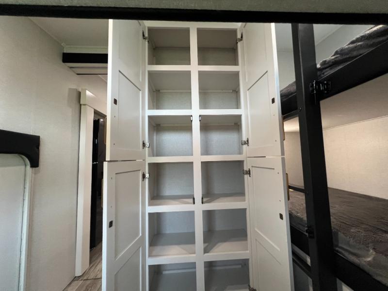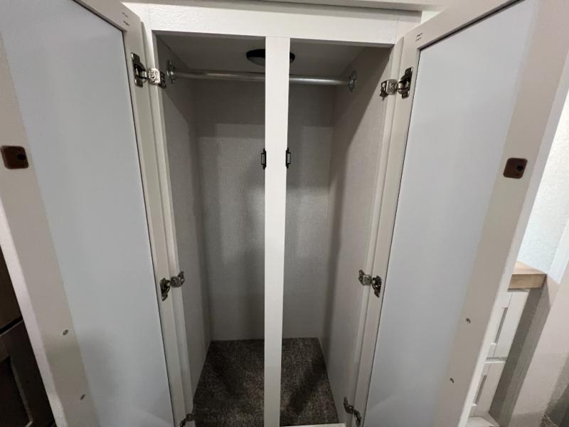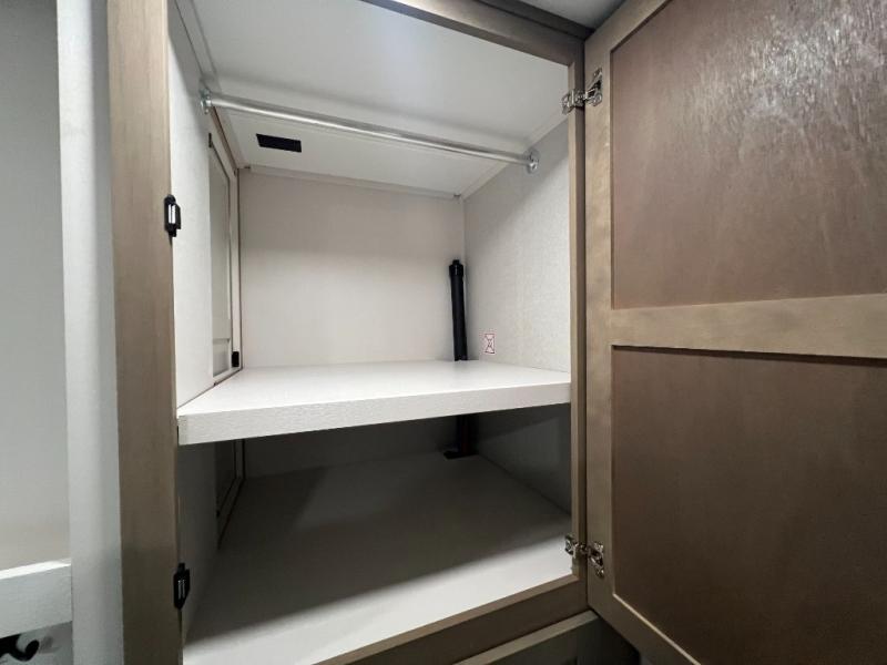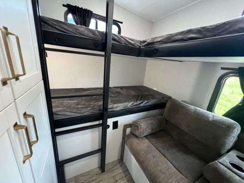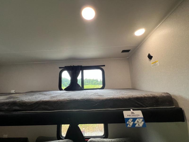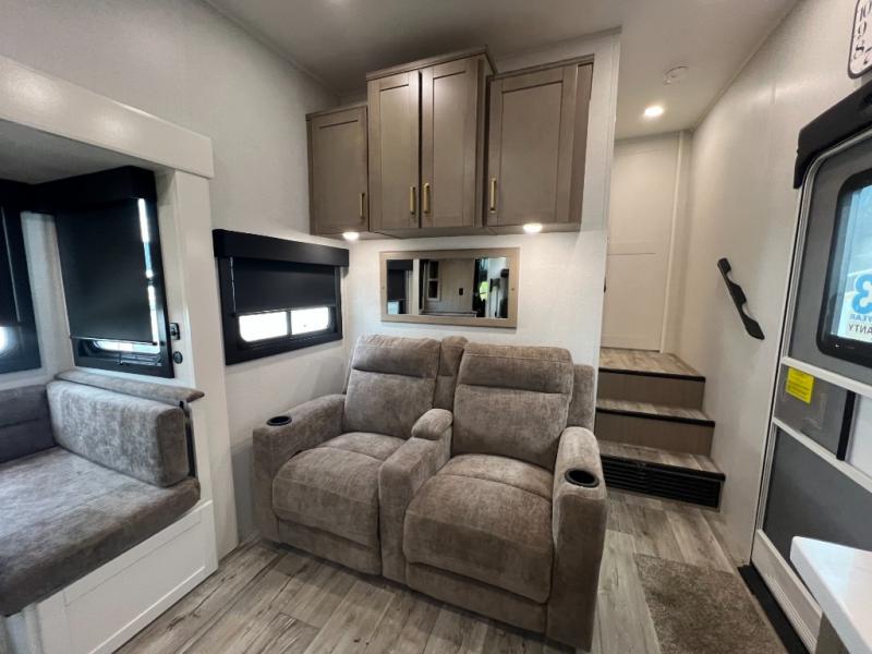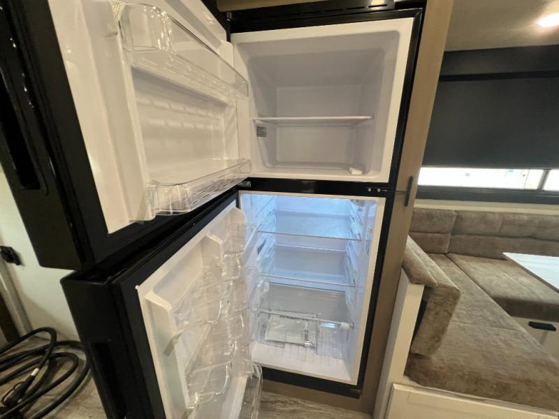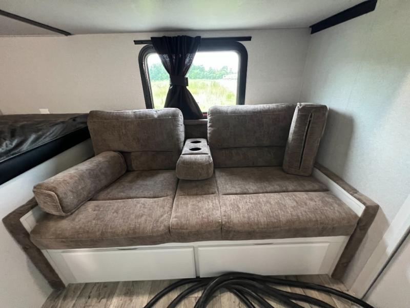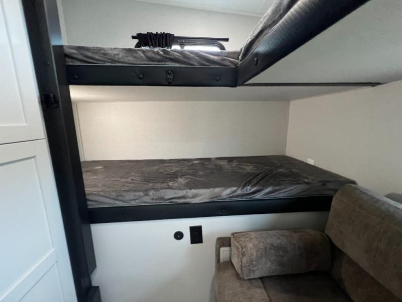 This fifth wheel is not only packed with amenities, but it can sleep up to eight people each night for fun camping trips! The rear private bunkhouse includes bunk beds plus a third bunk above a jack-knife sofa, and there is a bike storage door here so you can easily pack in gear. You can claim the front private bedroom all to yourselves with an Olympic bed, a wardrobe slide plus a second wardrobe with washer and dryer prep. Everyone can come together in the combined kitchen and living room that features a U-shaped dinette across from the TV and a theater seat for added comfort!