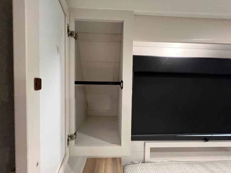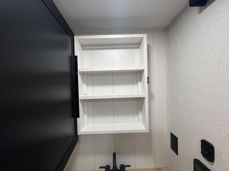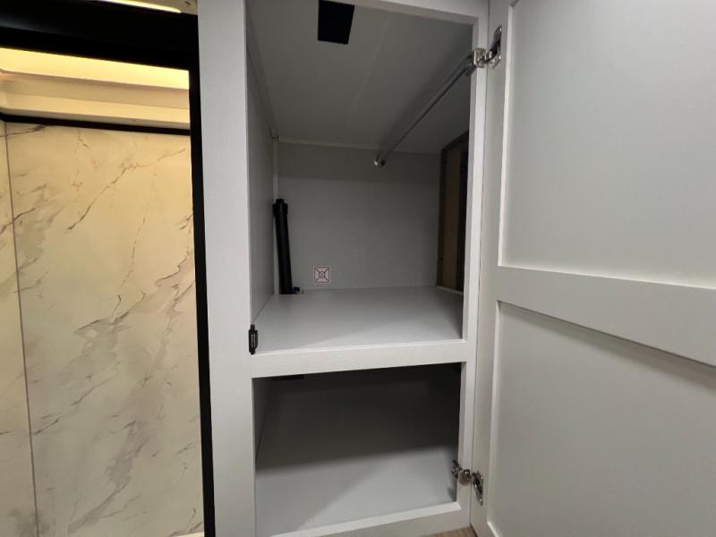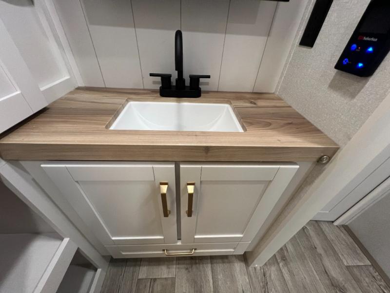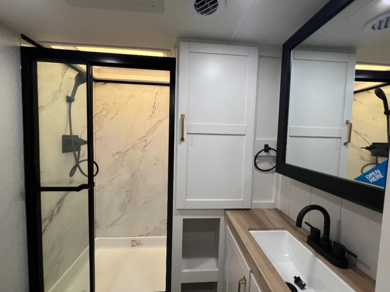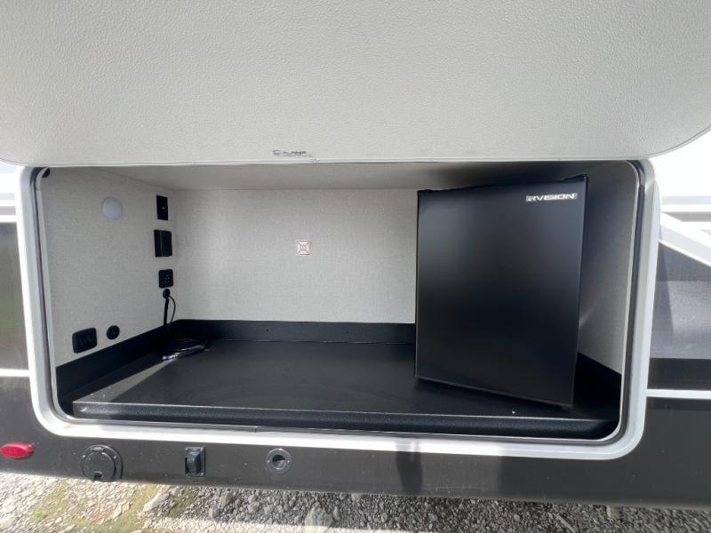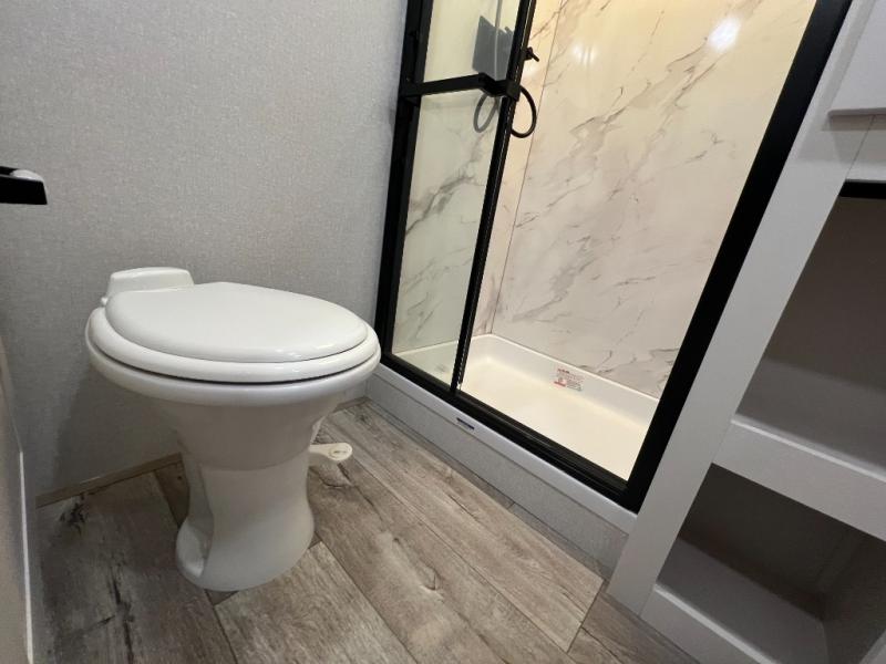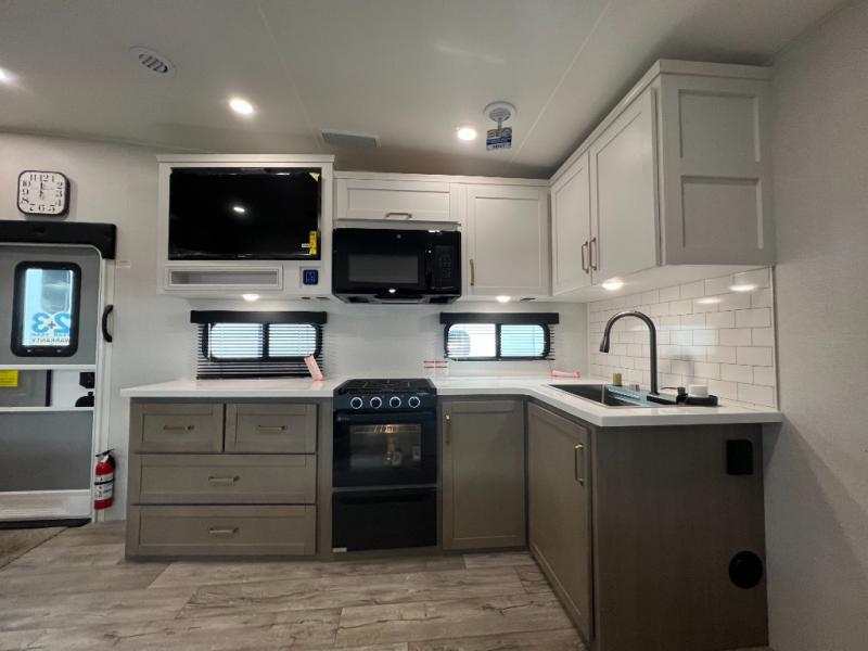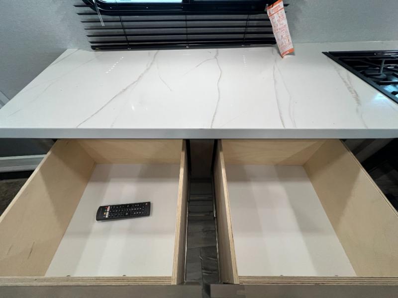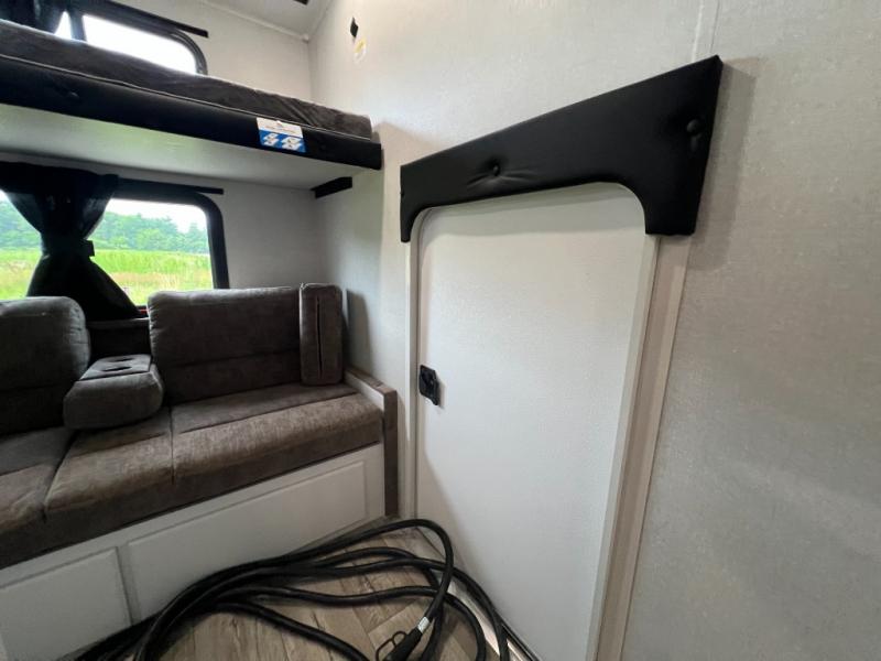 This fifth wheel is not only packed with amenities, but it can sleep up to eight people each night for fun camping trips! The rear private bunkhouse includes bunk beds plus a third bunk above a jack-knife sofa, and there is a bike storage door here so you can easily pack in gear. You can claim the front private bedroom all to yourselves with an Olympic bed, a wardrobe slide plus a second wardrobe with washer and dryer prep. Everyone can come together in the combined kitchen and living room that features a U-shaped dinette across from the TV and a theater seat for added comfort!