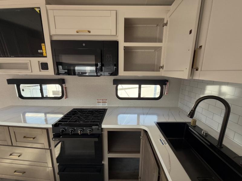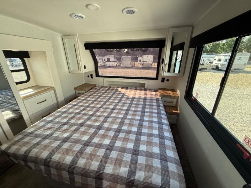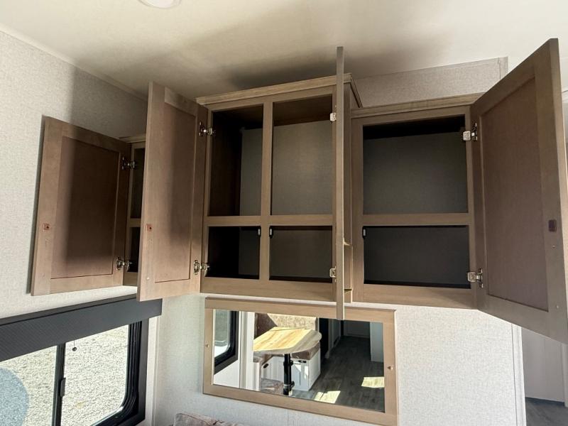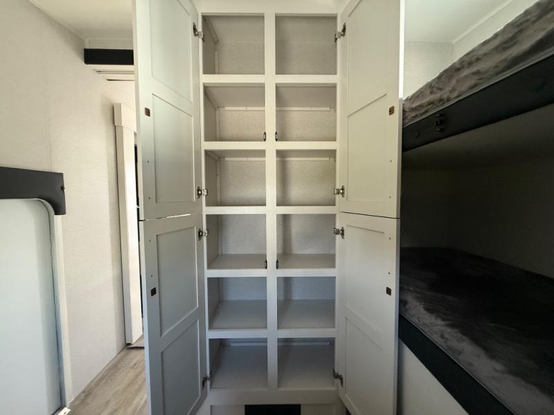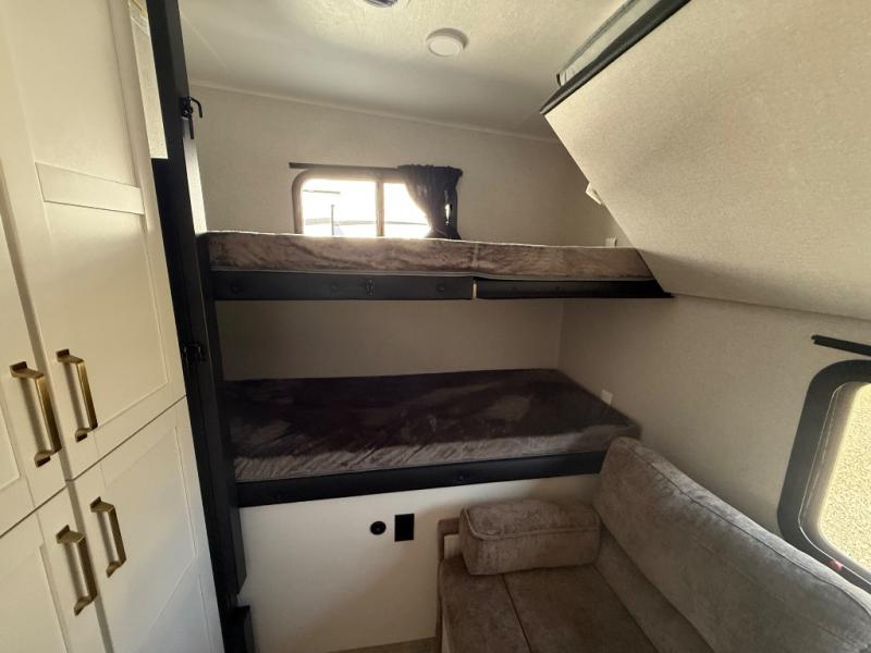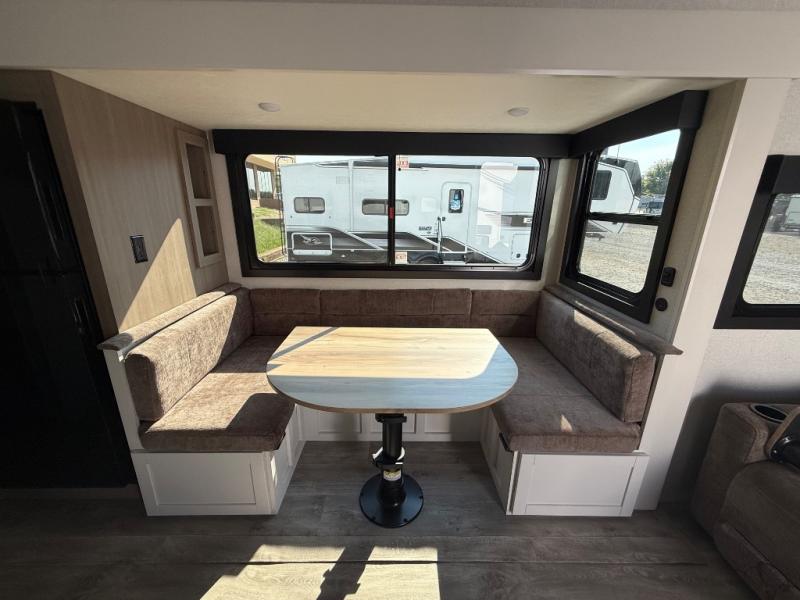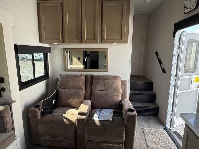 This fifth wheel is not only packed with amenities, but it can sleep up to eight people each night for fun camping trips! The rear private bunkhouse includes bunk beds plus a third bunk above a jack-knife sofa, and there is a bike storage door here so you can easily pack in gear. You can claim the front private bedroom all to yourselves with an Olympic bed, a wardrobe slide plus a second wardrobe with washer and dryer prep. Everyone can come together in the combined kitchen and living room that features a U-shaped dinette across from the TV and a theater seat for added comfort!