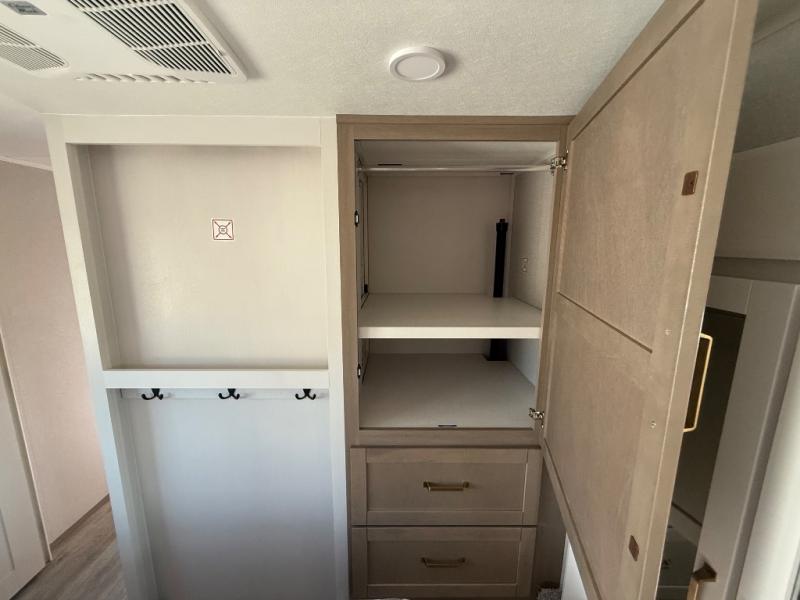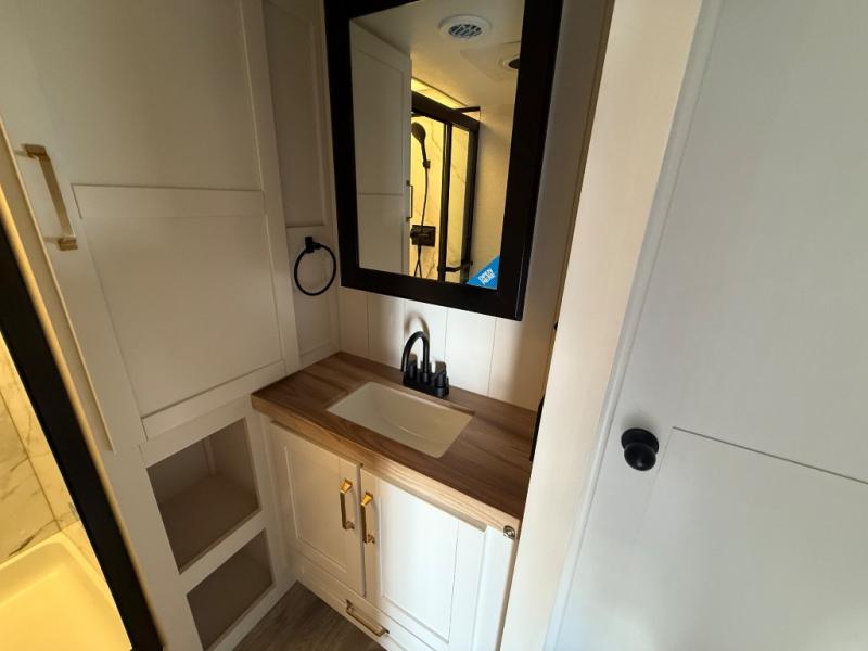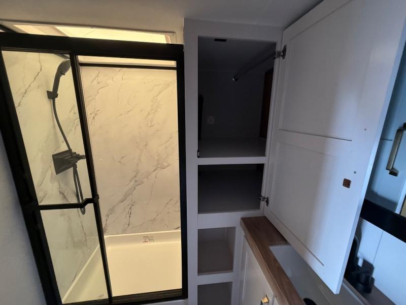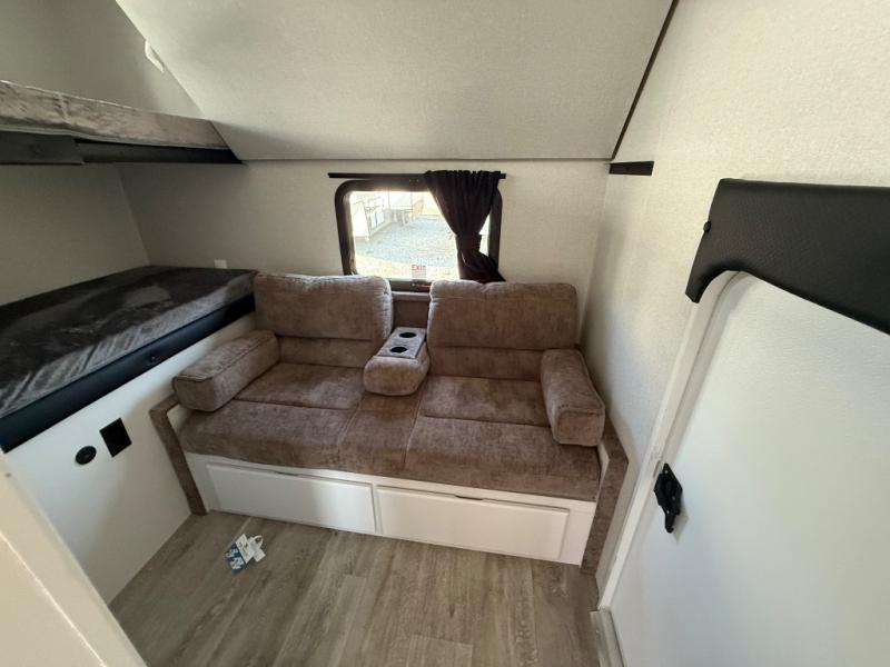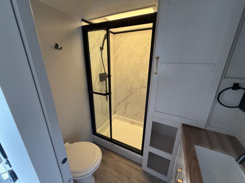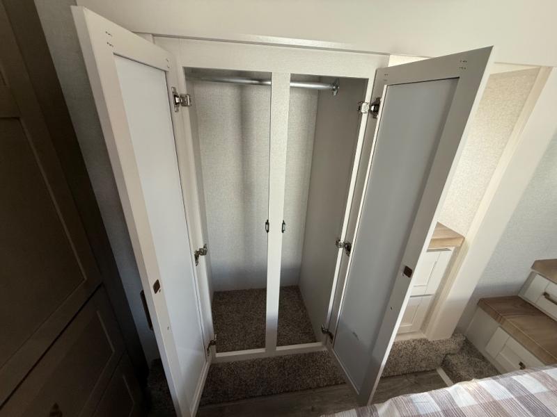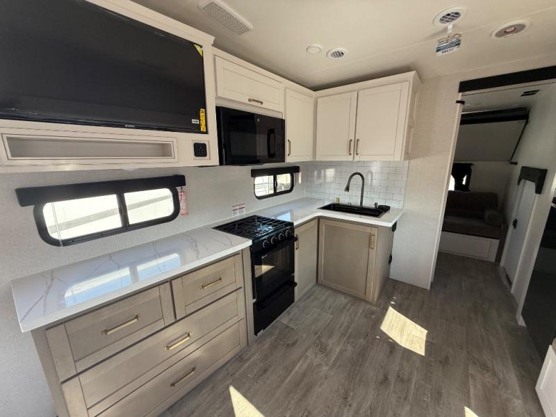 This fifth wheel is not only packed with amenities, but it can sleep up to eight people each night for fun camping trips! The rear private bunkhouse includes bunk beds plus a third bunk above a jack-knife sofa, and there is a bike storage door here so you can easily pack in gear. You can claim the front private bedroom all to yourselves with an Olympic bed, a wardrobe slide plus a second wardrobe with washer and dryer prep. Everyone can come together in the combined kitchen and living room that features a U-shaped dinette across from the TV and a theater seat for added comfort!