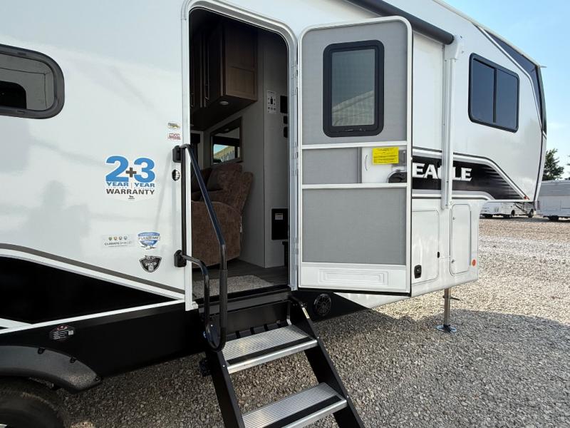 With any Eagle HT fifth wheel or travel trailer by Jayco you will enjoy a smooth drive thanks to the 4 Star Handling Package, Goodyear Endurance tires, and MORryde CRE-3000 rubberized suspension. The Customer Value Package includes amenities that are sure to make camping easier than ever, like the 60K on-demand water heater, Keyed-Alike lock system, 15,000 BTU "Whisper Quiet" A/C, and more. Handcrafted and glazed door/drawer fronts will make your space feel more like home, along with residential vinyl flooring throughout, GE appliances, and blackout roller shades with reflective side throughout to keep the sun out when you want to sleep in. Each model also includes a NuVo H2O water treatment system with filters included, interior and exterior "Blue Sync" audio connect with MB Quart Sound for your TV and phone, and 100% no floor vents for added comfort and convenience!