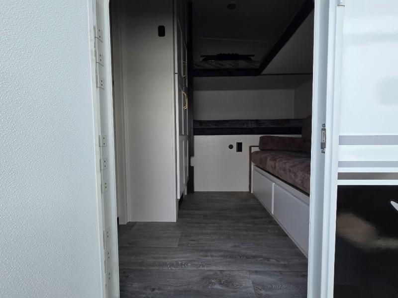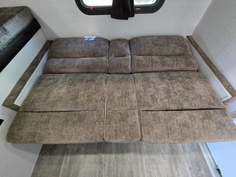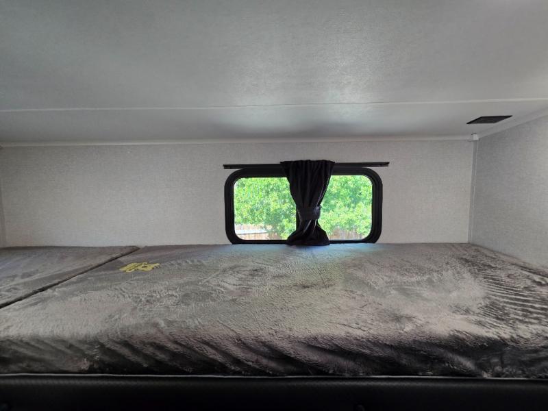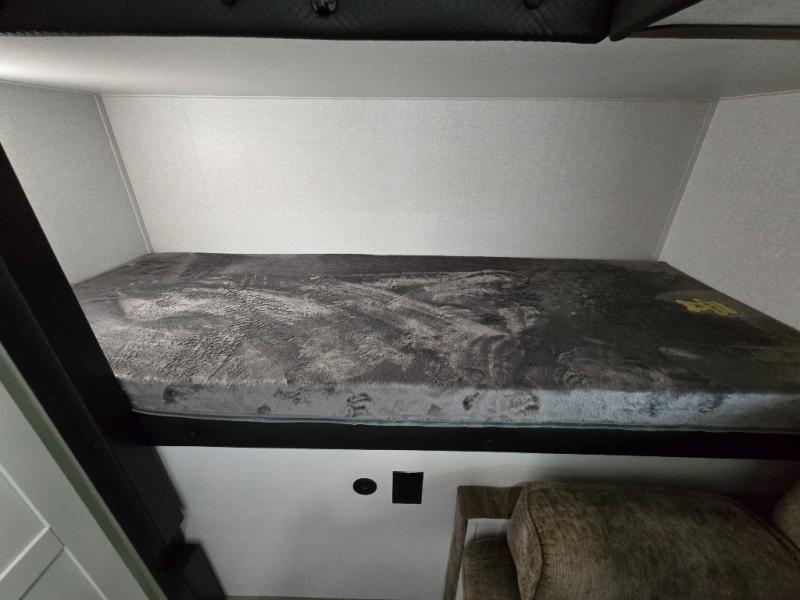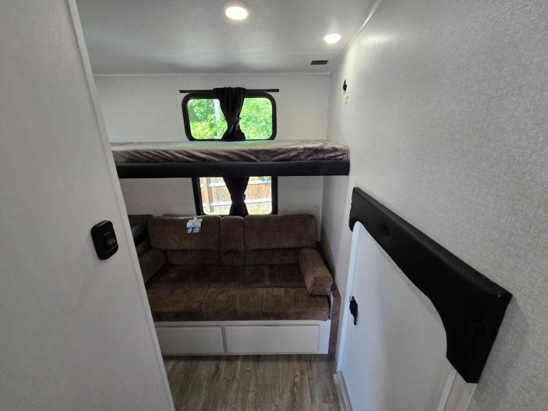 Rear Private Bunkhouse – Bunk beds, a jack-knife sofa with an overhead bunk, plus a bike storage door for gear.