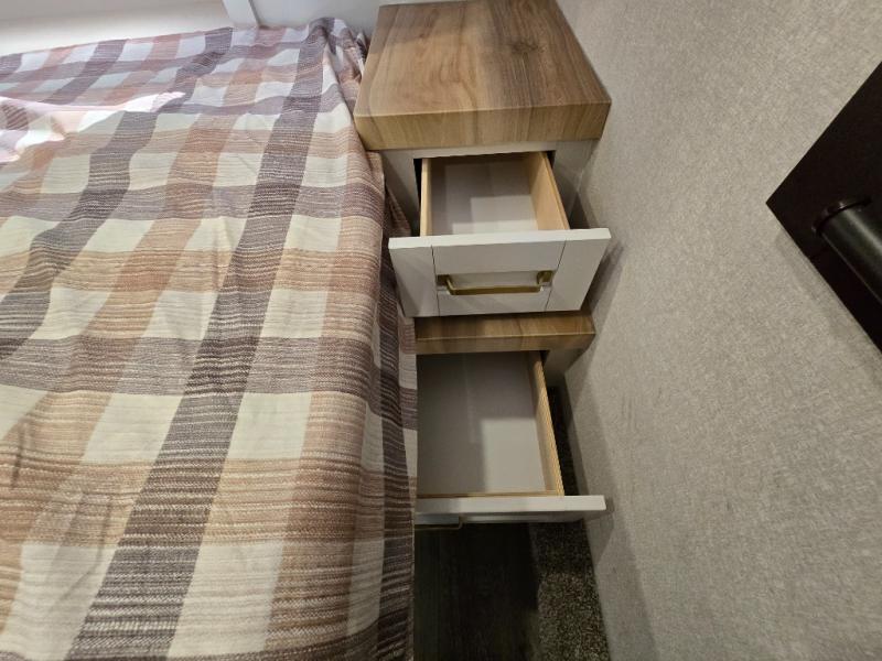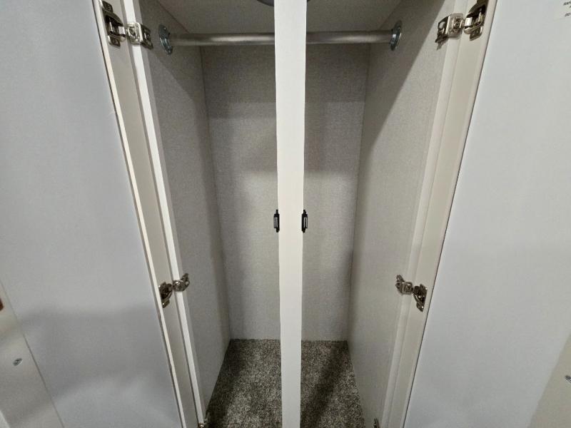 Front Private Bedroom – Olympic queen bed, wardrobe slide, and washer/dryer prep for extended stays.