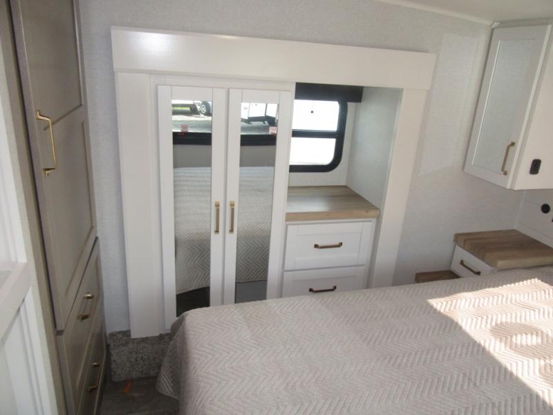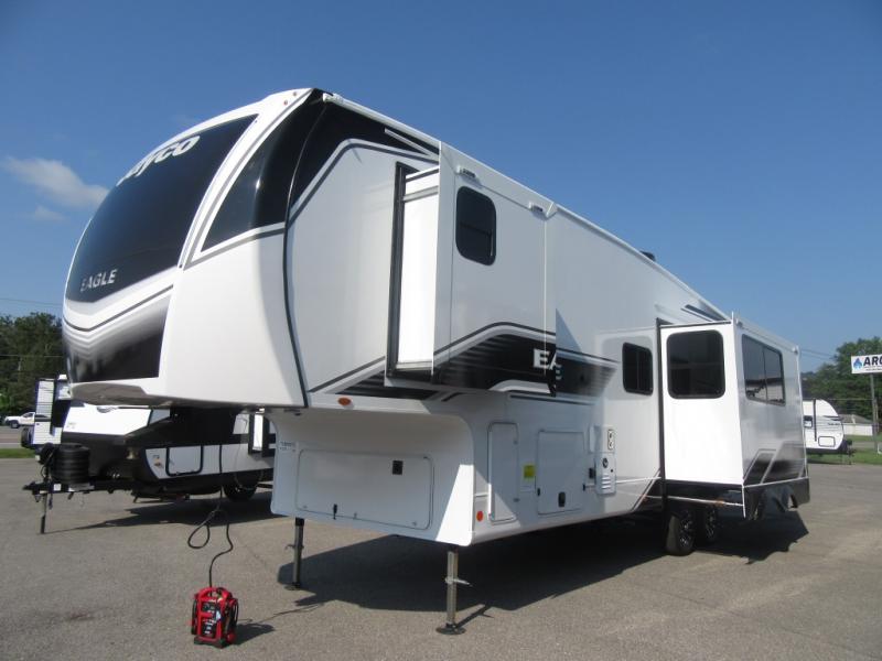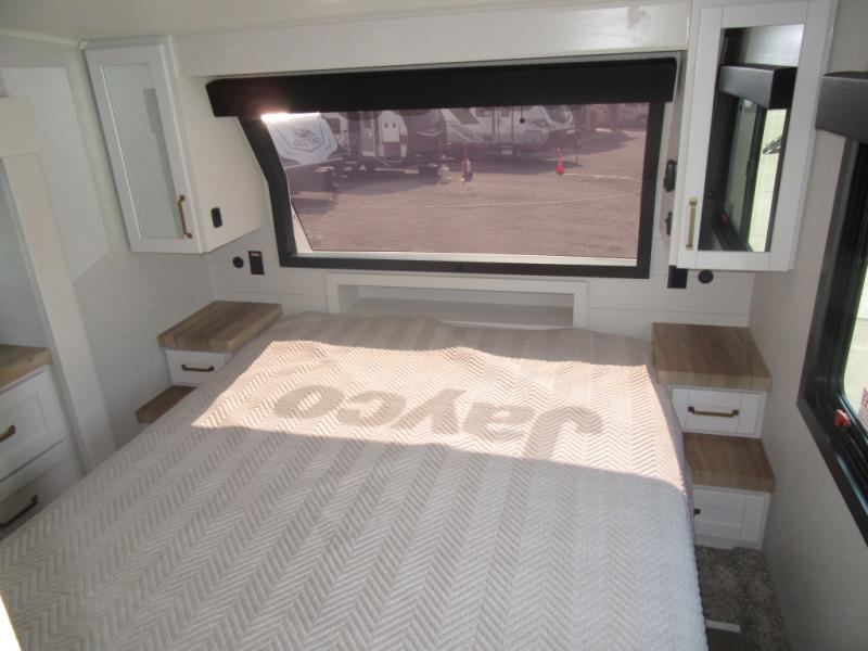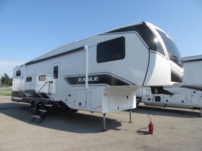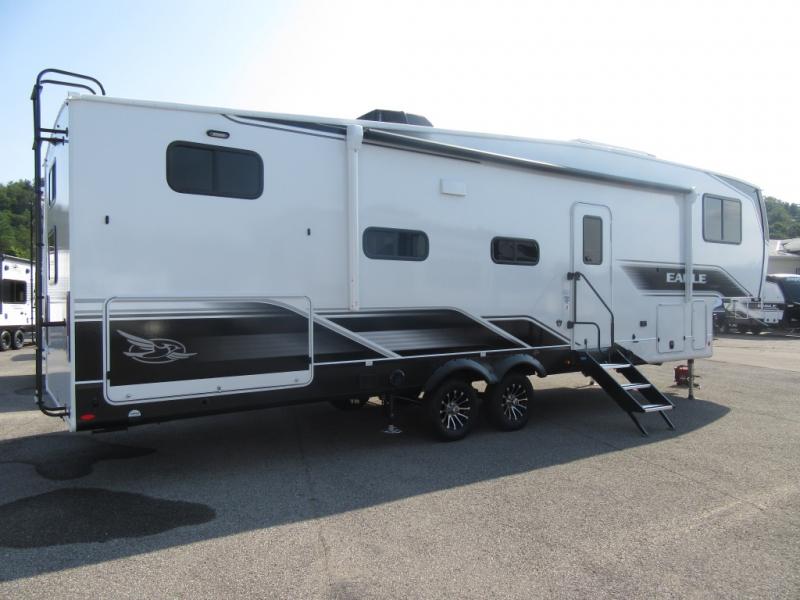 With any Eagle HT fifth wheel or travel trailer by Jayco you will enjoy a smooth drive thanks to the 4 Star Handling Package and MORryde CRE-3000 rubberized suspension. The Customer Value Package includes amenities that are sure to make camping easier than ever, like the 60K on-demand water heater, Keyed-Alike lock system, 15,000 BTU "Whisper Quiet" A/C, and more. Handcrafted door/drawer fronts will make your space feel more like home, along with residential vinyl flooring throughout, GE appliances, and blackout roller shades with reflective side throughout to keep the sun out when you want to sleep in. Each model also includes a NuVo H2O water treatment system with filters included, interior and exterior "Blue Sync" audio connect with MB Quart Sound for your TV and phone, and 100% no floor vents for added comfort and convenience!