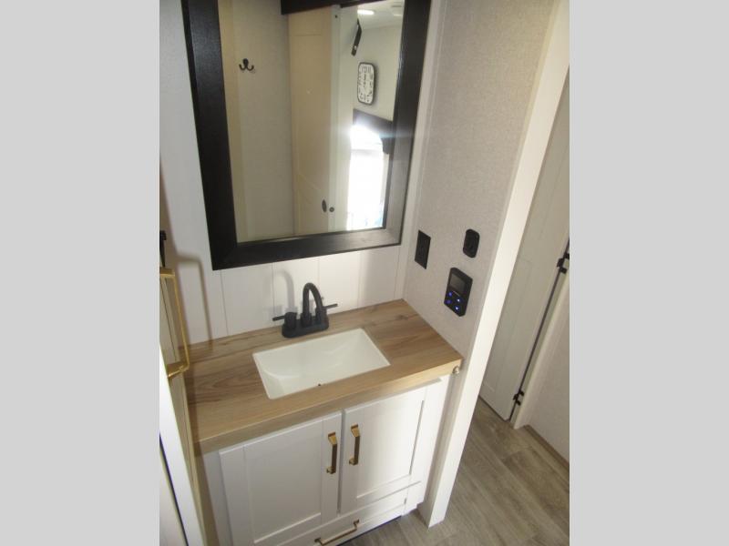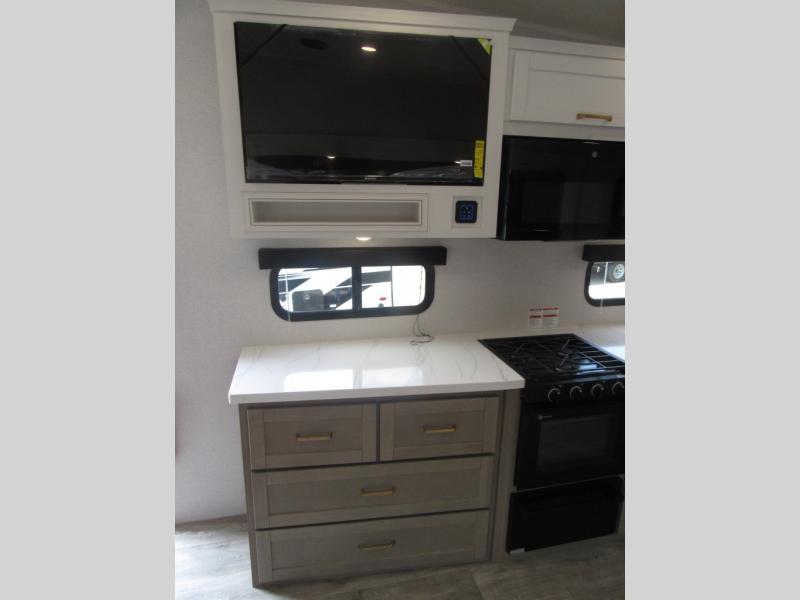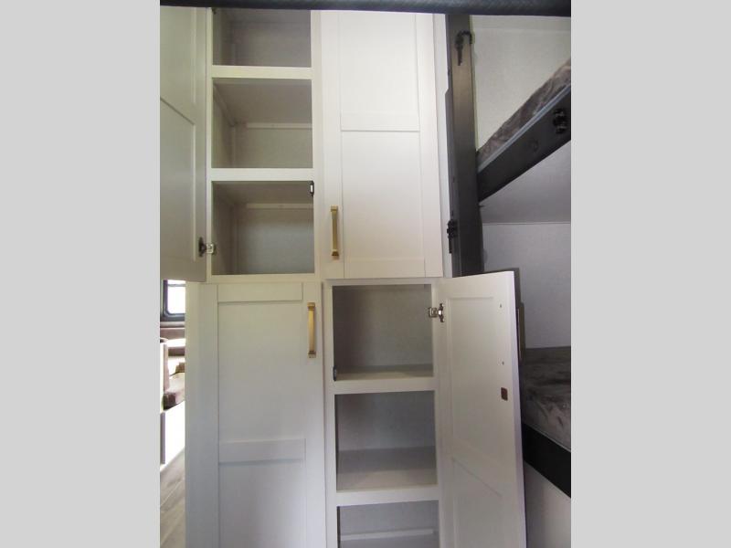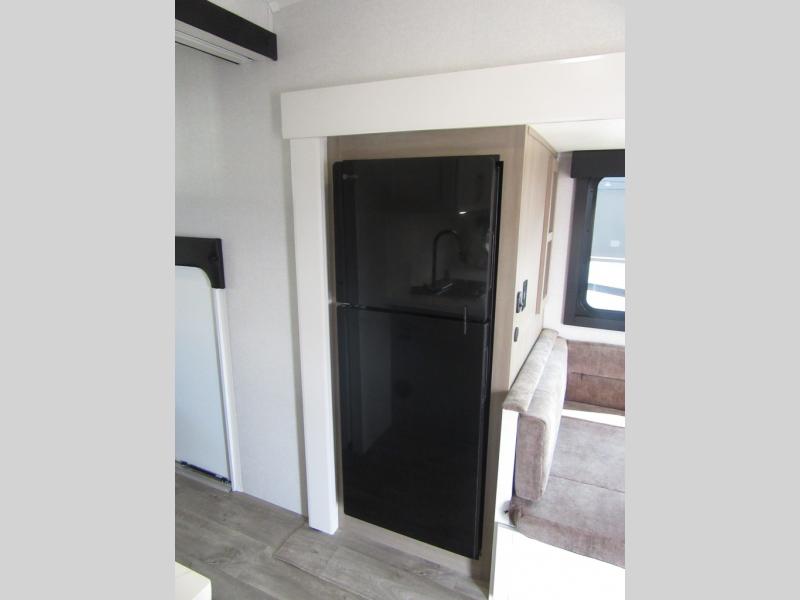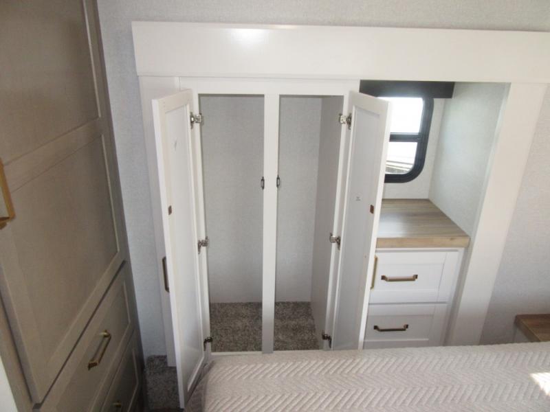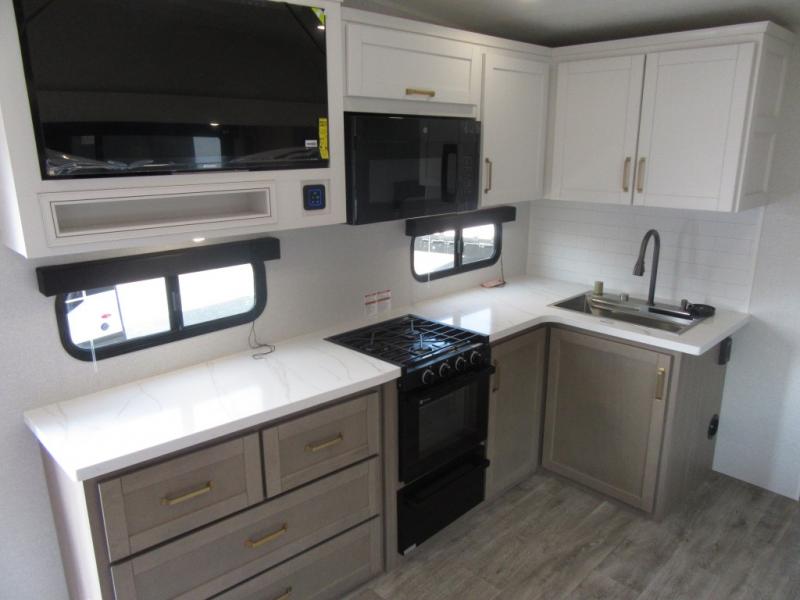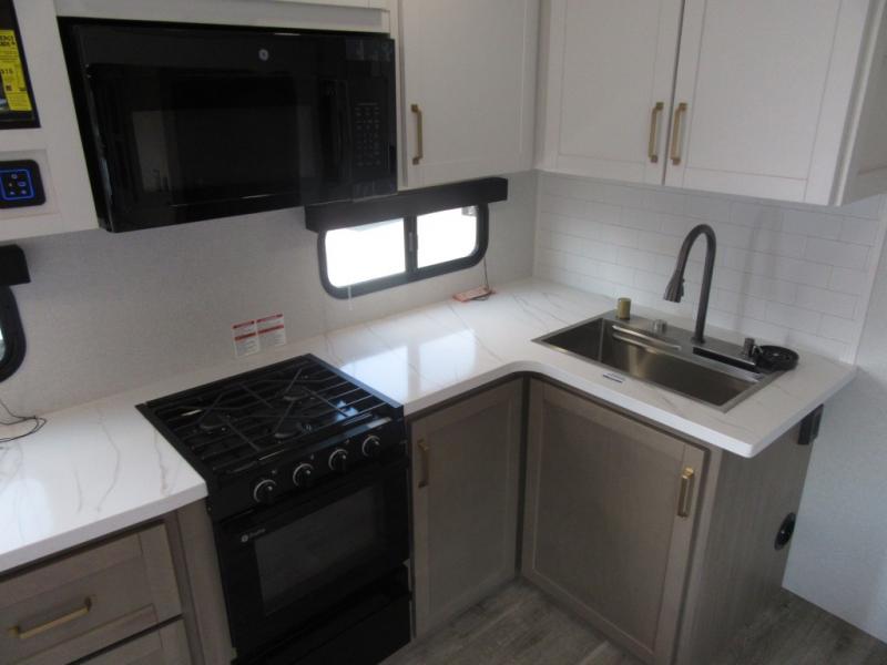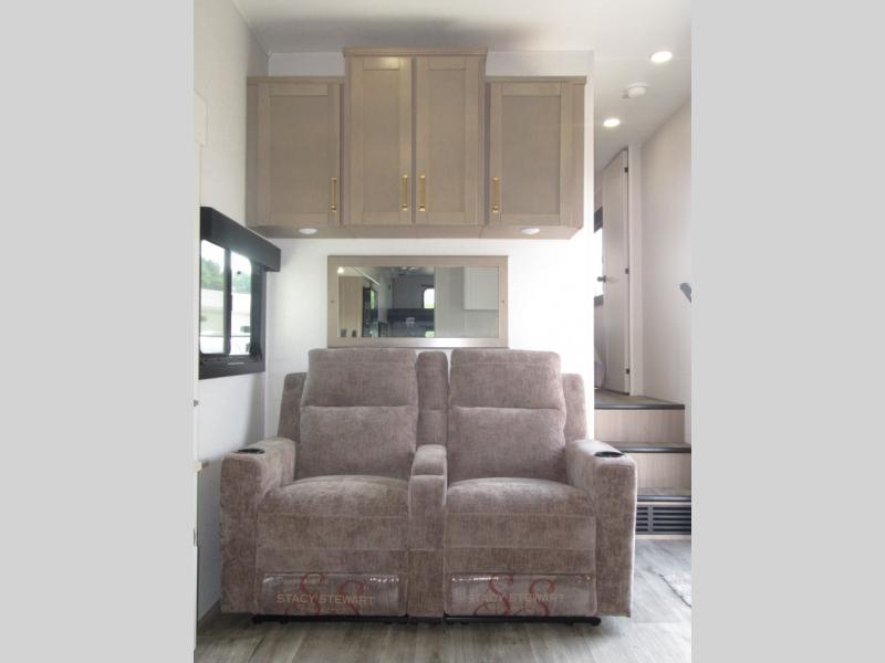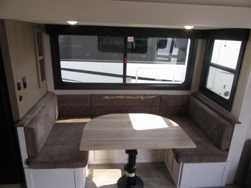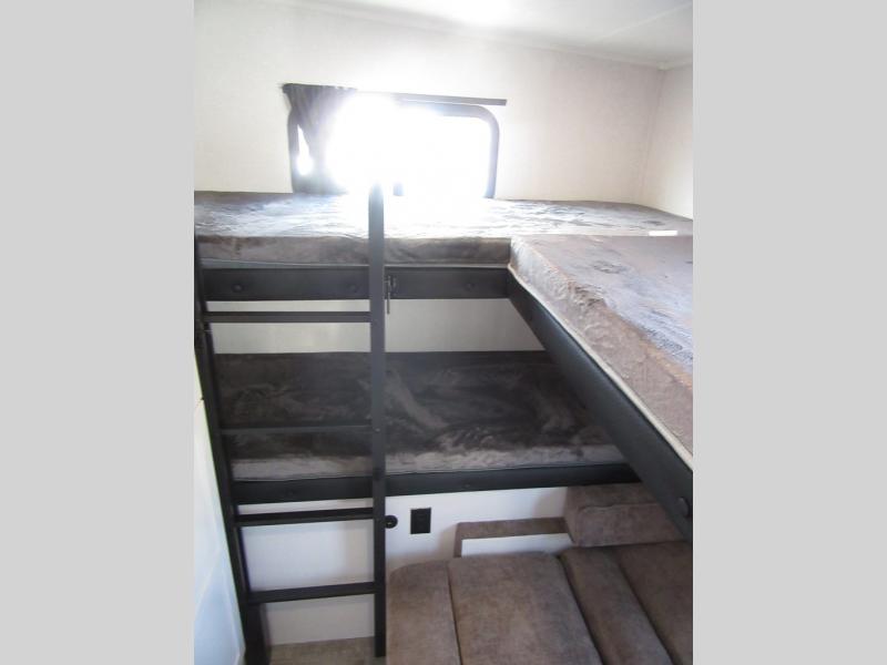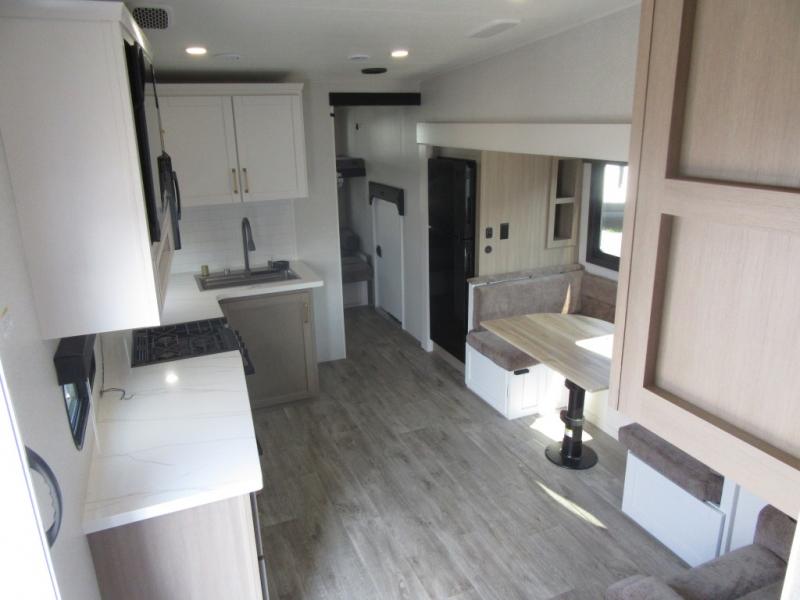 This fifth wheel is not only packed with amenities, but it can sleep up to eight people each night for fun camping trips! The rear private bunkhouse includes bunk beds plus a third bunk above a jack-knife sofa, and there is a bike storage door here so you can easily pack in gear. You can claim the front private bedroom all to yourselves with an Olympic bed, a wardrobe slide plus a second wardrobe with washer and dryer prep. Everyone can come together in the combined kitchen and living room that features a U-shaped dinette across from the TV and a theater seat for added comfort!