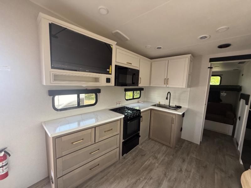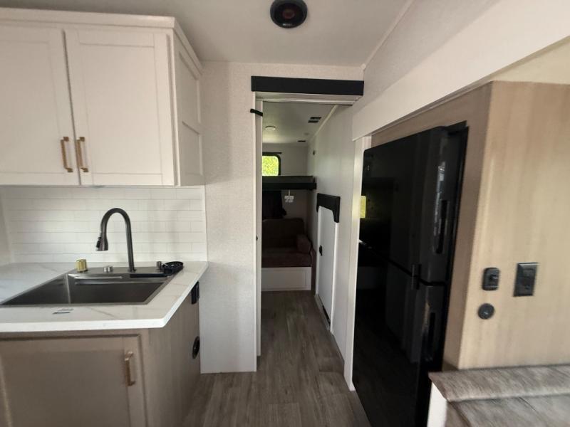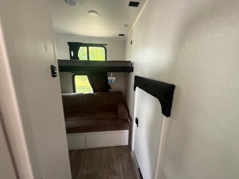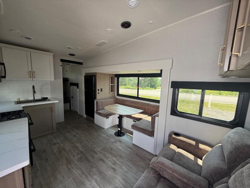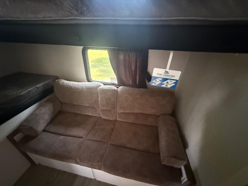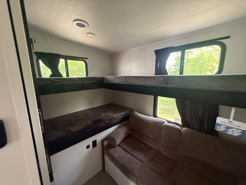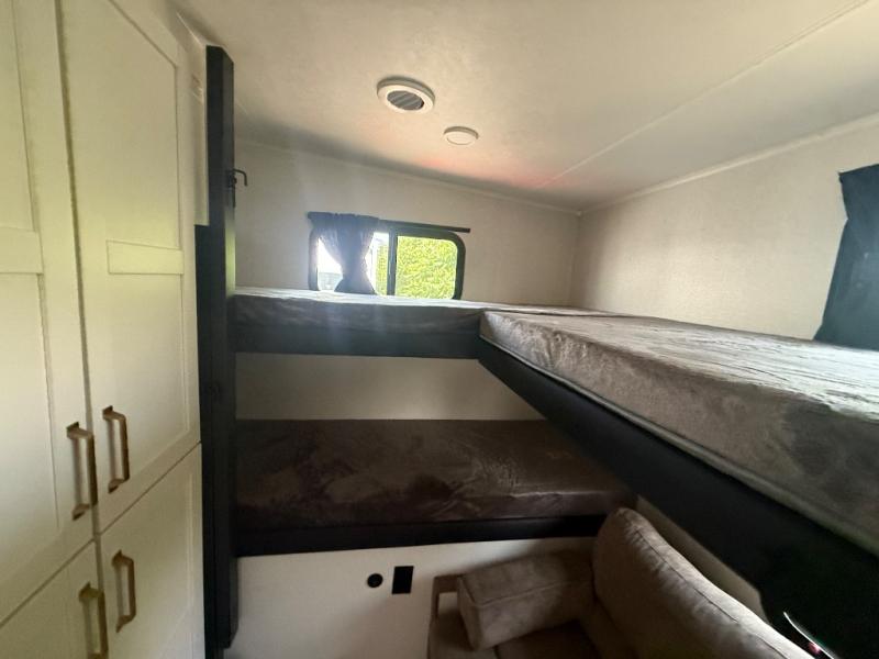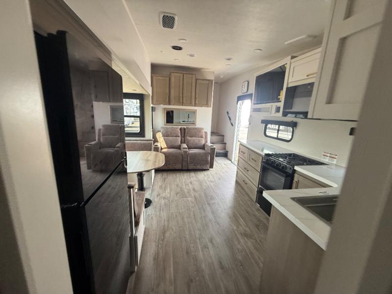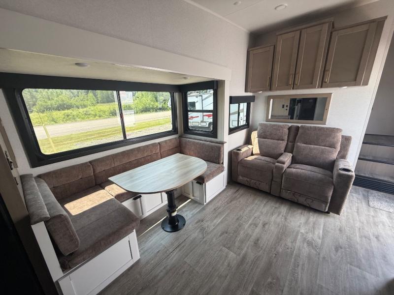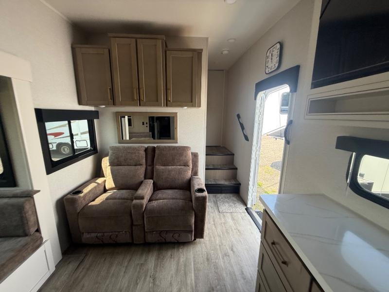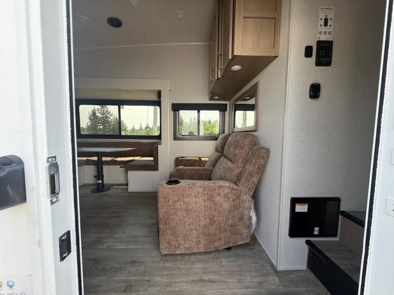 This fifth wheel is not only packed with amenities, but it can sleep up to eight people each night for fun camping trips! The rear private bunkhouse includes bunk beds plus a third bunk above a jack-knife sofa, and there is a bike storage door here so you can easily pack in gear. You can claim the front private bedroom all to yourselves with an Olympic bed, a wardrobe slide plus a second wardrobe with washer and dryer prep. Everyone can come together in the combined kitchen and living room that features a U-shaped dinette across from the TV and a theater seat for added comfort!