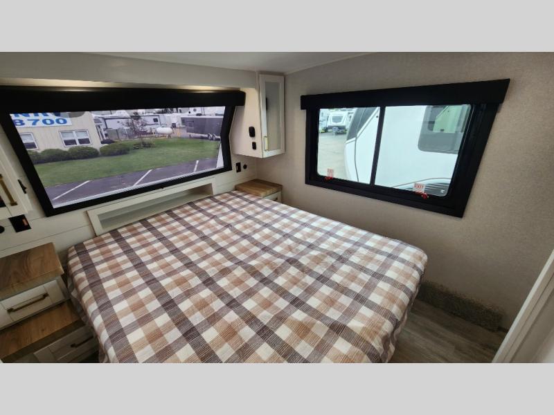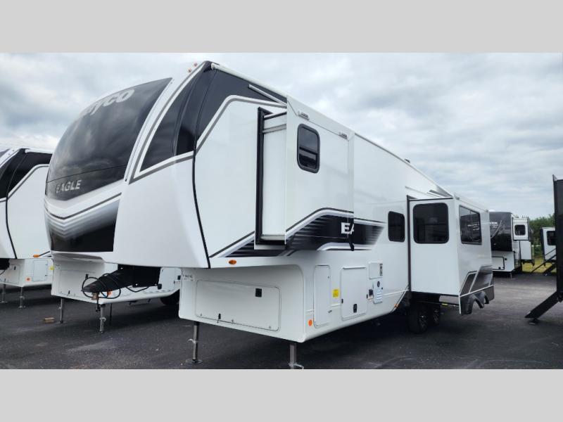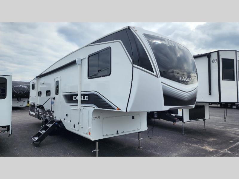 With any Eagle HT fifth wheel or travel trailer by Jayco you will enjoy a smooth drive thanks to the 4 Star Handling Package and MORryde CRE-3000 rubberized suspension. The Customer Value Package includes amenities that are sure to make camping easier than ever, like the 60K on-demand water heater, Keyed-Alike lock system, 15,000 BTU "Whisper Quiet" A/C, and more. Handcrafted door/drawer fronts will make your space feel more like home, along with residential vinyl flooring throughout, GE appliances, and blackout roller shades with reflective side throughout to keep the sun out when you want to sleep in. Each model also includes a NuVo H2O water treatment system with filters included, interior and exterior "Blue Sync" audio connect with MB Quart Sound for your TV and phone, and 100% no floor vents for added comfort and convenience!