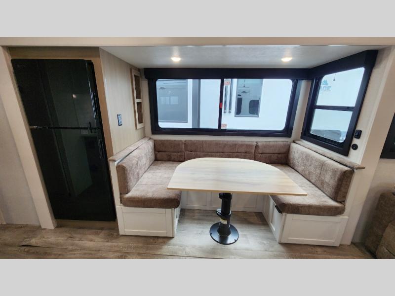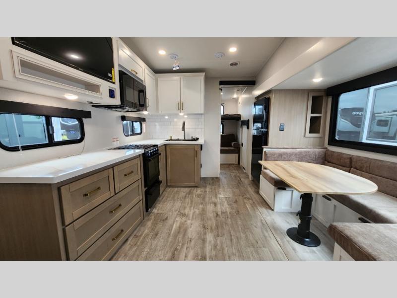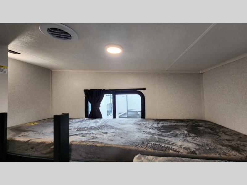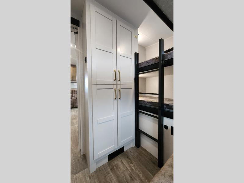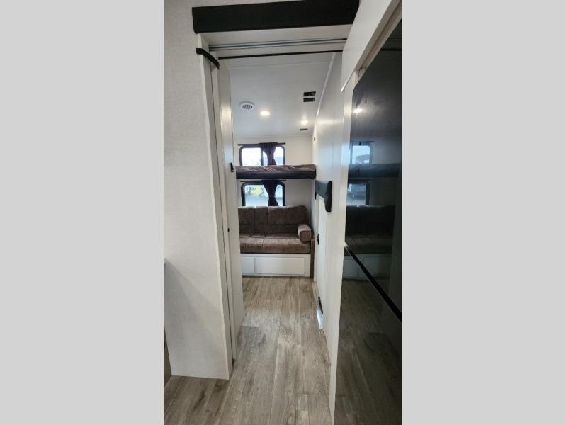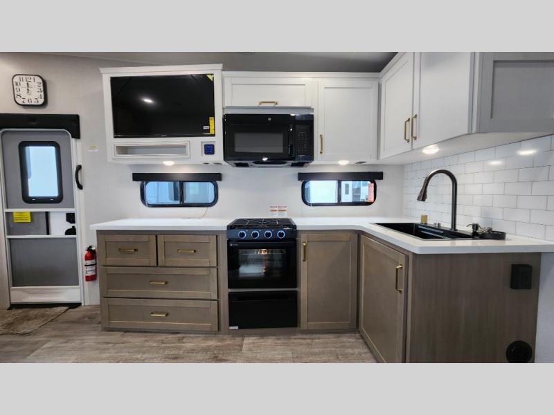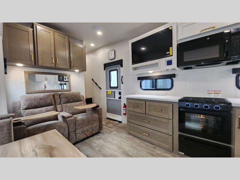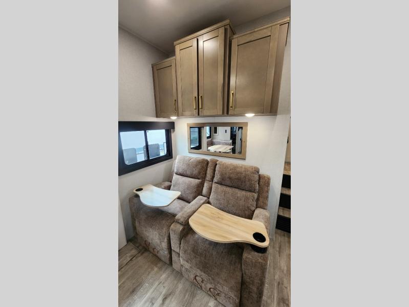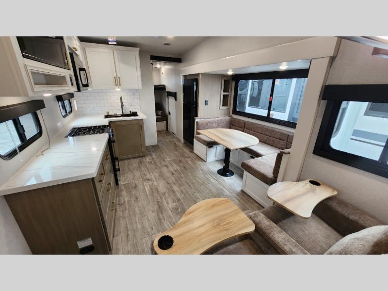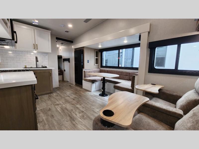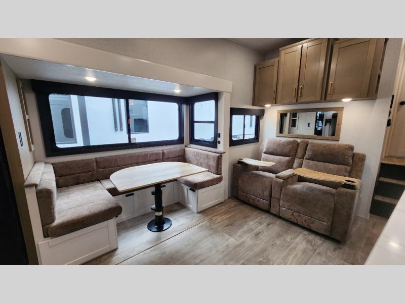 This fifth wheel is not only packed with amenities, but it can sleep up to eight people each night for fun camping trips! The rear private bunkhouse includes bunk beds plus a third bunk above a jack-knife sofa, and there is a bike storage door here so you can easily pack in gear. You can claim the front private bedroom all to yourselves with an Olympic bed, a wardrobe slide plus a second wardrobe with washer and dryer prep. Everyone can come together in the combined kitchen and living room that features a U-shaped dinette across from the TV and a theater seat for added comfort!