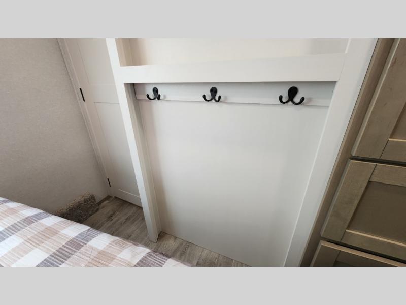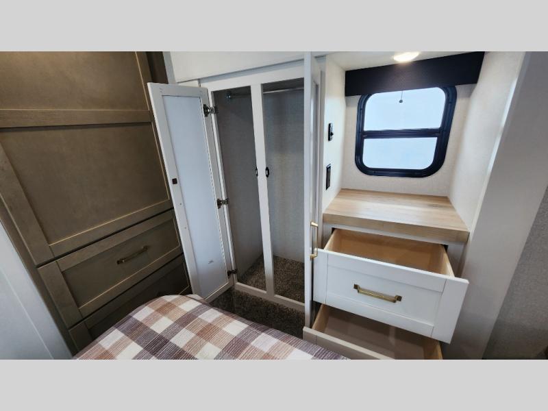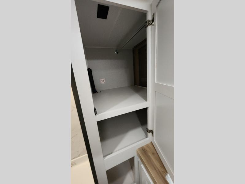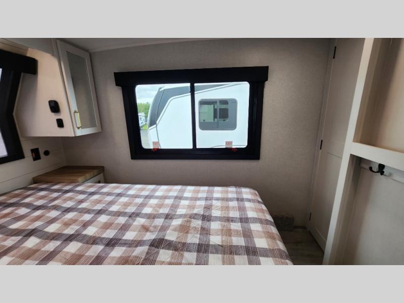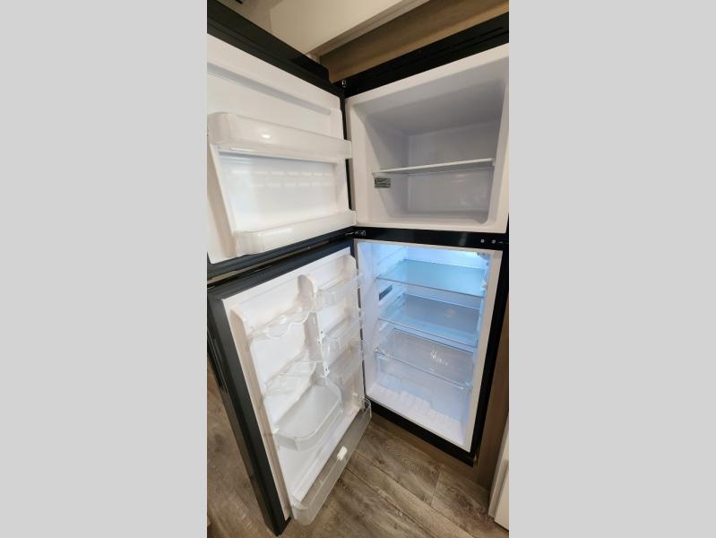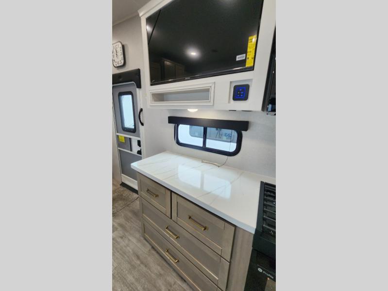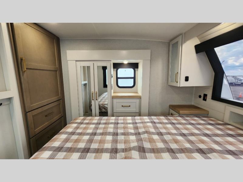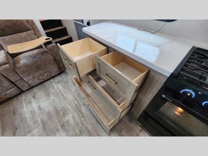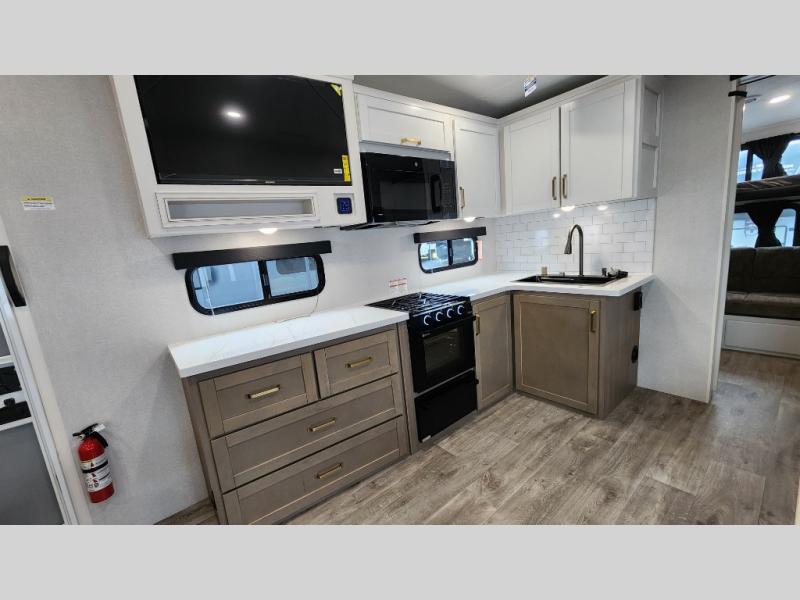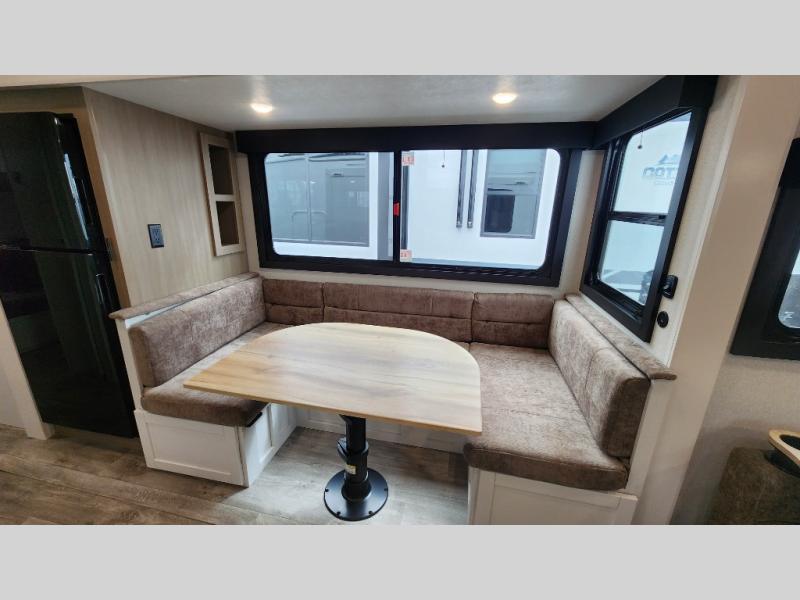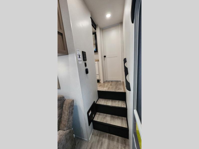 This fifth wheel is not only packed with amenities, but it can sleep up to eight people each night for fun camping trips! The rear private bunkhouse includes bunk beds plus a third bunk above a jack-knife sofa, and there is a bike storage door here so you can easily pack in gear. You can claim the front private bedroom all to yourselves with an Olympic bed, a wardrobe slide plus a second wardrobe with washer and dryer prep. Everyone can come together in the combined kitchen and living room that features a U-shaped dinette across from the TV and a theater seat for added comfort!