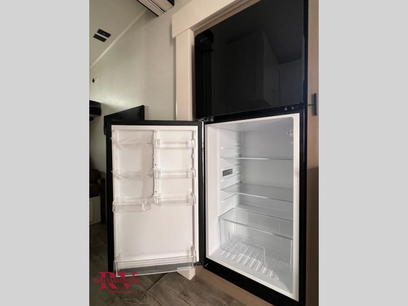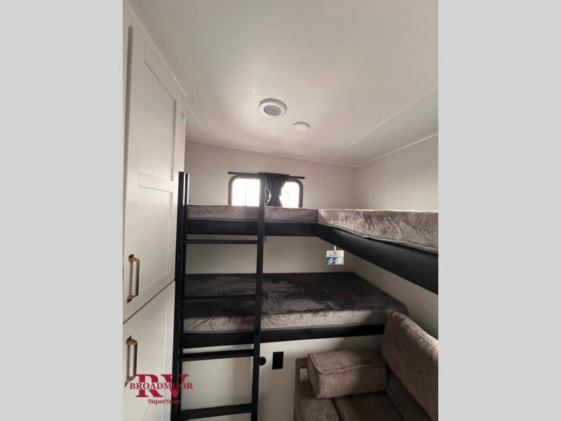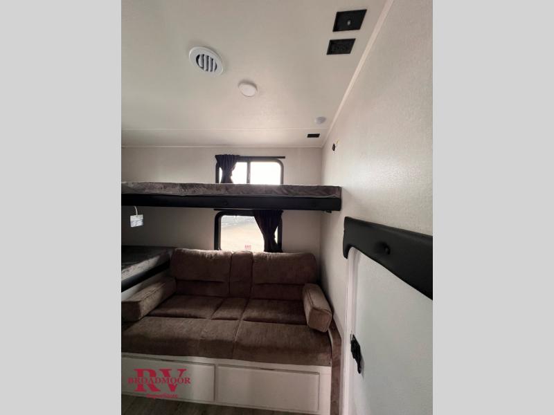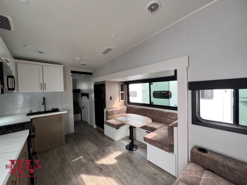 This fifth wheel is not only packed with amenities, but it can sleep up to eight people each night for fun camping trips! The rear private bunkhouse includes bunk beds plus a third bunk above a jack-knife sofa, and there is a bike storage door here so you can easily pack in gear. You can claim the front private bedroom all to yourselves with an Olympic bed, a wardrobe slide plus a second wardrobe with washer and dryer prep. Everyone can come together in the combined kitchen and living room that features a U-shaped dinette across from the TV and a theater seat for added comfort!