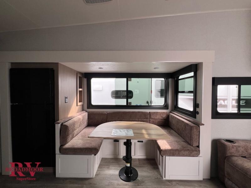 With any Eagle HT fifth wheel or travel trailer by Jayco you will enjoy a smooth drive thanks to the 4 Star Handling Package and MORryde CRE-3000 rubberized suspension. The Customer Value Package includes amenities that are sure to make camping easier than ever, like the 60K on-demand water heater, Keyed-Alike lock system, 15,000 BTU "Whisper Quiet" A/C, and more. Handcrafted door/drawer fronts will make your space feel more like home, along with residential vinyl flooring throughout, GE appliances, and blackout roller shades with reflective side throughout to keep the sun out when you want to sleep in. Each model also includes a NuVo H2O water treatment system with filters included, interior and exterior "Blue Sync" audio connect with MB Quart Sound for your TV and phone, and 100% no floor vents for added comfort and convenience!