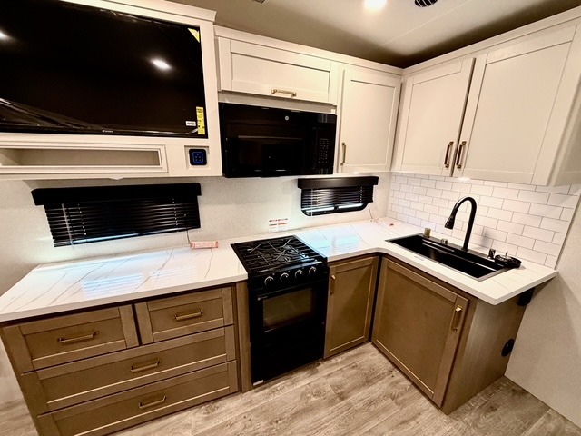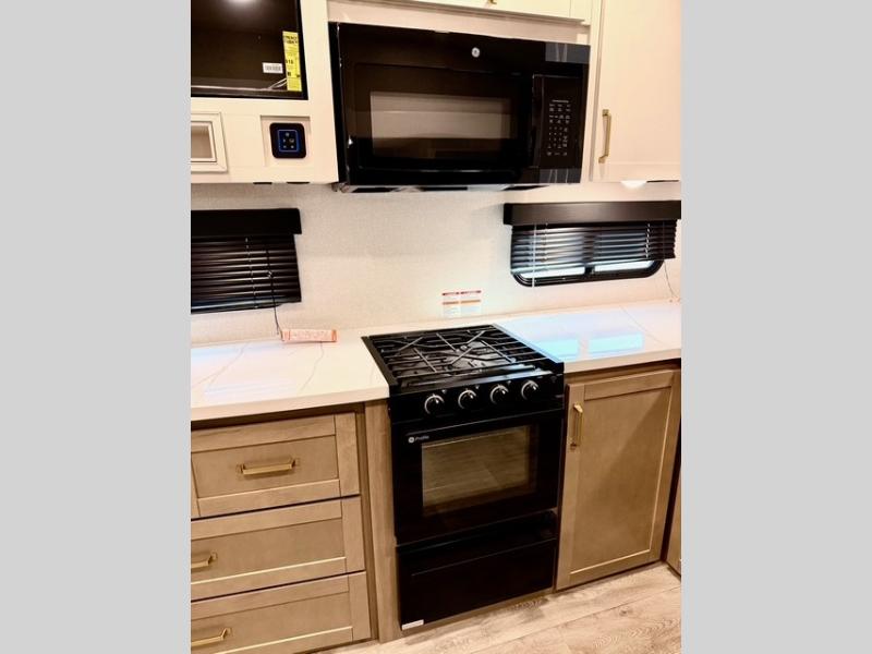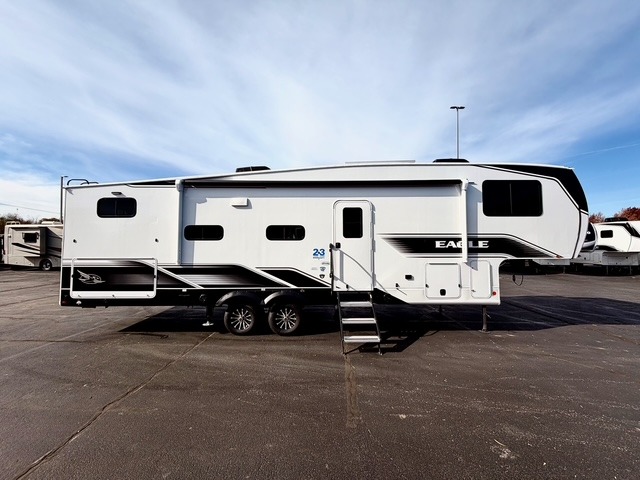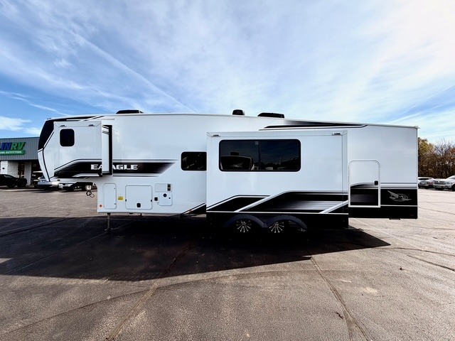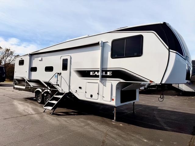 With any Eagle HT fifth wheel or travel trailer by Jayco you will enjoy a smooth drive thanks to the 4 Star Handling Package and MORryde CRE-3000 rubberized suspension. The Customer Value Package includes amenities that are sure to make camping easier than ever, like the 60K on-demand water heater, Keyed-Alike lock system, 15,000 BTU "Whisper Quiet" A/C, and more. Handcrafted door/drawer fronts will make your space feel more like home, along with residential vinyl flooring throughout, GE appliances, and blackout roller shades with reflective side throughout to keep the sun out when you want to sleep in. Each model also includes a NuVo H2O water treatment system with filters included, interior and exterior "Blue Sync" audio connect with MB Quart Sound for your TV and phone, and 100% no floor vents for added comfort and convenience!