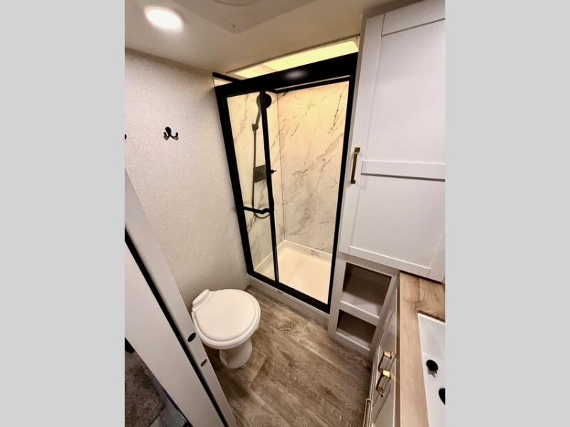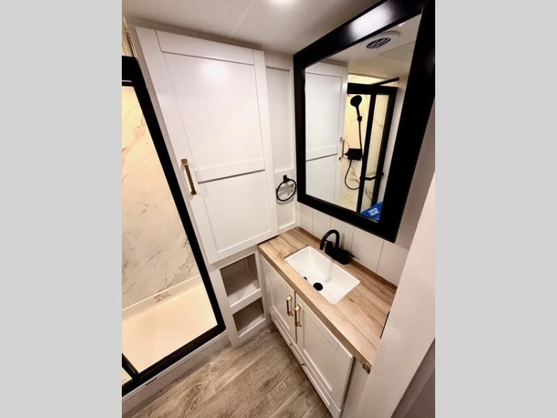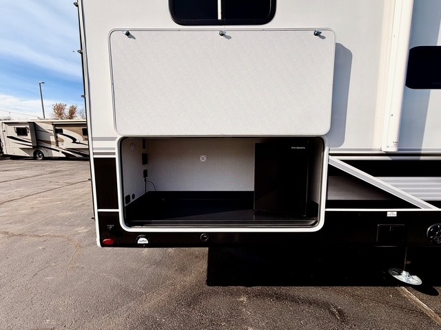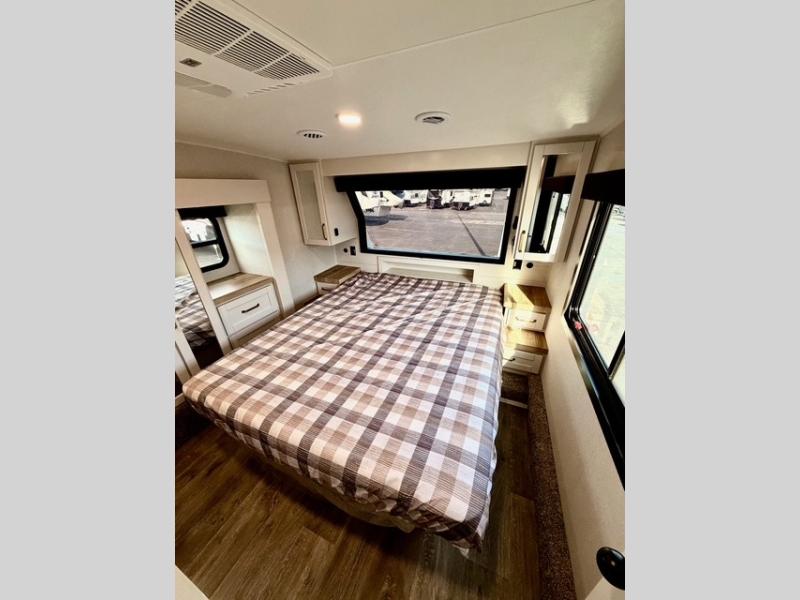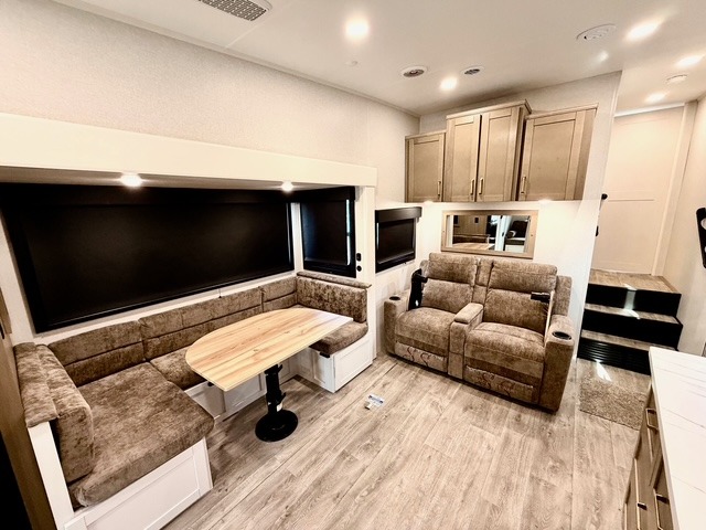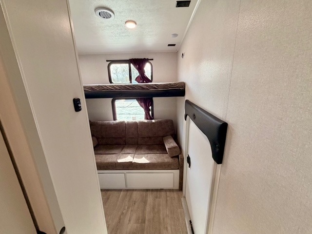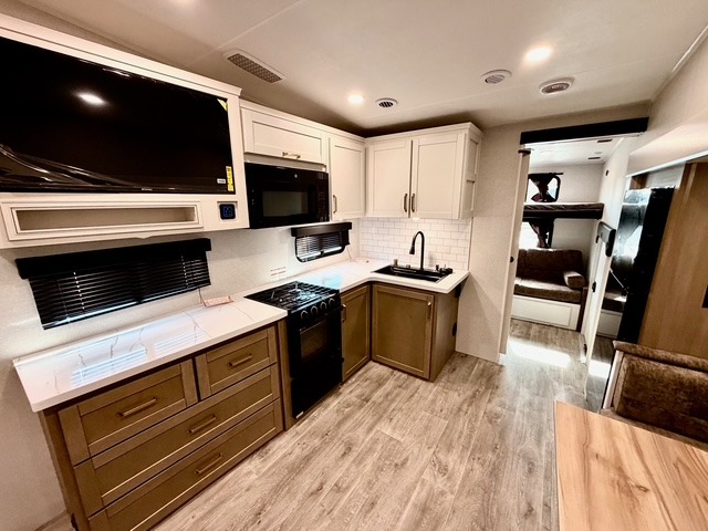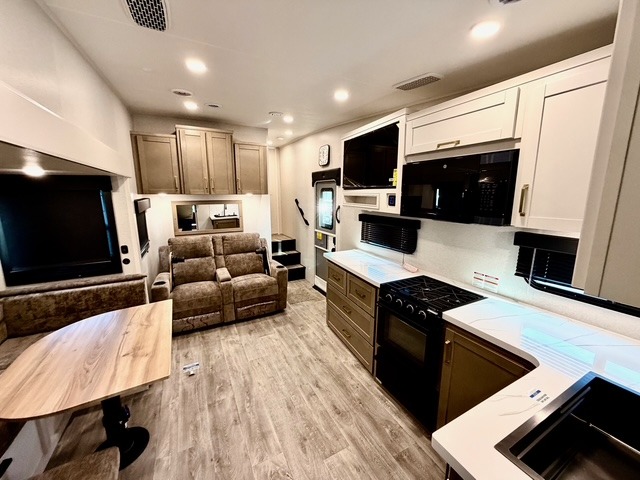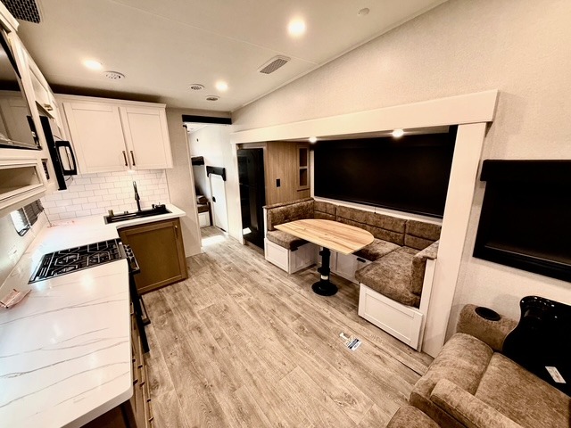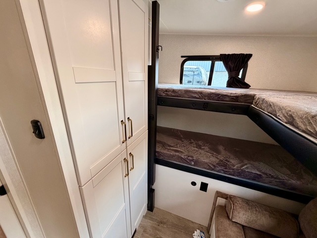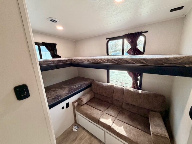 This fifth wheel is not only packed with amenities, but it can sleep up to eight people each night for fun camping trips! The rear private bunkhouse includes bunk beds plus a third bunk above a jack-knife sofa, and there is a bike storage door here so you can easily pack in gear. You can claim the front private bedroom all to yourselves with an Olympic bed, a wardrobe slide plus a second wardrobe with washer and dryer prep. Everyone can come together in the combined kitchen and living room that features a U-shaped dinette across from the TV and a theater seat for added comfort!
