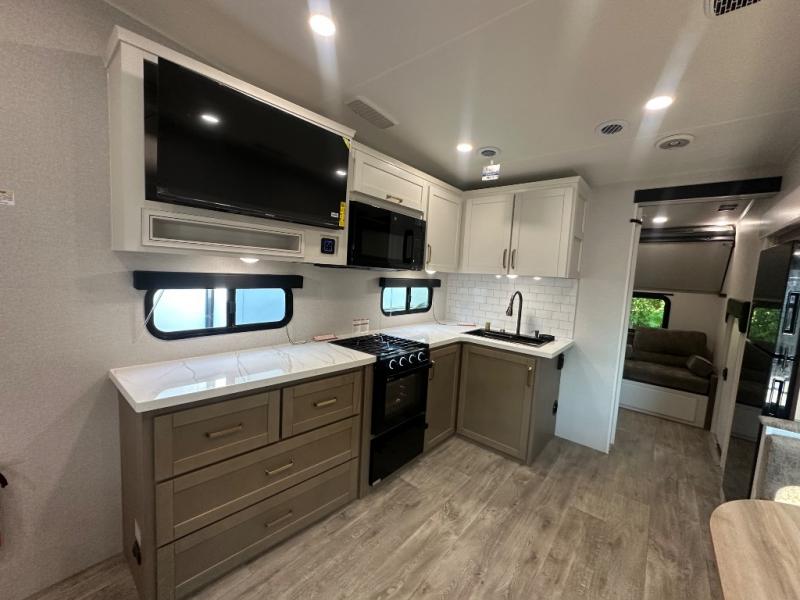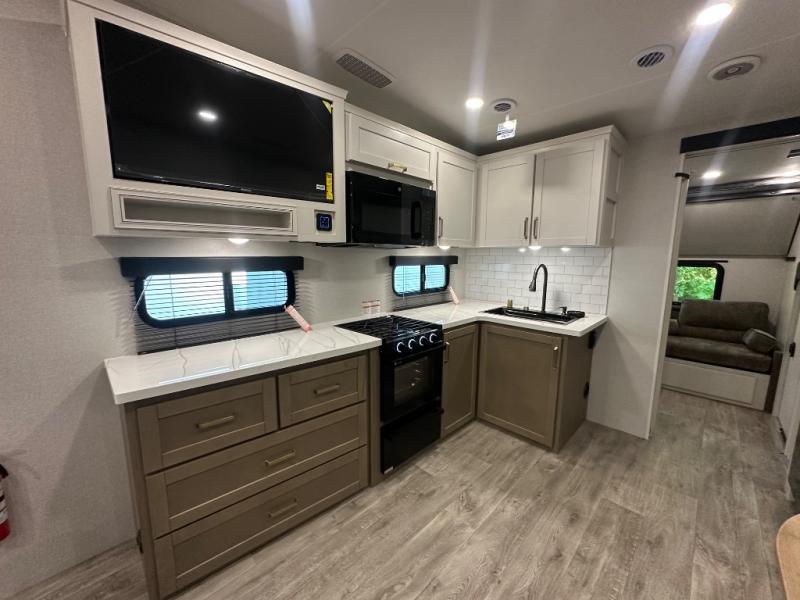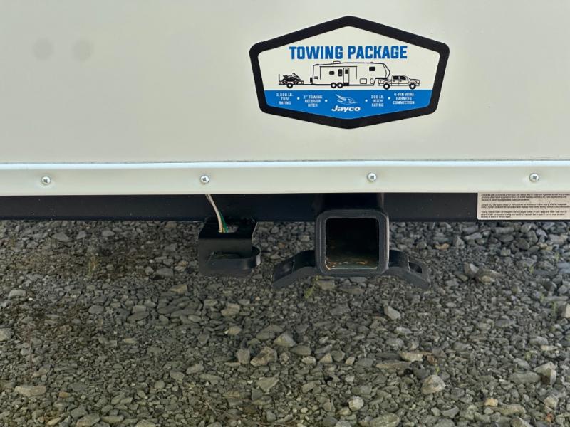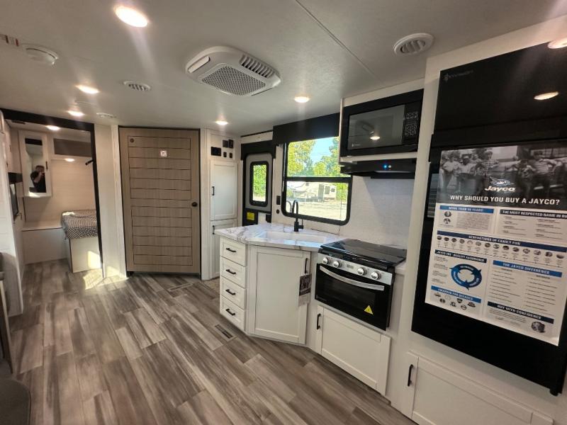 With any Eagle HT fifth wheel or travel trailer by Jayco you will enjoy a smooth drive thanks to the 4 Star Handling Package and MORryde CRE-3000 rubberized suspension. The Customer Value Package includes amenities that are sure to make camping easier than ever, like the 60K on-demand water heater, Keyed-Alike lock system, 15,000 BTU "Whisper Quiet" A/C, and more. Handcrafted door/drawer fronts will make your space feel more like home, along with residential vinyl flooring throughout, GE appliances, and blackout roller shades with reflective side throughout to keep the sun out when you want to sleep in. Each model also includes a NuVo H2O water treatment system with filters included, interior and exterior "Blue Sync" audio connect with MB Quart Sound for your TV and phone, and 100% no floor vents for added comfort and convenience!