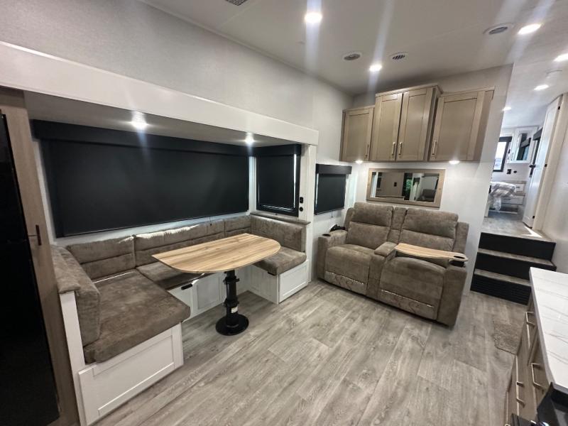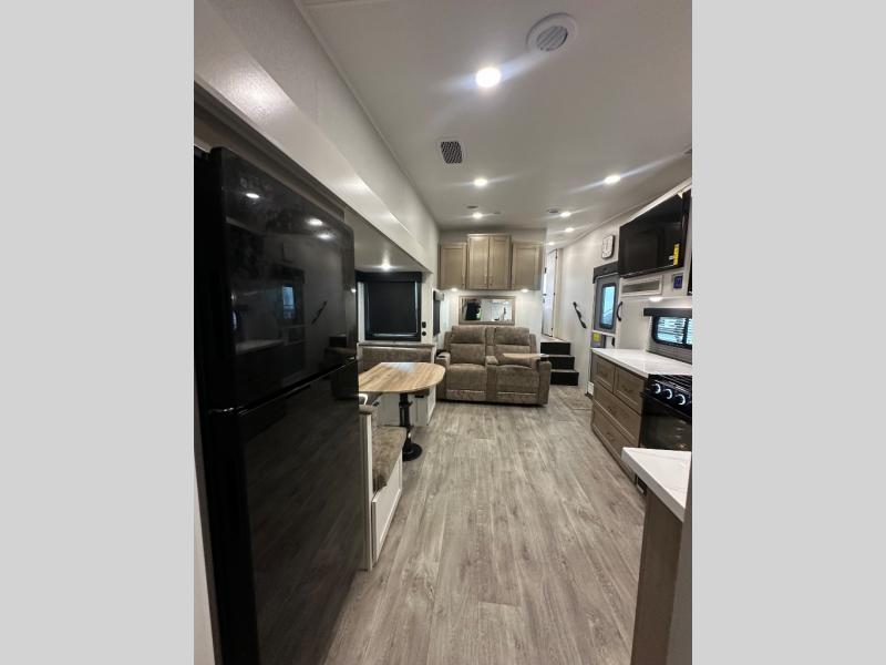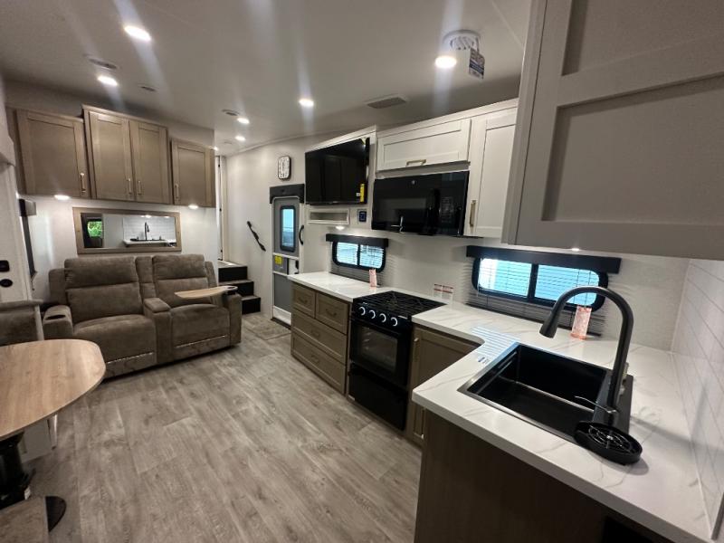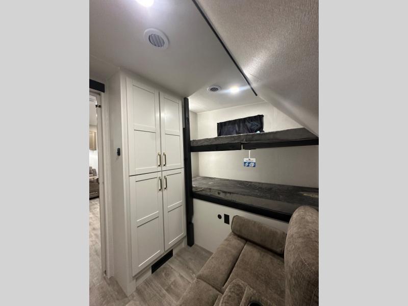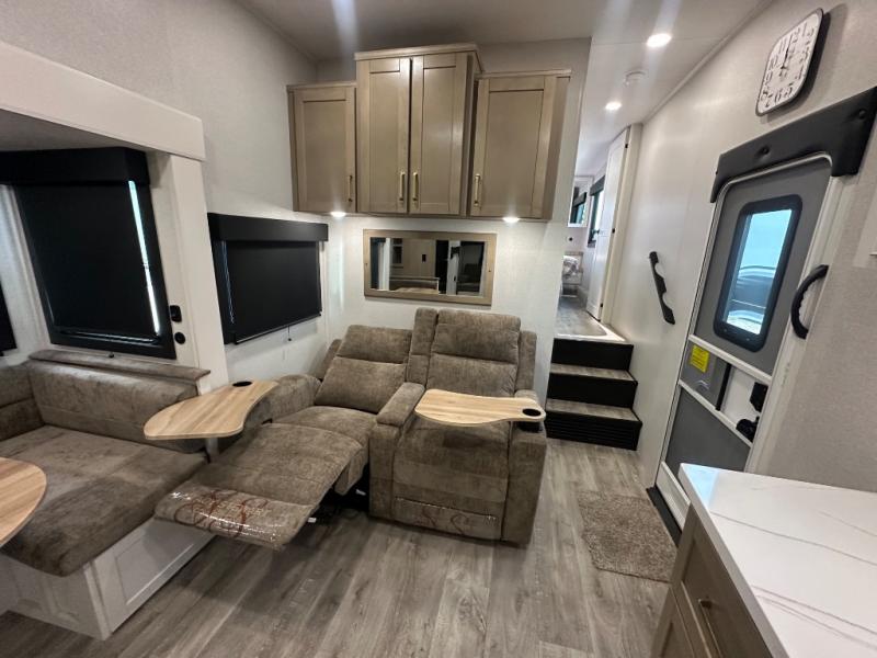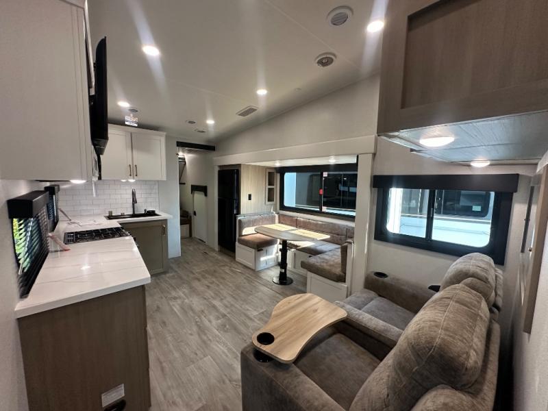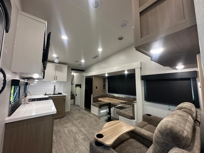 This fifth wheel is not only packed with amenities, but it can sleep up to eight people each night for fun camping trips! The rear private bunkhouse includes bunk beds plus a third bunk above a jack-knife sofa, and there is a bike storage door here so you can easily pack in gear. You can claim the front private bedroom all to yourselves with an Olympic bed, a wardrobe slide plus a second wardrobe with washer and dryer prep. Everyone can come together in the combined kitchen and living room that features a U-shaped dinette across from the TV and a theater seat for added comfort!