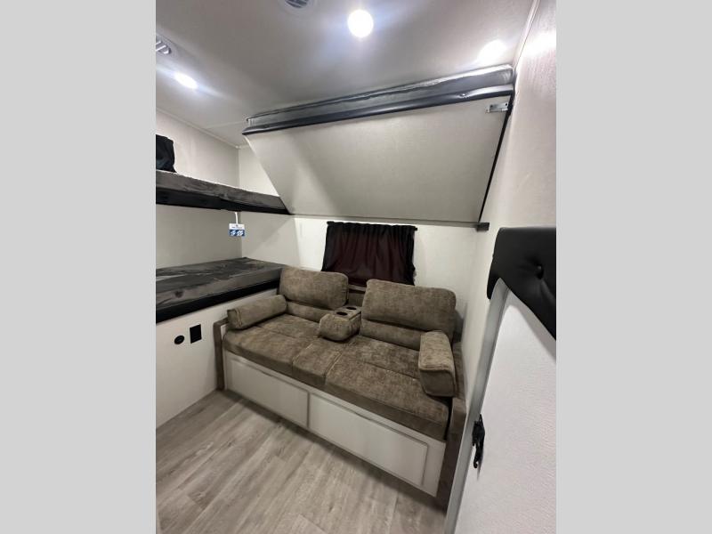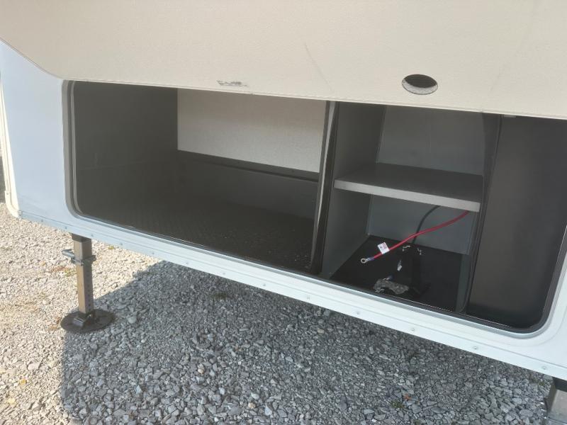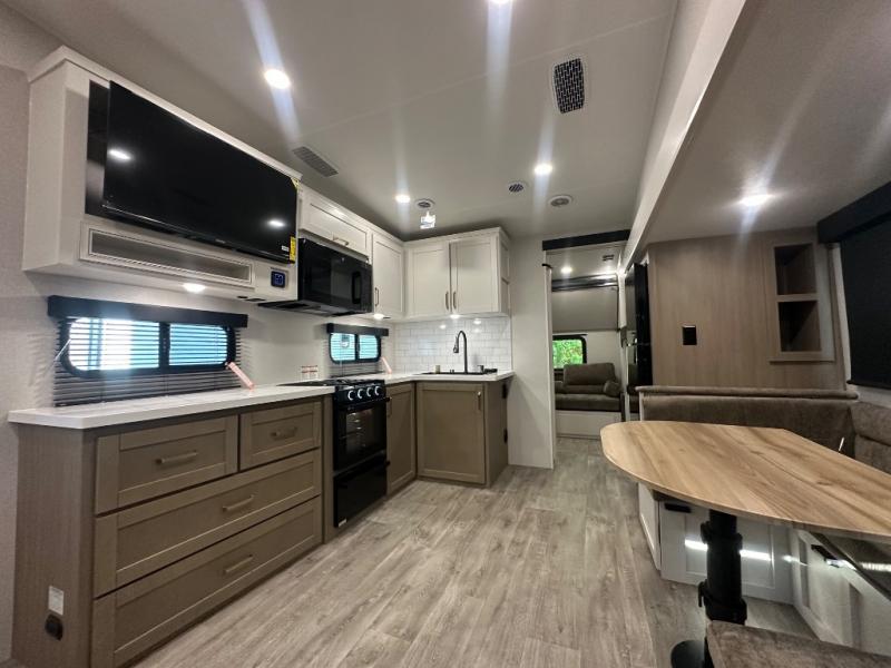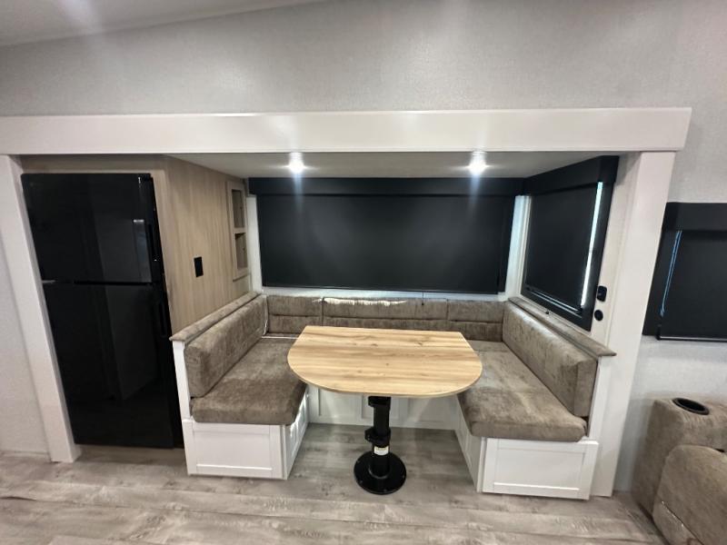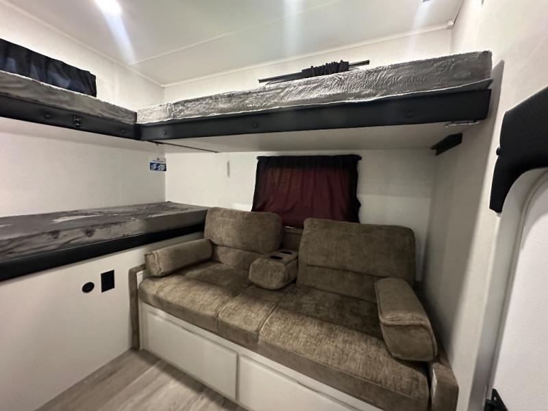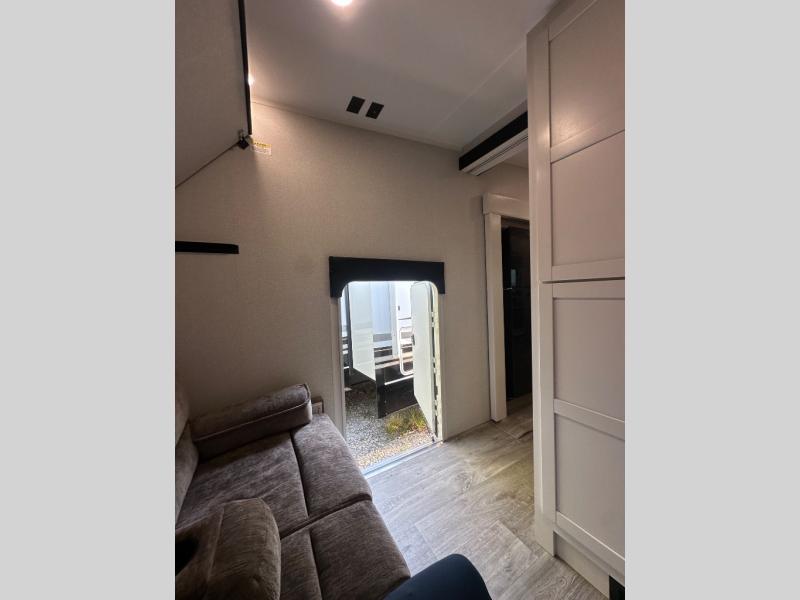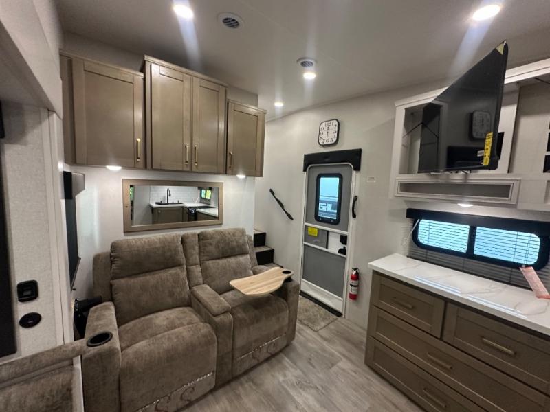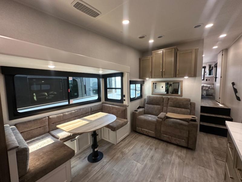 This fifth wheel is not only packed with amenities, but it can sleep up to eight people each night for fun camping trips! The rear private bunkhouse includes bunk beds plus a third bunk above a jack-knife sofa, and there is a bike storage door here so you can easily pack in gear. You can claim the front private bedroom all to yourselves with an Olympic bed, a wardrobe slide plus a second wardrobe with washer and dryer prep. Everyone can come together in the combined kitchen and living room that features a U-shaped dinette across from the TV and a theater seat for added comfort!