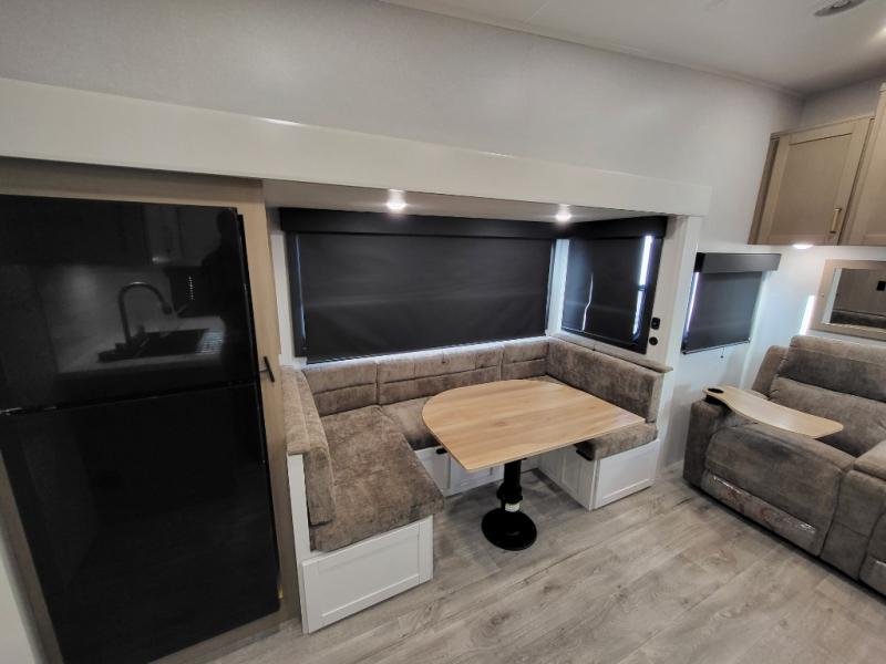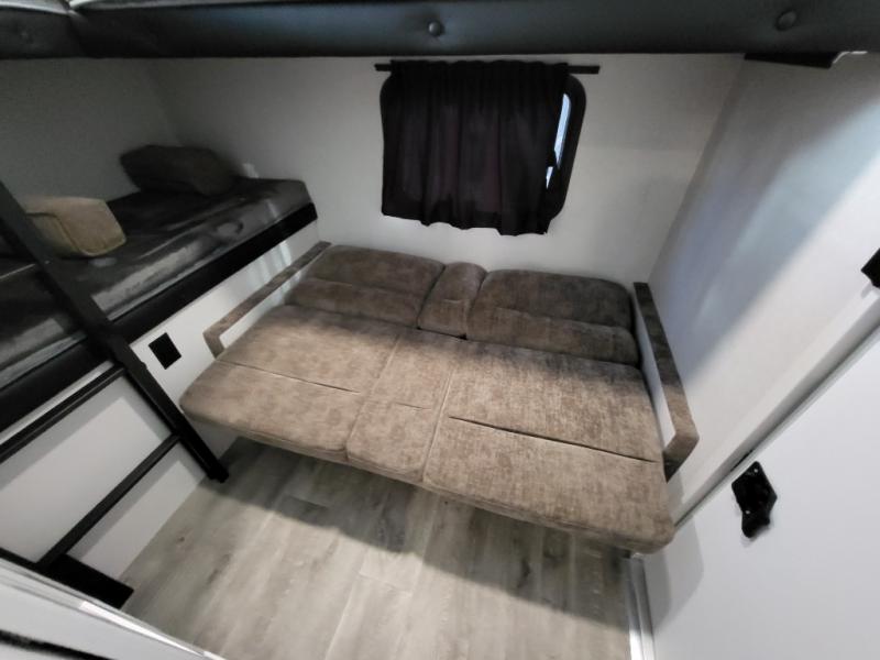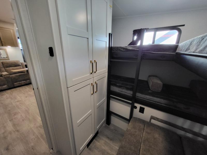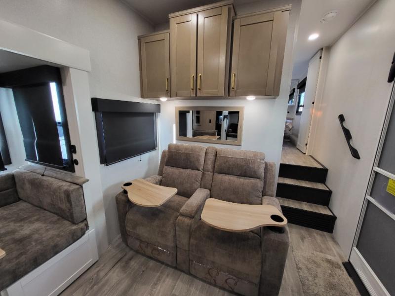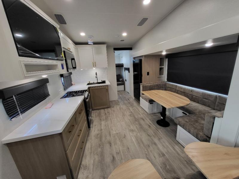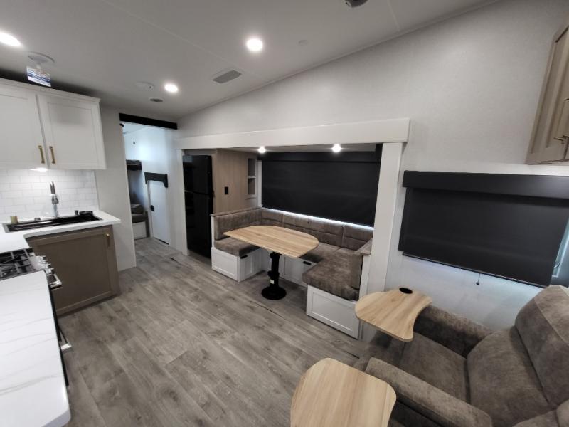 This fifth wheel is not only packed with amenities, but it can sleep up to eight people each night for fun camping trips! The rear private bunkhouse includes bunk beds plus a third bunk above a jack-knife sofa, and there is a bike storage door here so you can easily pack in gear. You can claim the front private bedroom all to yourselves with an Olympic bed, a wardrobe slide plus a second wardrobe with washer and dryer prep. Everyone can come together in the combined kitchen and living room that features a U-shaped dinette across from the TV and a theater seat for added comfort!