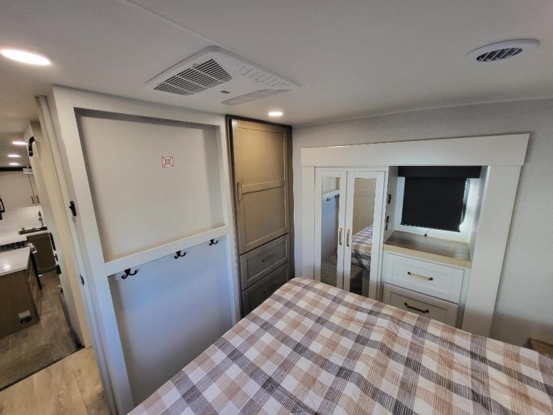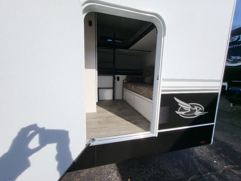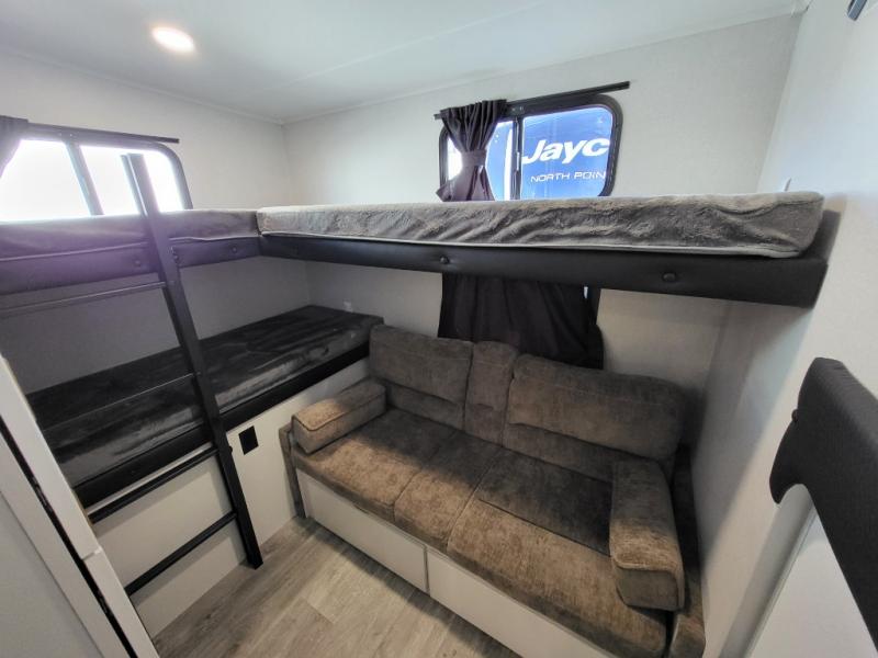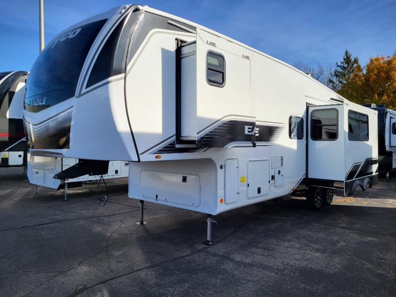 With any Eagle HT fifth wheel or travel trailer by Jayco you will enjoy a smooth drive thanks to the 4 Star Handling Package and MORryde CRE-3000 rubberized suspension. The Customer Value Package includes amenities that are sure to make camping easier than ever, like the 60K on-demand water heater, Keyed-Alike lock system, 15,000 BTU "Whisper Quiet" A/C, and more. Handcrafted door/drawer fronts will make your space feel more like home, along with residential vinyl flooring throughout, GE appliances, and blackout roller shades with reflective side throughout to keep the sun out when you want to sleep in. Each model also includes a NuVo H2O water treatment system with filters included, interior and exterior "Blue Sync" audio connect with MB Quart Sound for your TV and phone, and 100% no floor vents for added comfort and convenience!