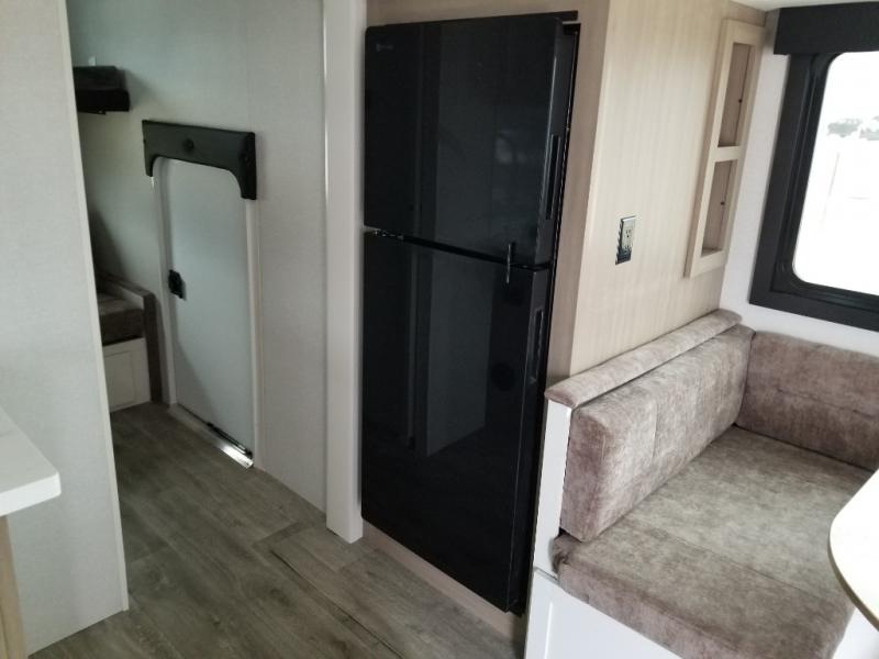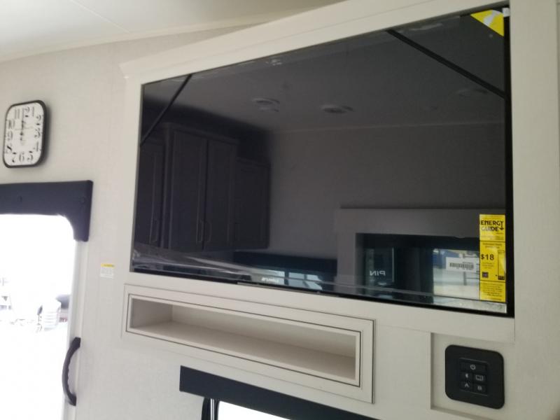 This fifth wheel is not only packed with amenities, but it can sleep up to eight people each night for fun camping trips! The rear private bunkhouse includes bunk beds plus a third bunk above a jack-knife sofa, and there is a bike storage door here so you can easily pack in gear. You can claim the front private bedroom all to yourselves with an Olympic bed, a wardrobe slide plus a second wardrobe with washer and dryer prep. Everyone can come together in the combined kitchen and living room that features a U-shaped dinette across from the TV and a theater seat for added comfort!