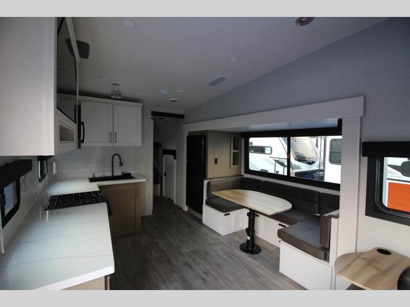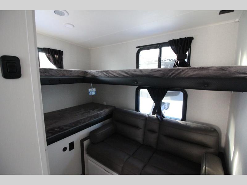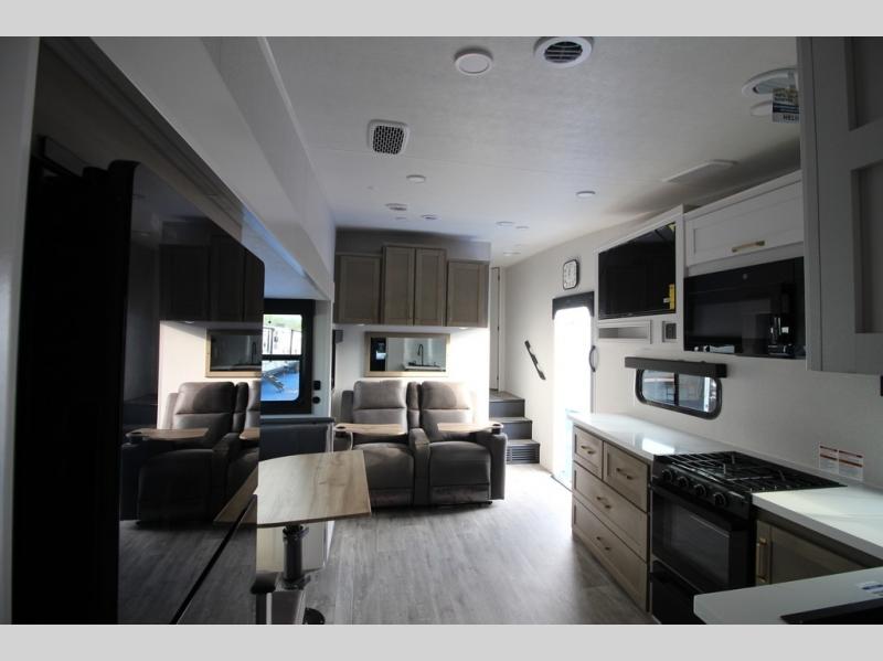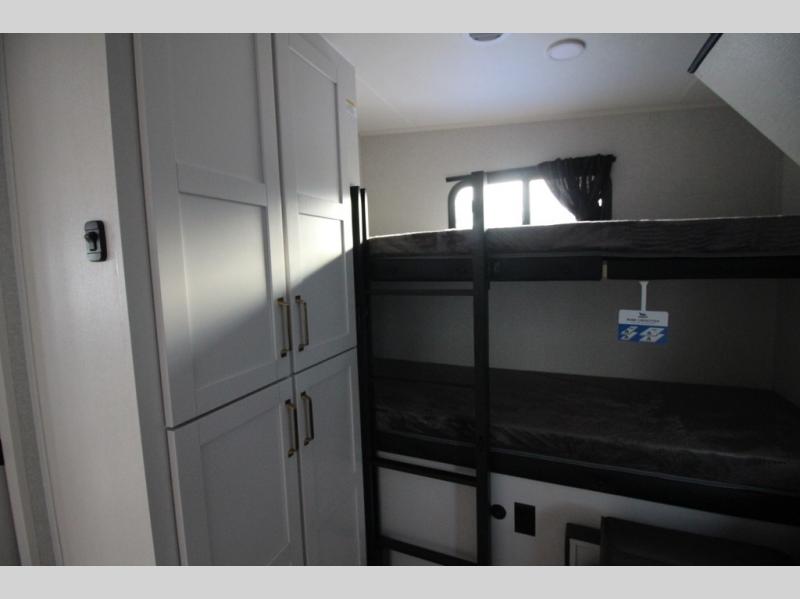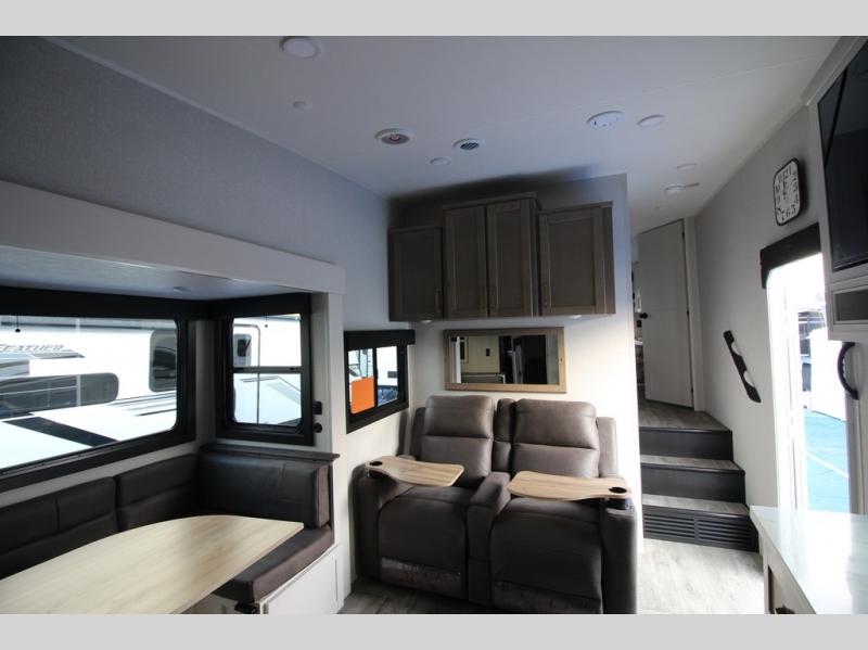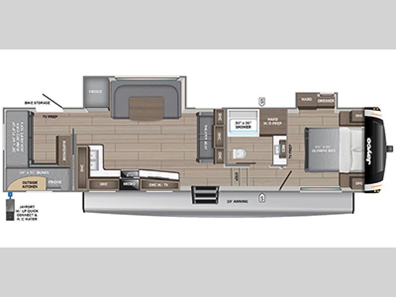 This fifth wheel is not only packed with amenities, but it can sleep up to eight people each night for fun camping trips! The rear private bunkhouse includes bunk beds plus a third bunk above a jack-knife sofa, and there is a bike storage door here so you can easily pack in gear. You can claim the front private bedroom all to yourselves with an Olympic bed, a wardrobe slide plus a second wardrobe with washer and dryer prep. Everyone can come together in the combined kitchen and living room that features a U-shaped dinette across from the TV and a theater seat for added comfort!