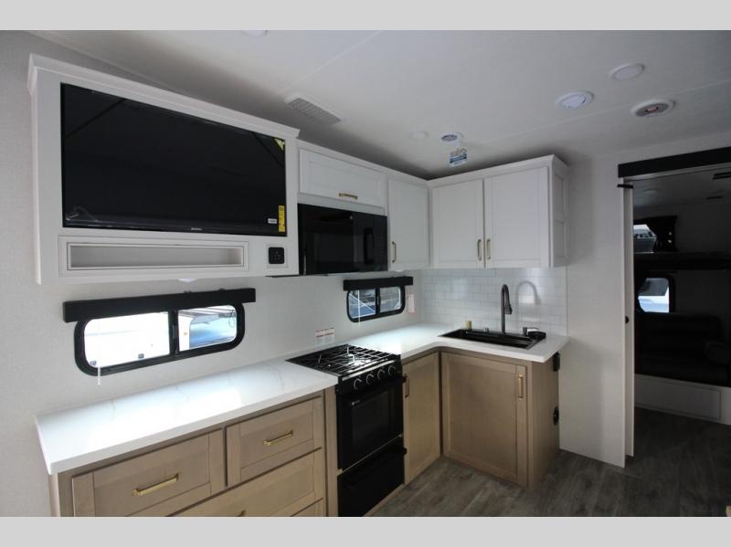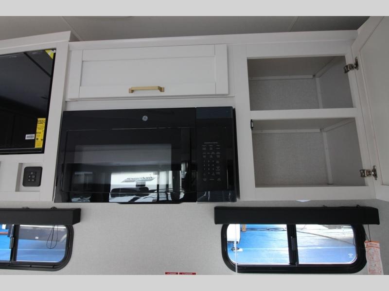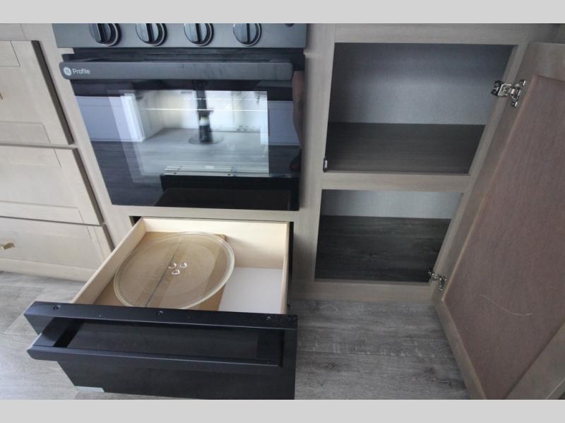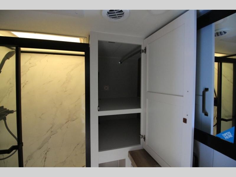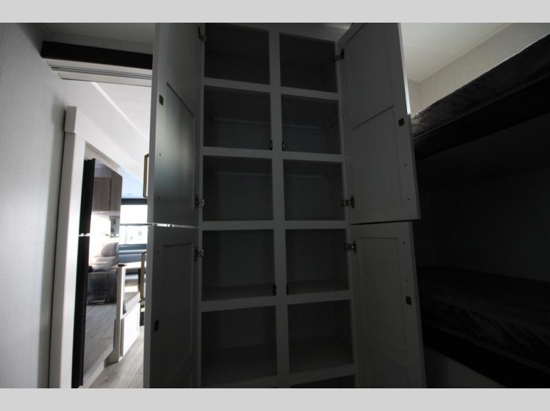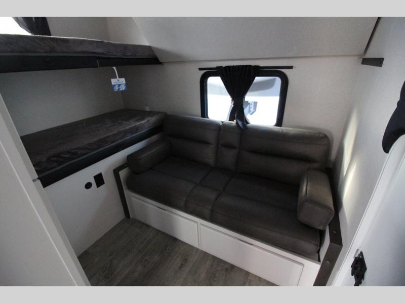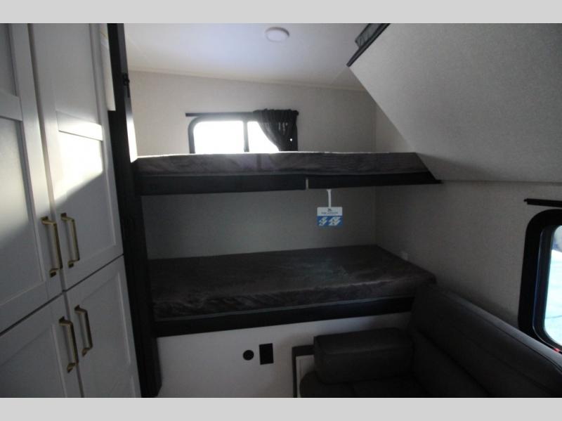 This fifth wheel is not only packed with amenities, but it can sleep up to eight people each night for fun camping trips! The rear private bunkhouse includes bunk beds plus a third bunk above a jack-knife sofa, and there is a bike storage door here so you can easily pack in gear. You can claim the front private bedroom all to yourselves with an Olympic bed, a wardrobe slide plus a second wardrobe with washer and dryer prep. Everyone can come together in the combined kitchen and living room that features a U-shaped dinette across from the TV and a theater seat for added comfort!