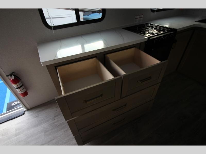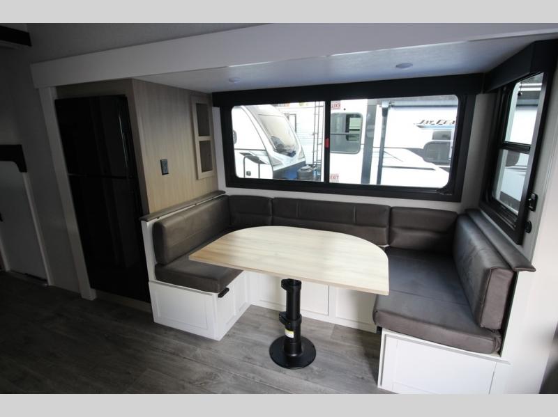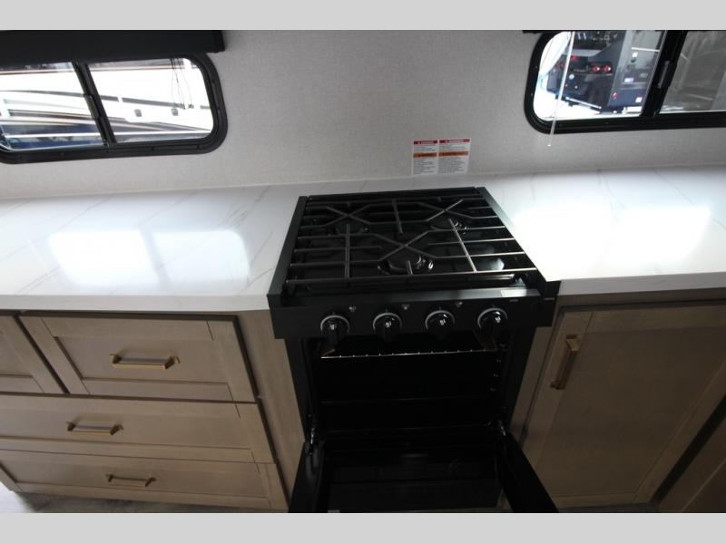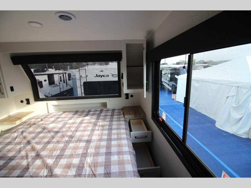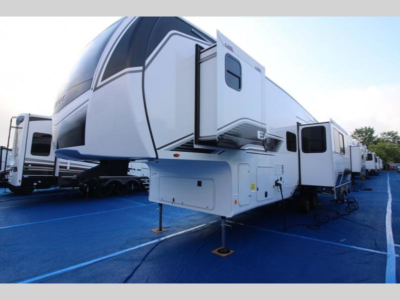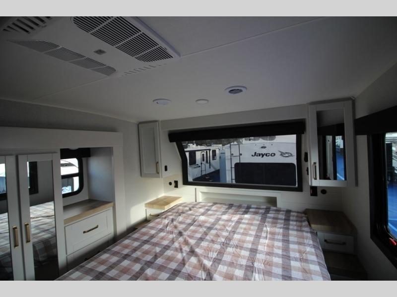 With any Eagle HT fifth wheel or travel trailer by Jayco you will enjoy a smooth drive thanks to the 4 Star Handling Package and MORryde CRE-3000 rubberized suspension. The Customer Value Package includes amenities that are sure to make camping easier than ever, like the 60K on-demand water heater, Keyed-Alike lock system, 15,000 BTU "Whisper Quiet" A/C, and more. Handcrafted door/drawer fronts will make your space feel more like home, along with residential vinyl flooring throughout, GE appliances, and blackout roller shades with reflective side throughout to keep the sun out when you want to sleep in. Each model also includes a NuVo H2O water treatment system with filters included, interior and exterior "Blue Sync" audio connect with MB Quart Sound for your TV and phone, and 100% no floor vents for added comfort and convenience!