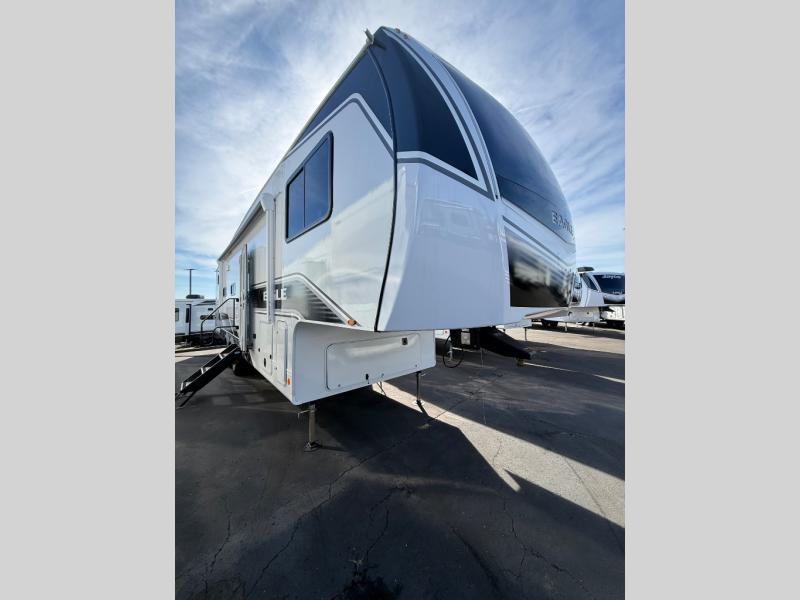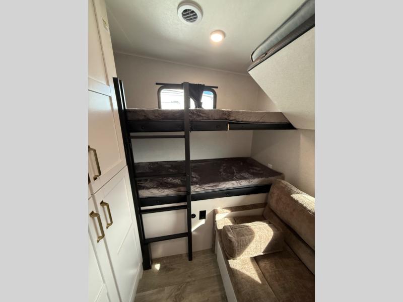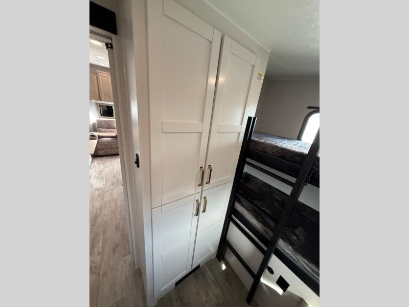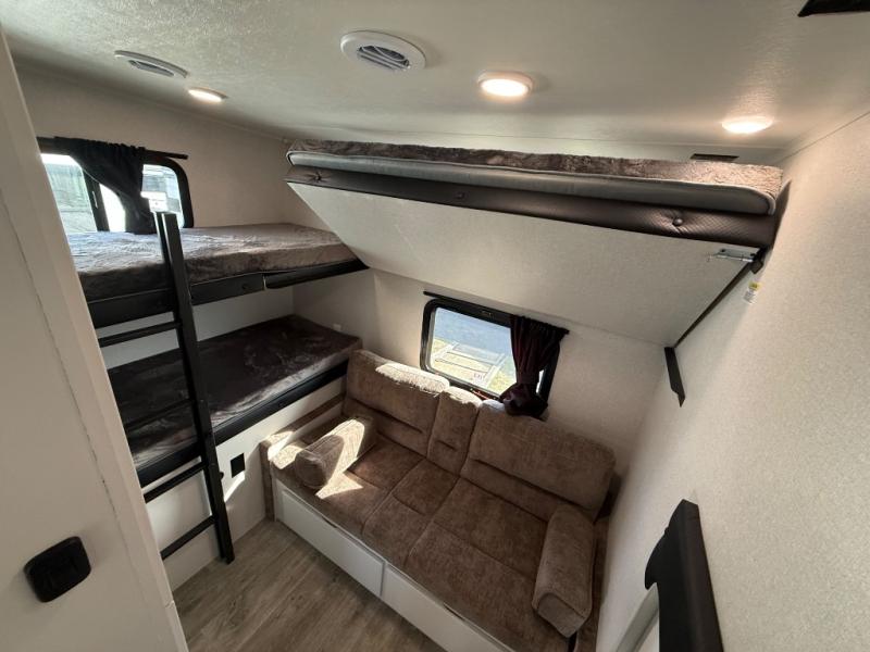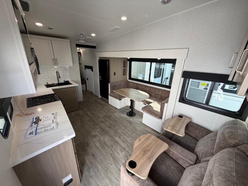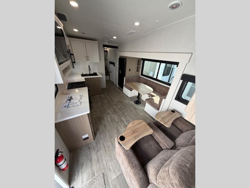 This fifth wheel is not only packed with amenities, but it can sleep up to eight people each night for fun camping trips! The rear private bunkhouse includes bunk beds plus a third bunk above a jack-knife sofa, and there is a bike storage door here so you can easily pack in gear. You can claim the front private bedroom all to yourselves with an Olympic bed, a wardrobe slide plus a second wardrobe with washer and dryer prep. Everyone can come together in the combined kitchen and living room that features a U-shaped dinette across from the TV and a theater seat for added comfort!