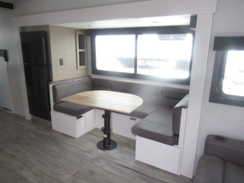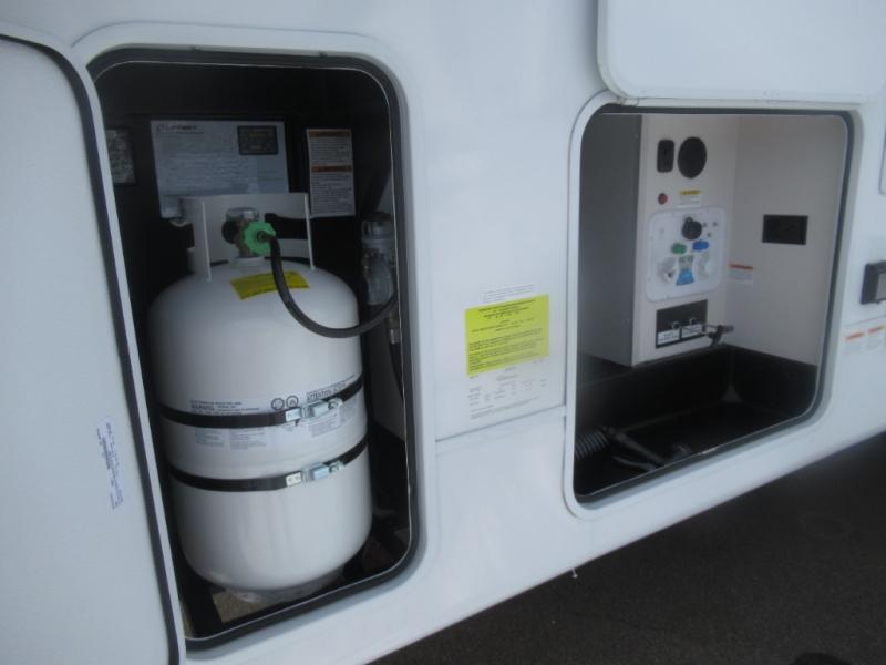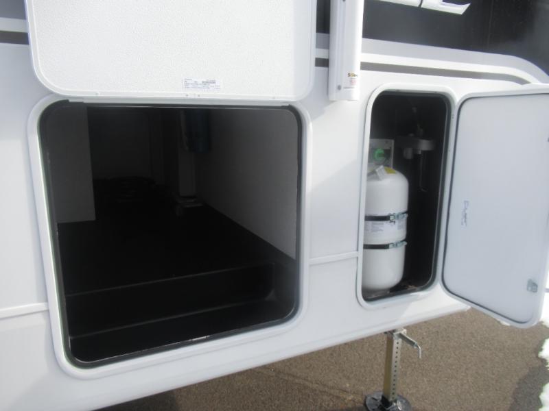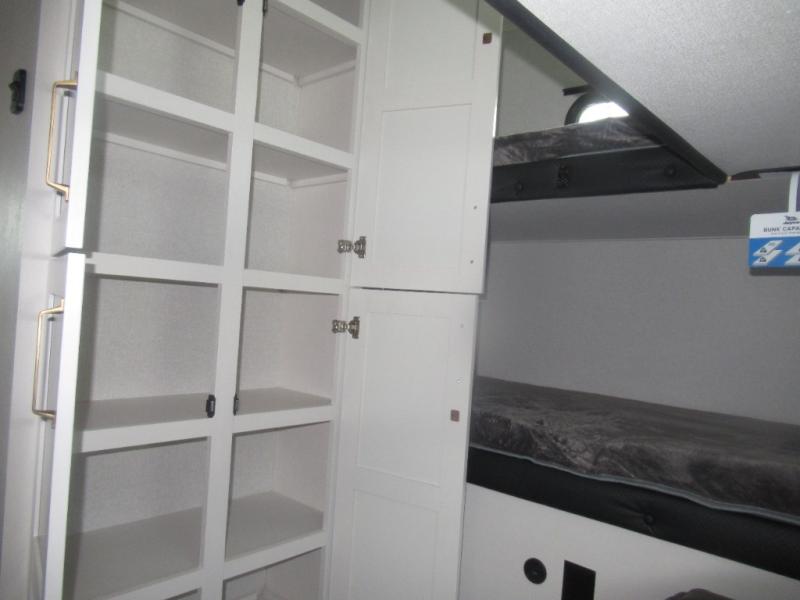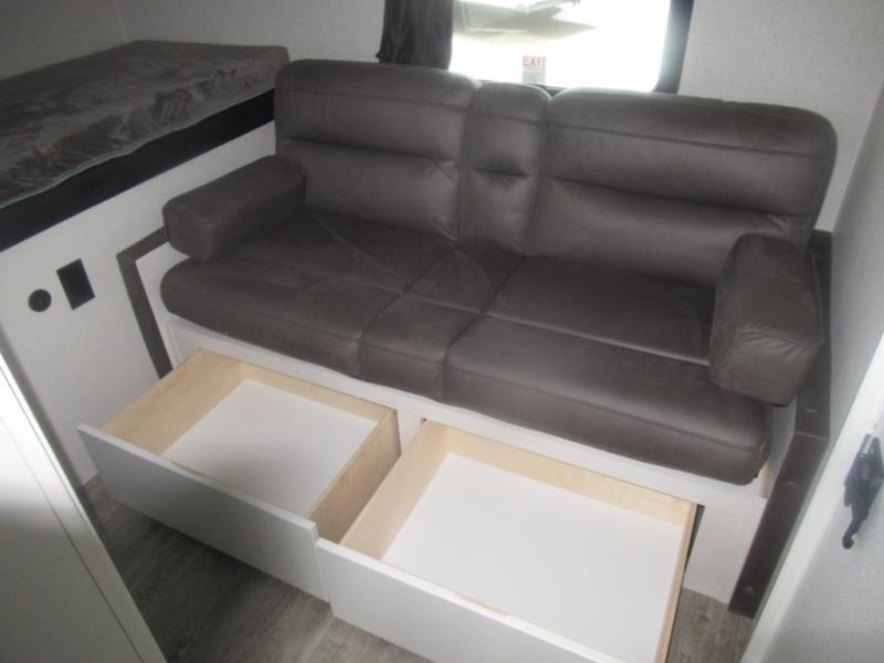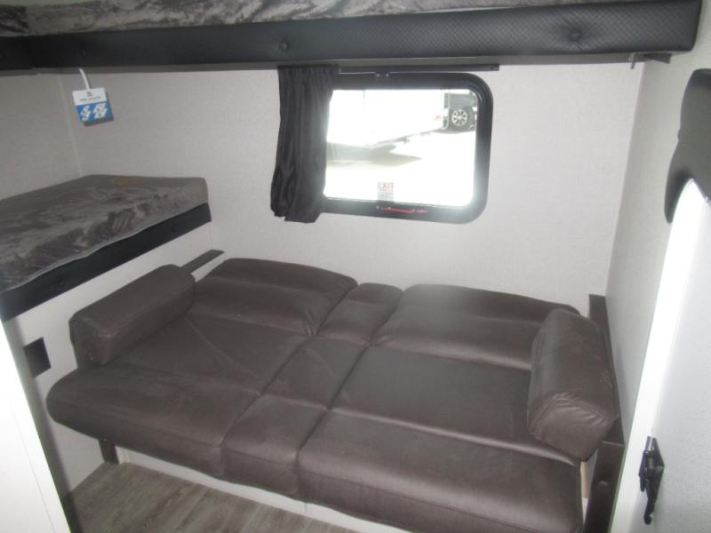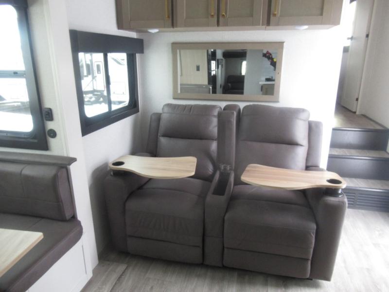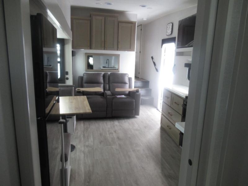 This fifth wheel is not only packed with amenities, but it can sleep up to eight people each night for fun camping trips! The rear private bunkhouse includes bunk beds plus a third bunk above a jack-knife sofa, and there is a bike storage door here so you can easily pack in gear. You can claim the front private bedroom all to yourselves with an Olympic bed, a wardrobe slide plus a second wardrobe with washer and dryer prep. Everyone can come together in the combined kitchen and living room that features a U-shaped dinette across from the TV and a theater seat for added comfort!