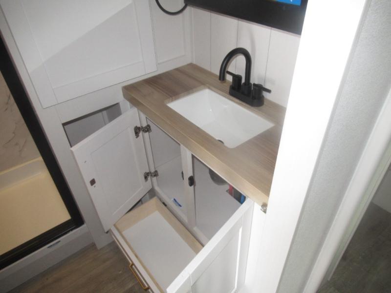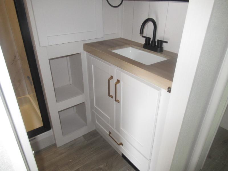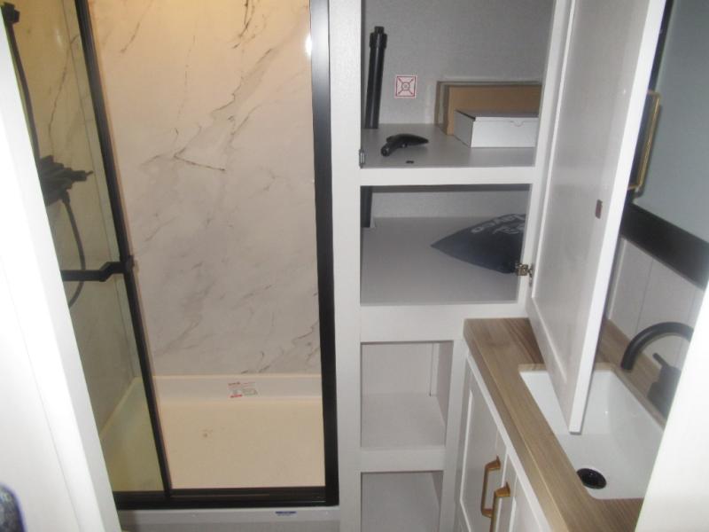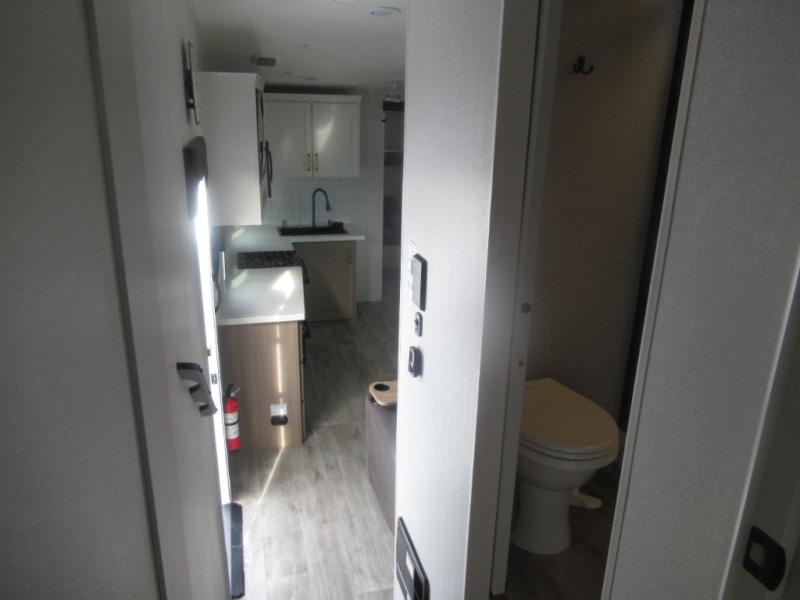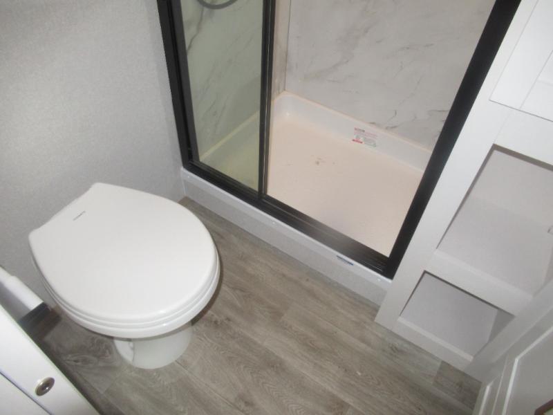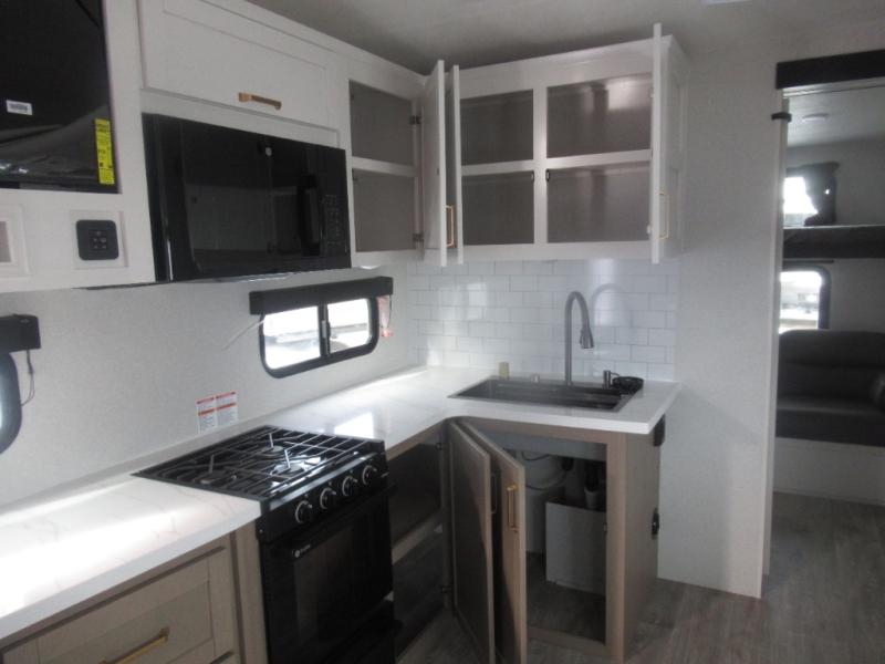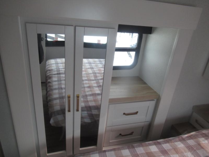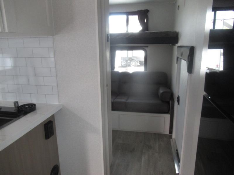 This fifth wheel is not only packed with amenities, but it can sleep up to eight people each night for fun camping trips! The rear private bunkhouse includes bunk beds plus a third bunk above a jack-knife sofa, and there is a bike storage door here so you can easily pack in gear. You can claim the front private bedroom all to yourselves with an Olympic bed, a wardrobe slide plus a second wardrobe with washer and dryer prep. Everyone can come together in the combined kitchen and living room that features a U-shaped dinette across from the TV and a theater seat for added comfort!
